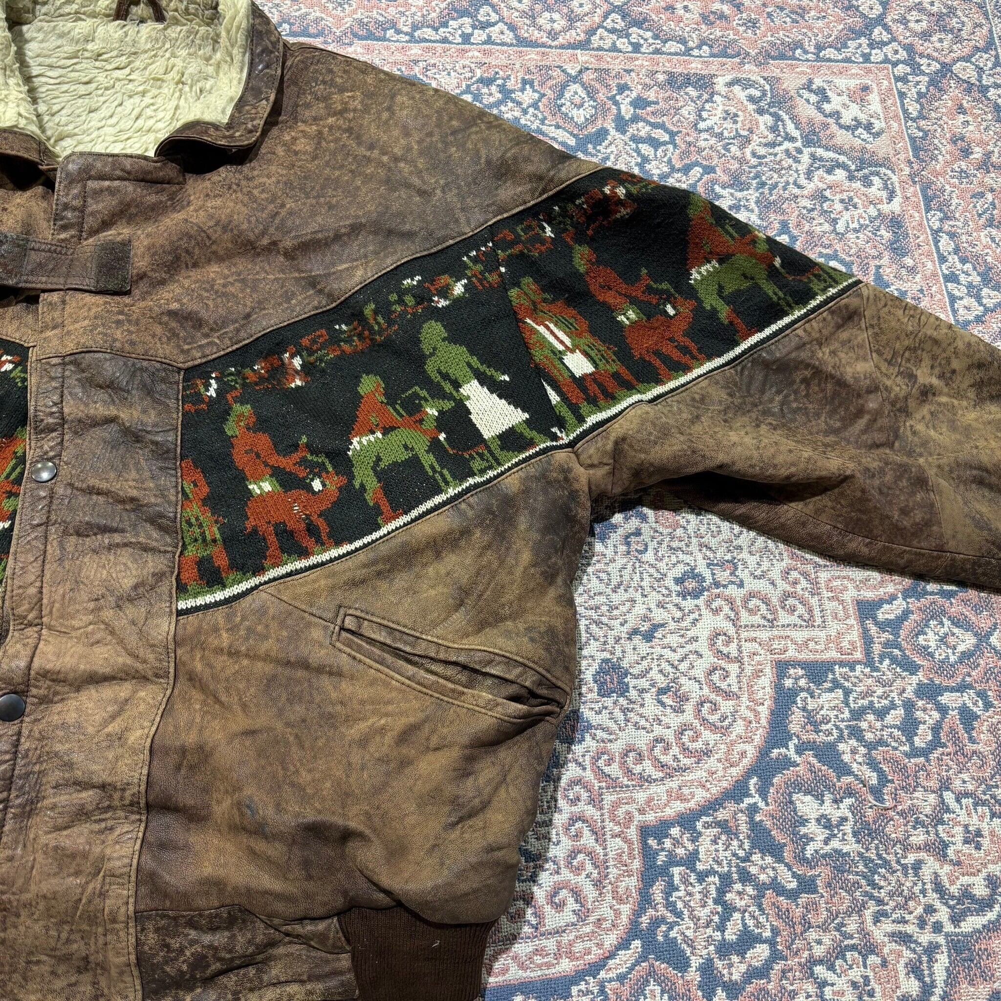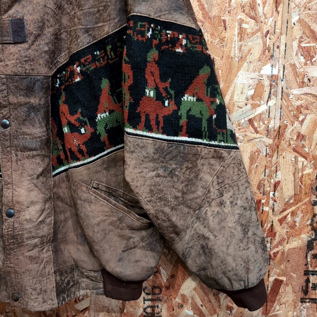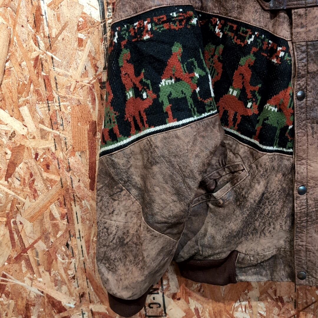 852 90s 90年代 ネイティブ柄 レザー ニット コンビ ジャケット 裏ボア 民族 古着 メンズ vintage グットレギュラー