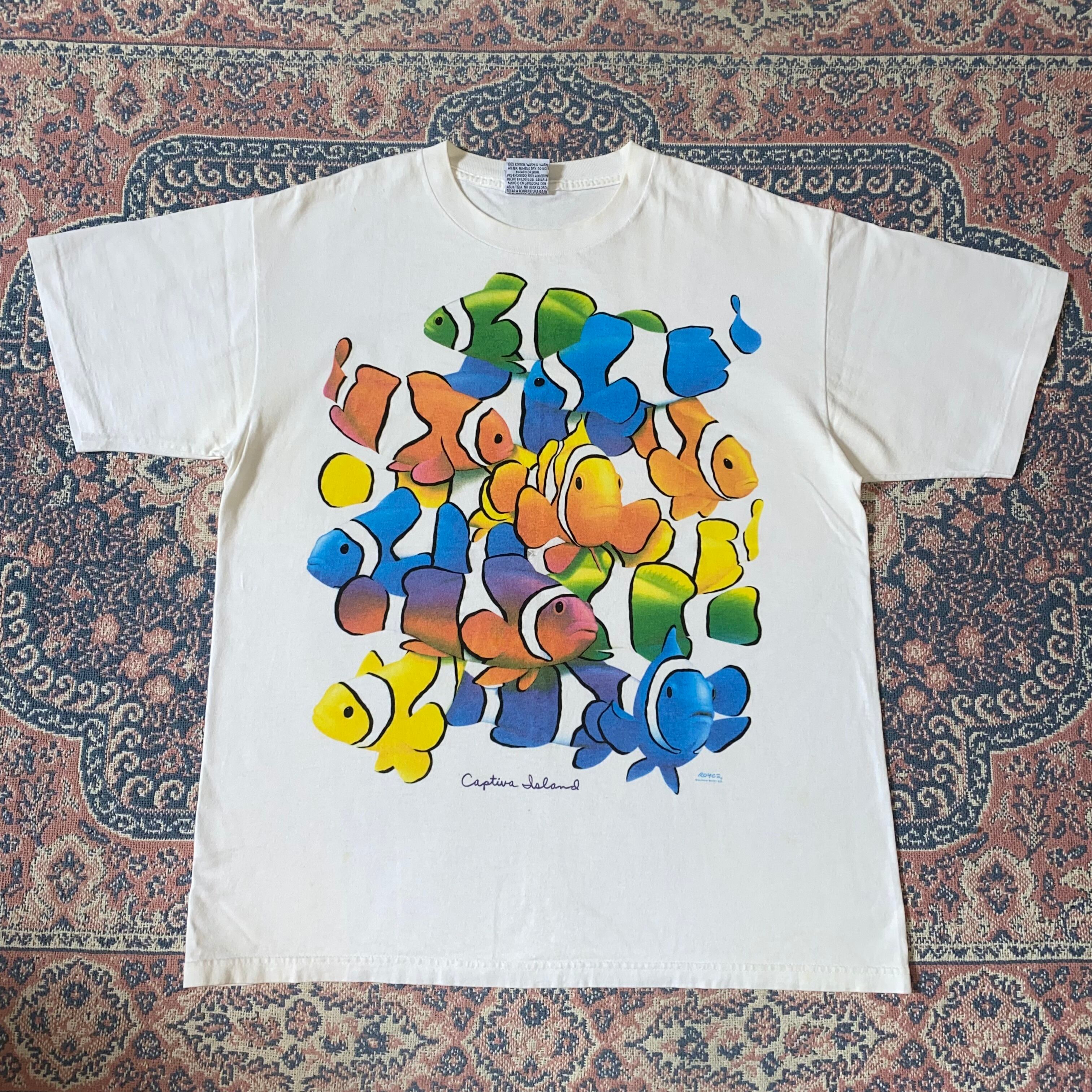 1091 90s 90年代 DOLPHIN USA製 カクレクマノミ 大判 プリント Tシャツ シングルステッチ 魚柄 アニマル ホワイト 白 古着 メンズ vintage L