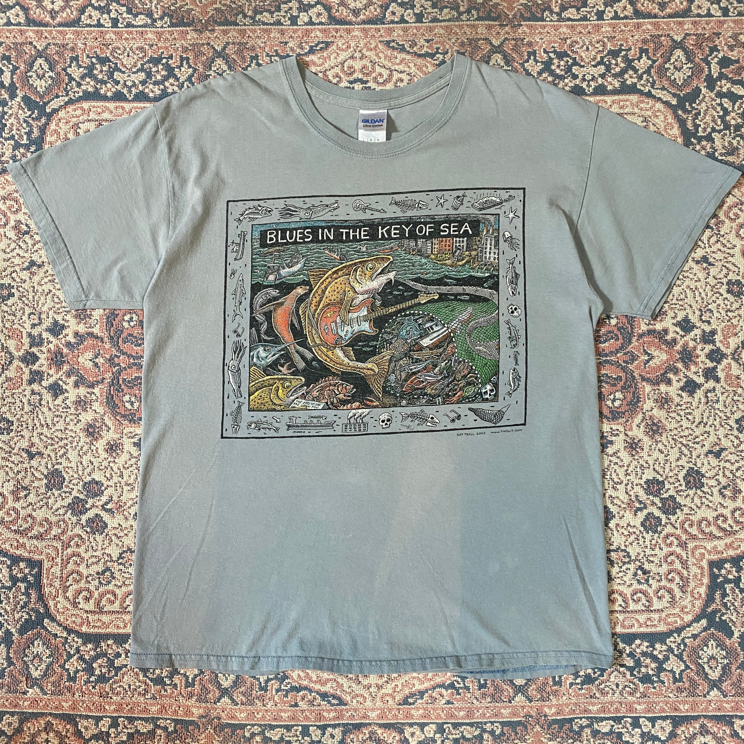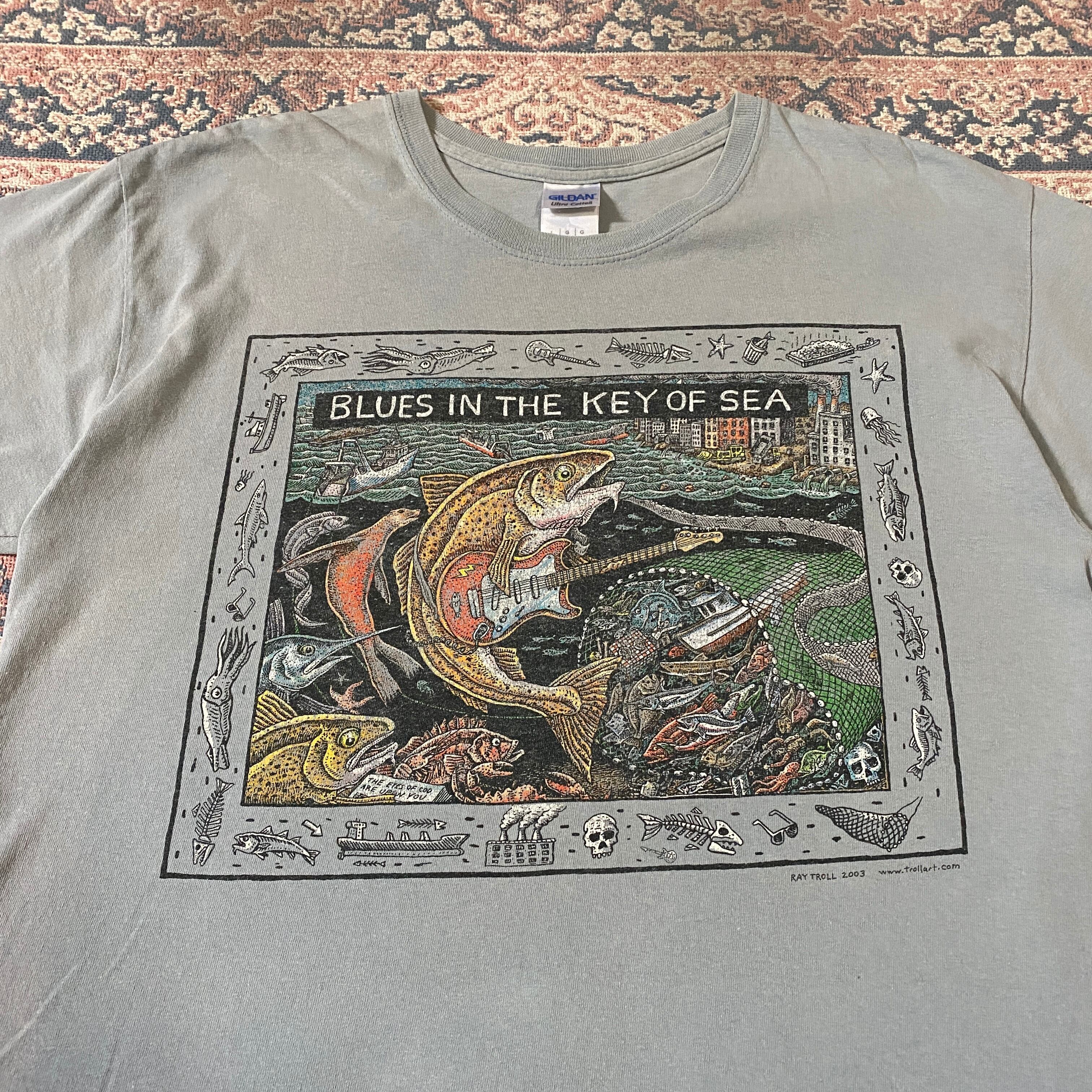 1155 00s 2000年代 GILDAN Haiti製 Blues in the Key of Sea 音楽×魚Tシャツ メンズ 古着 vintage