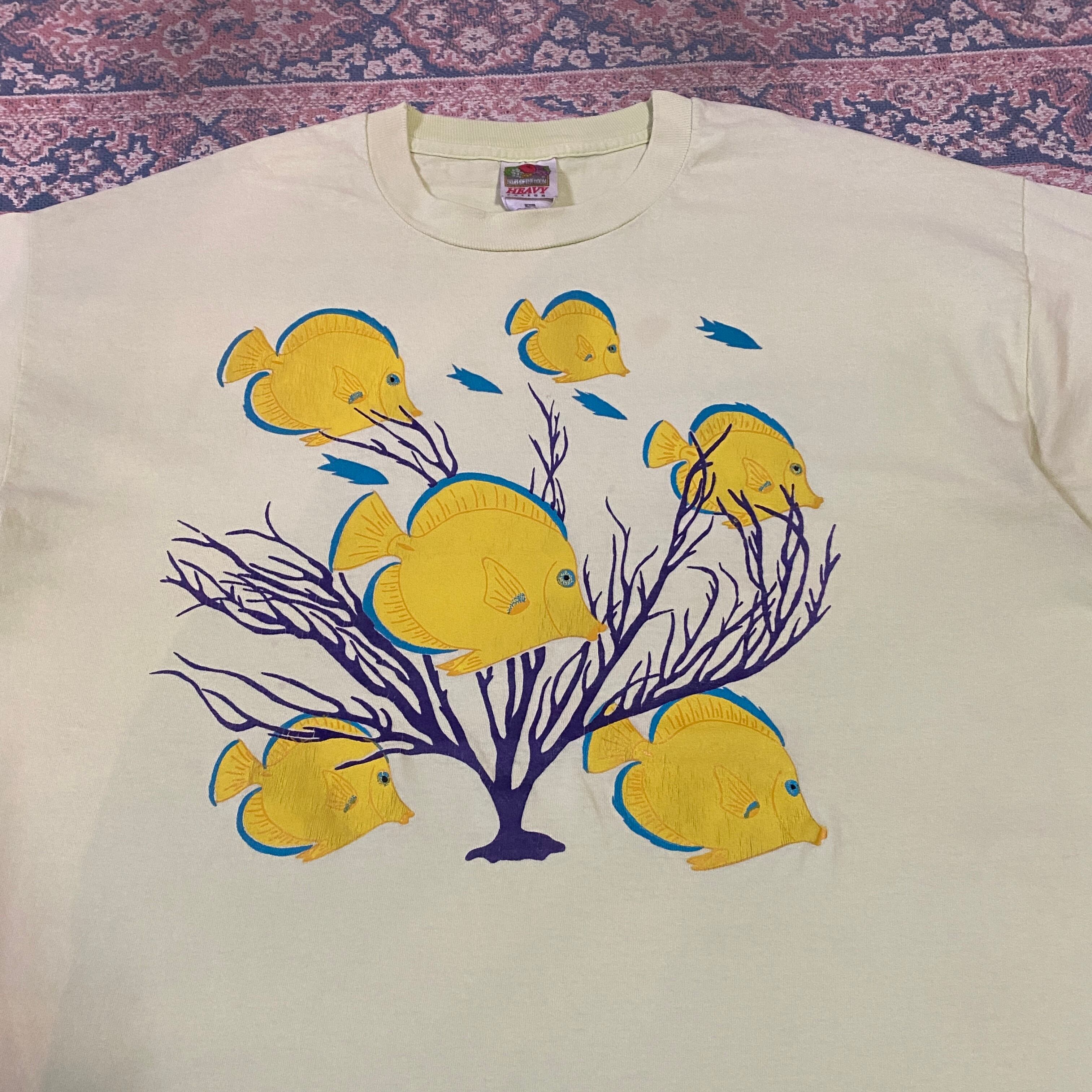 1157 90s 90年代 Fruit of the Loom 魚プリント アクアTシャツ パステルイエロー メンズ 古着 vintage