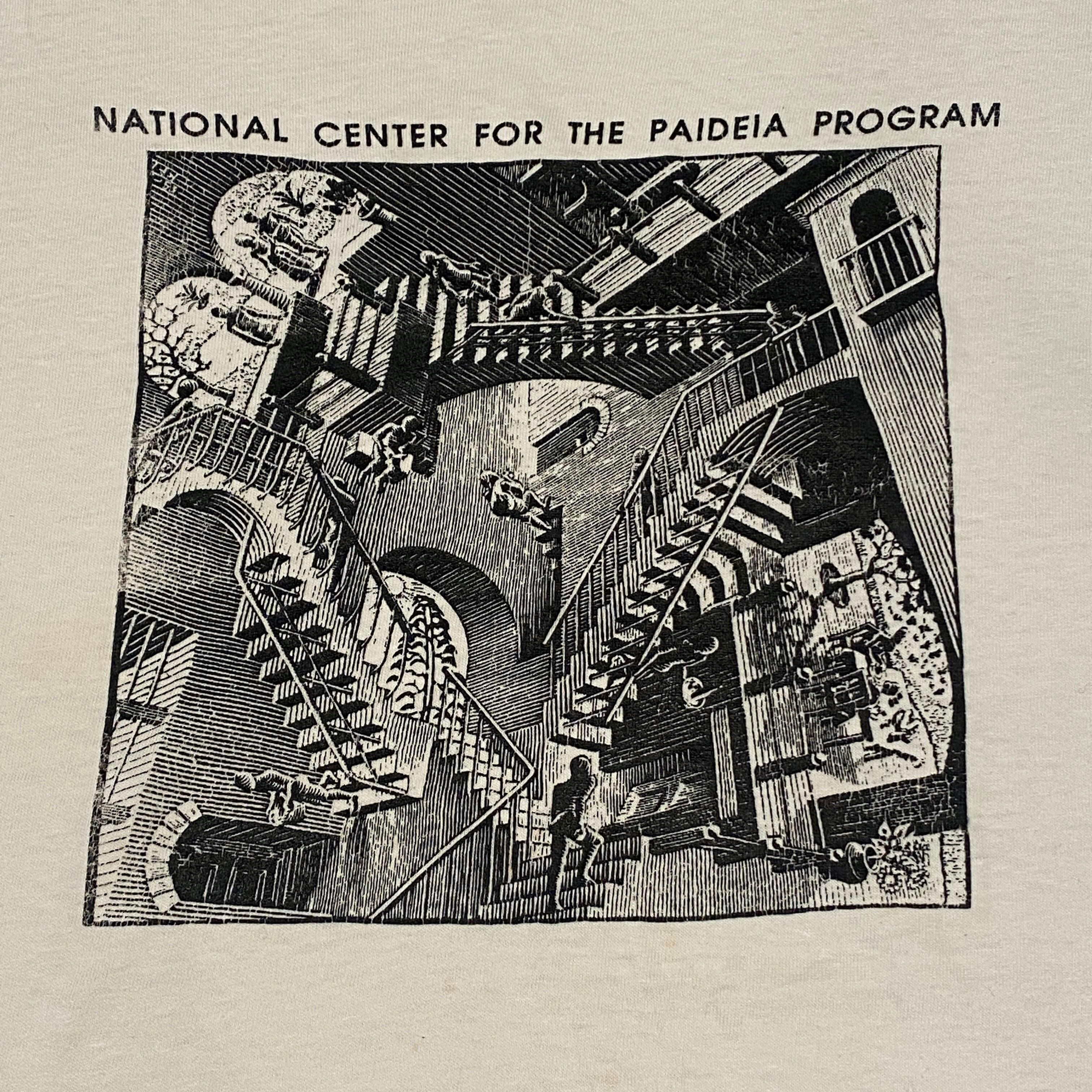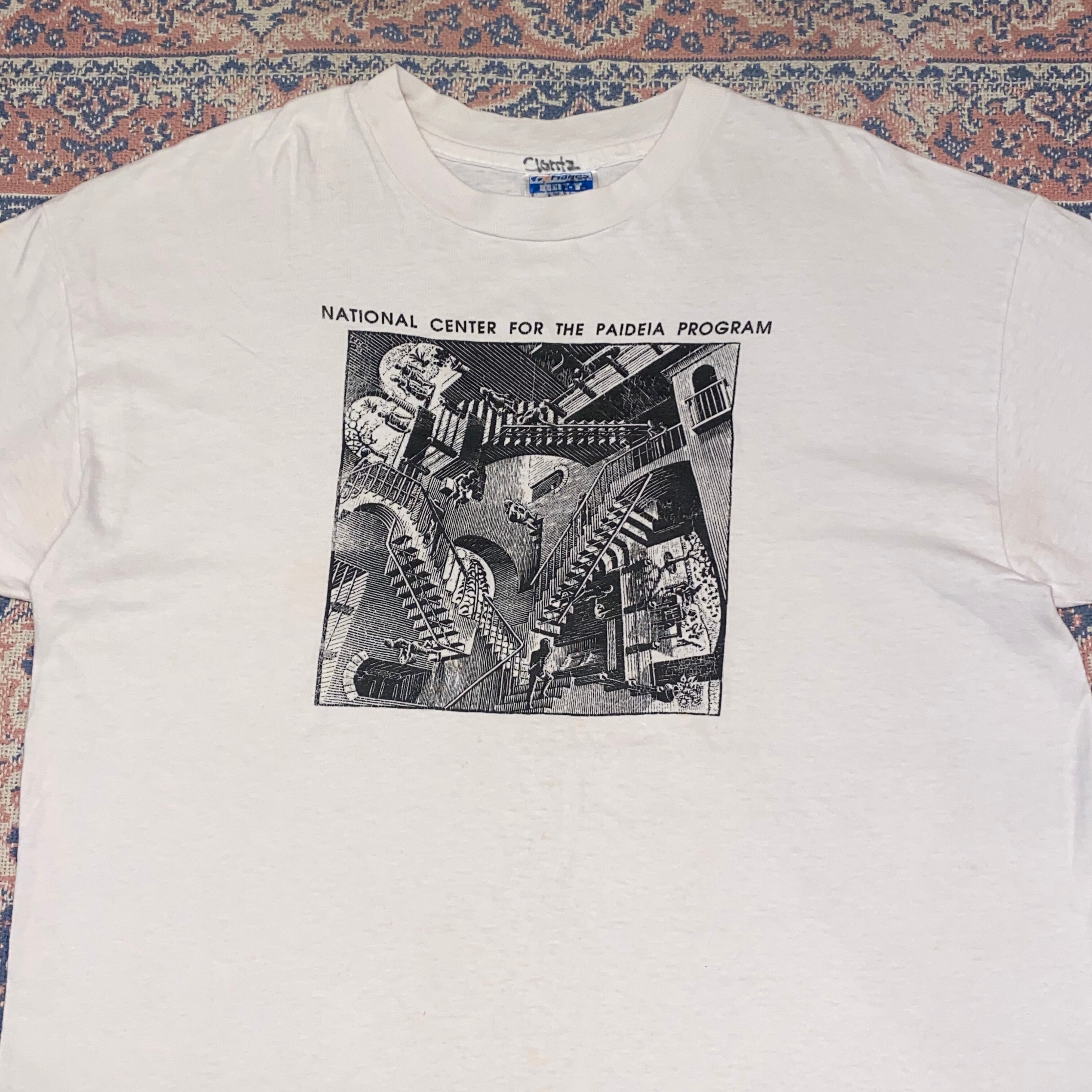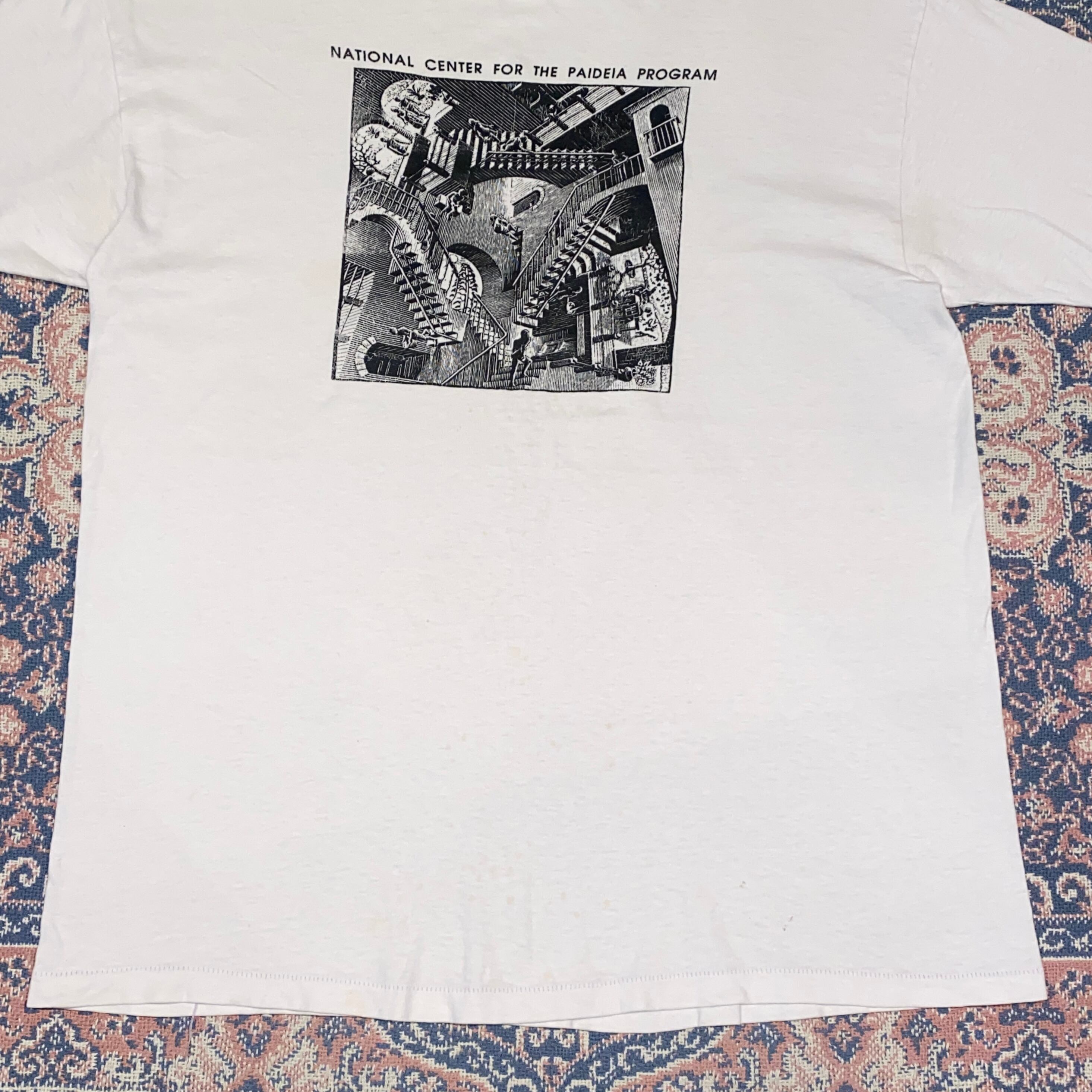 1237 80s〜 80年代 M.C.ESHER エッシャー USA製 騙し絵 プリント Tシャツ シングスステッチ 相対性 ホワイト 白 アート 古着 メンズ vintage XL