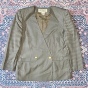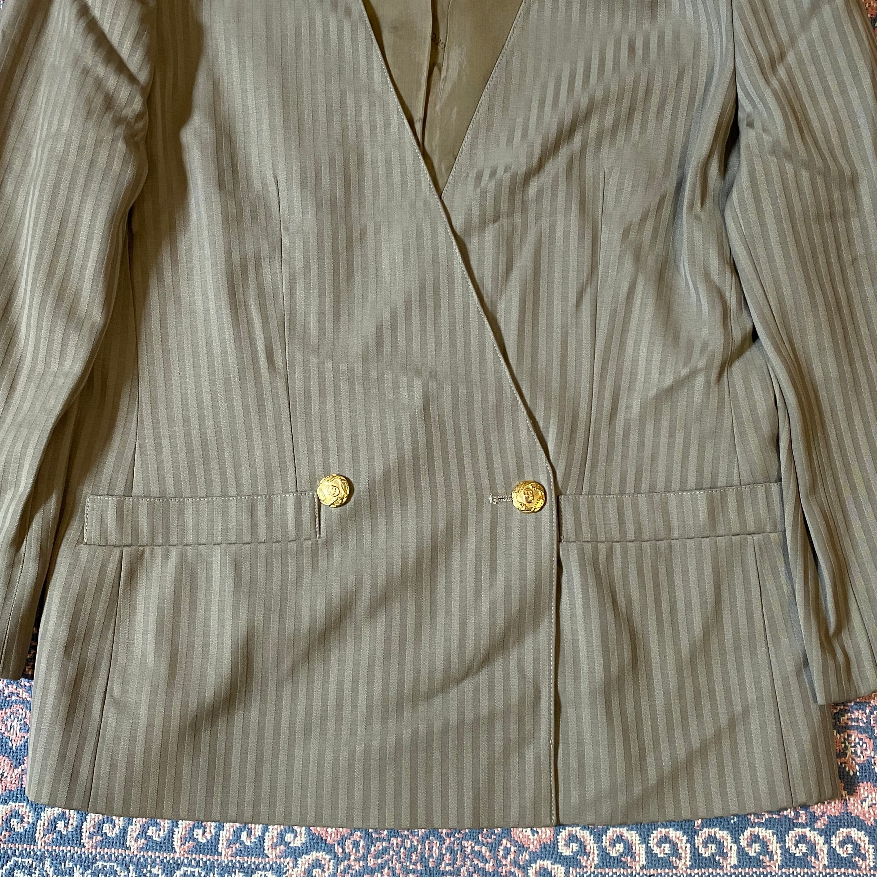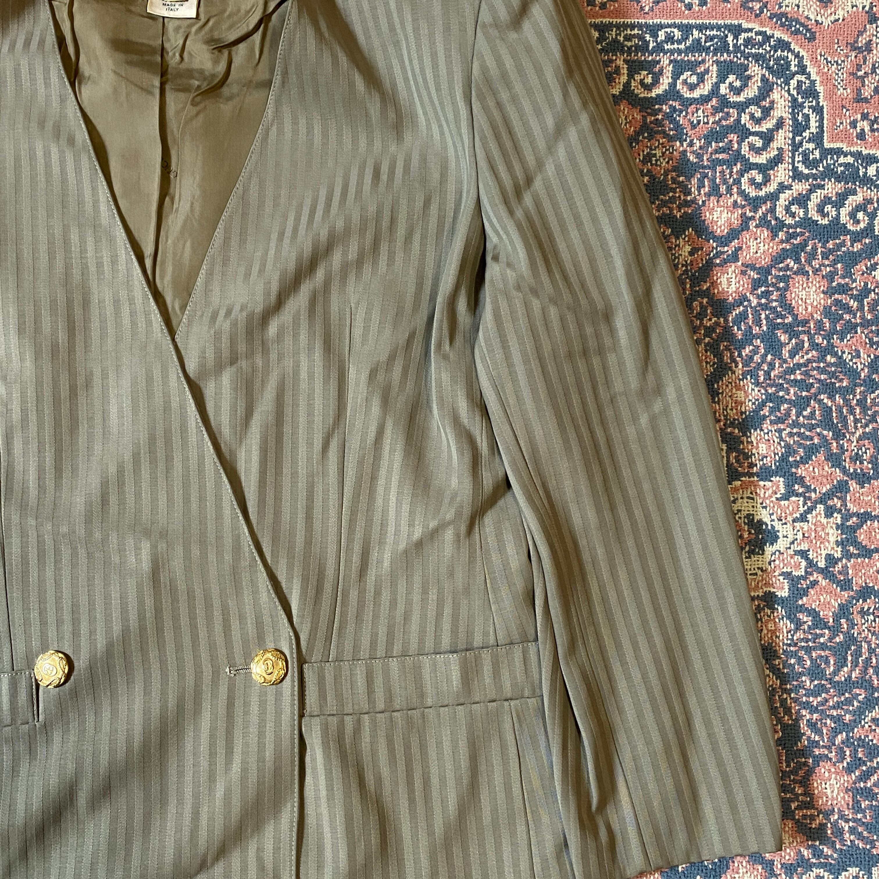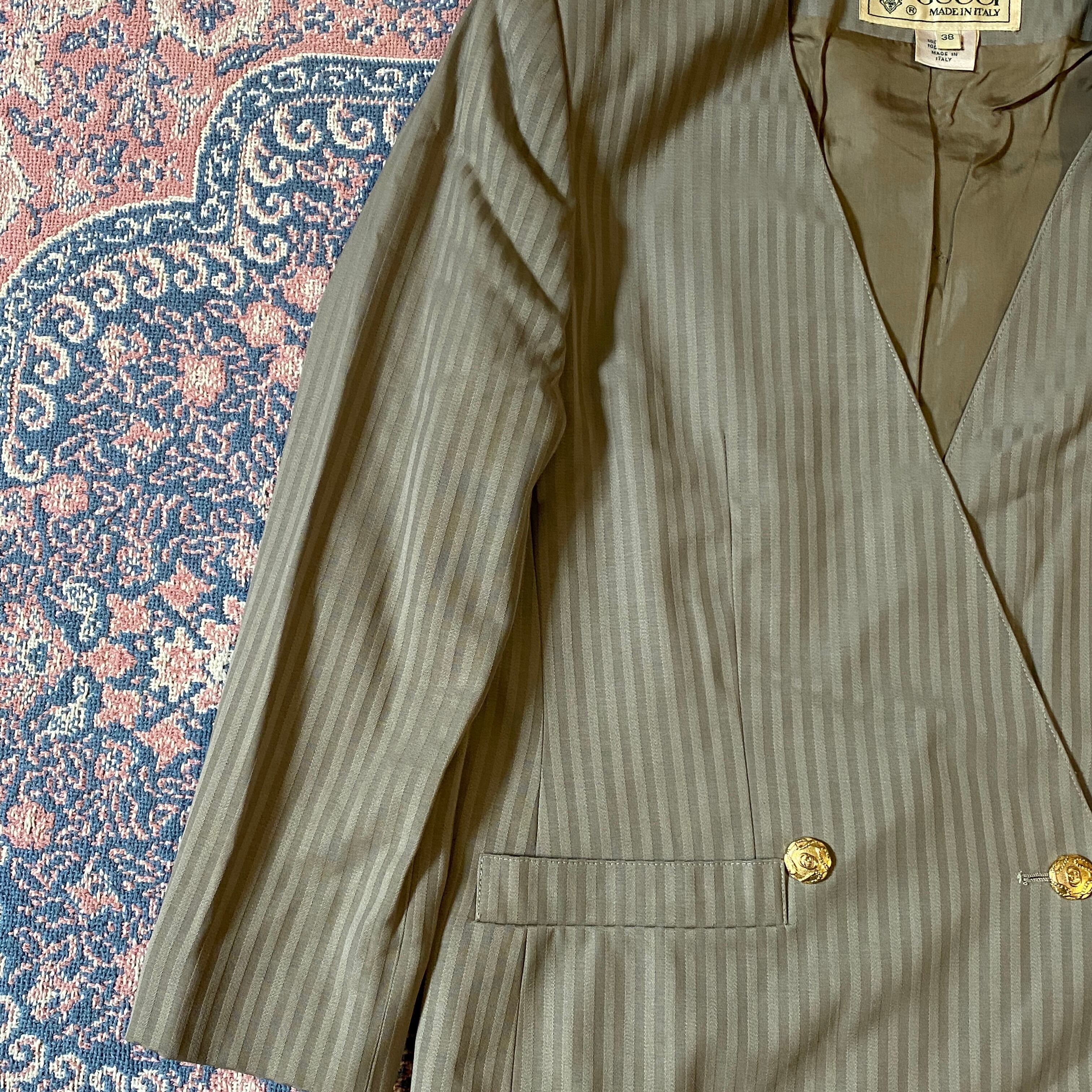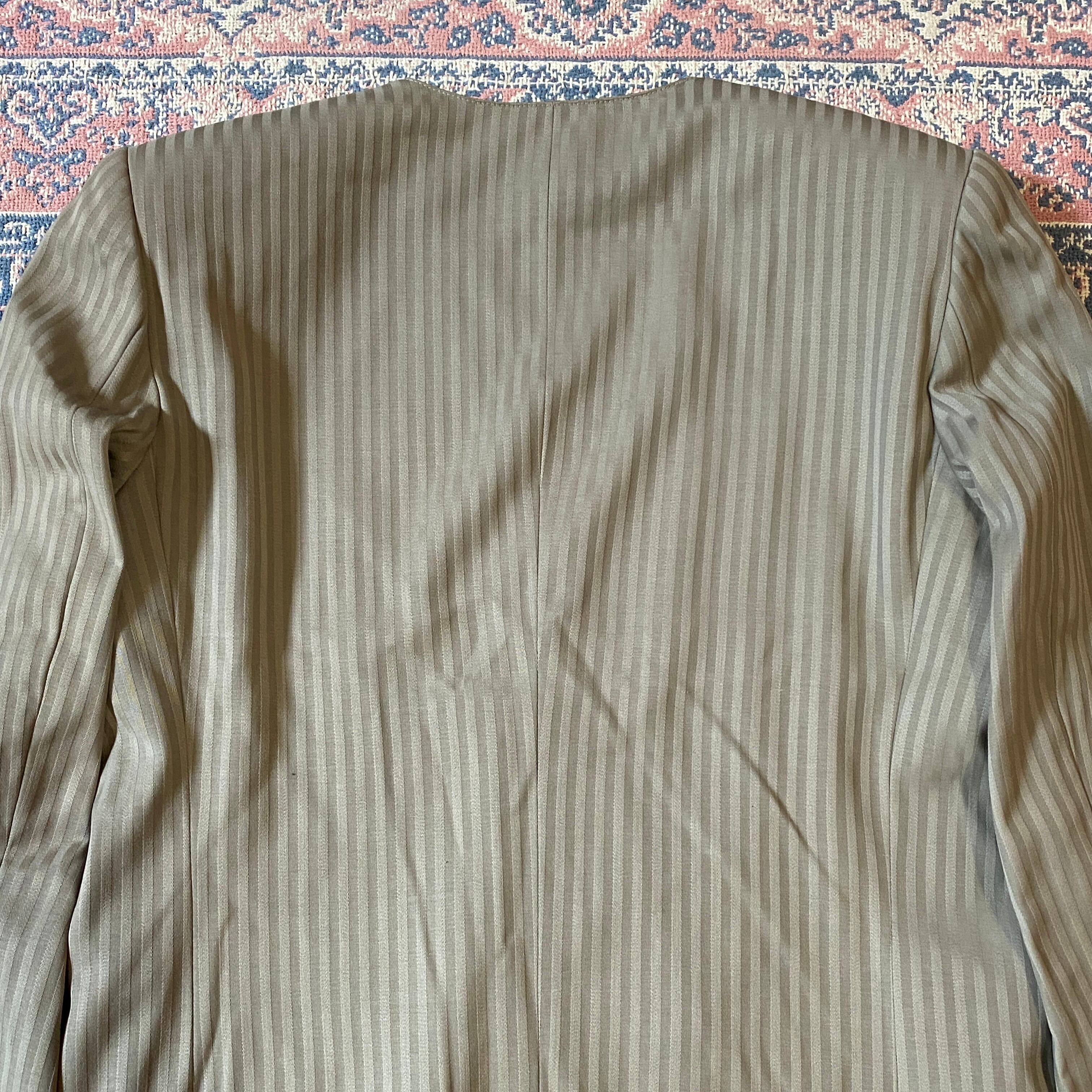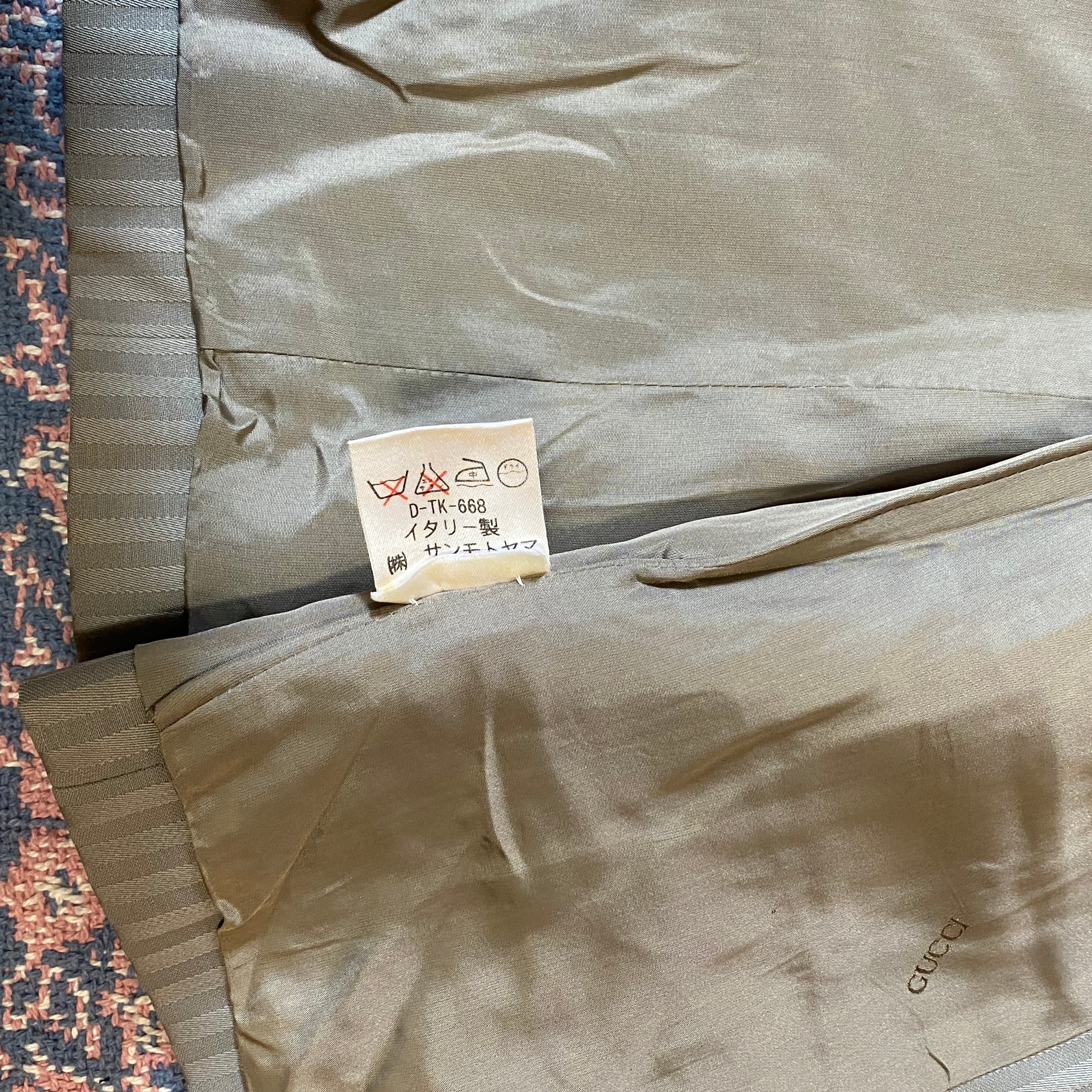 1277 80s 80年代 OLD GUCCI スーツ ノーカラー オールド グッチ ダブル ジャケット ストライプ カーキ 古着 メンズ vintage イタリア製
