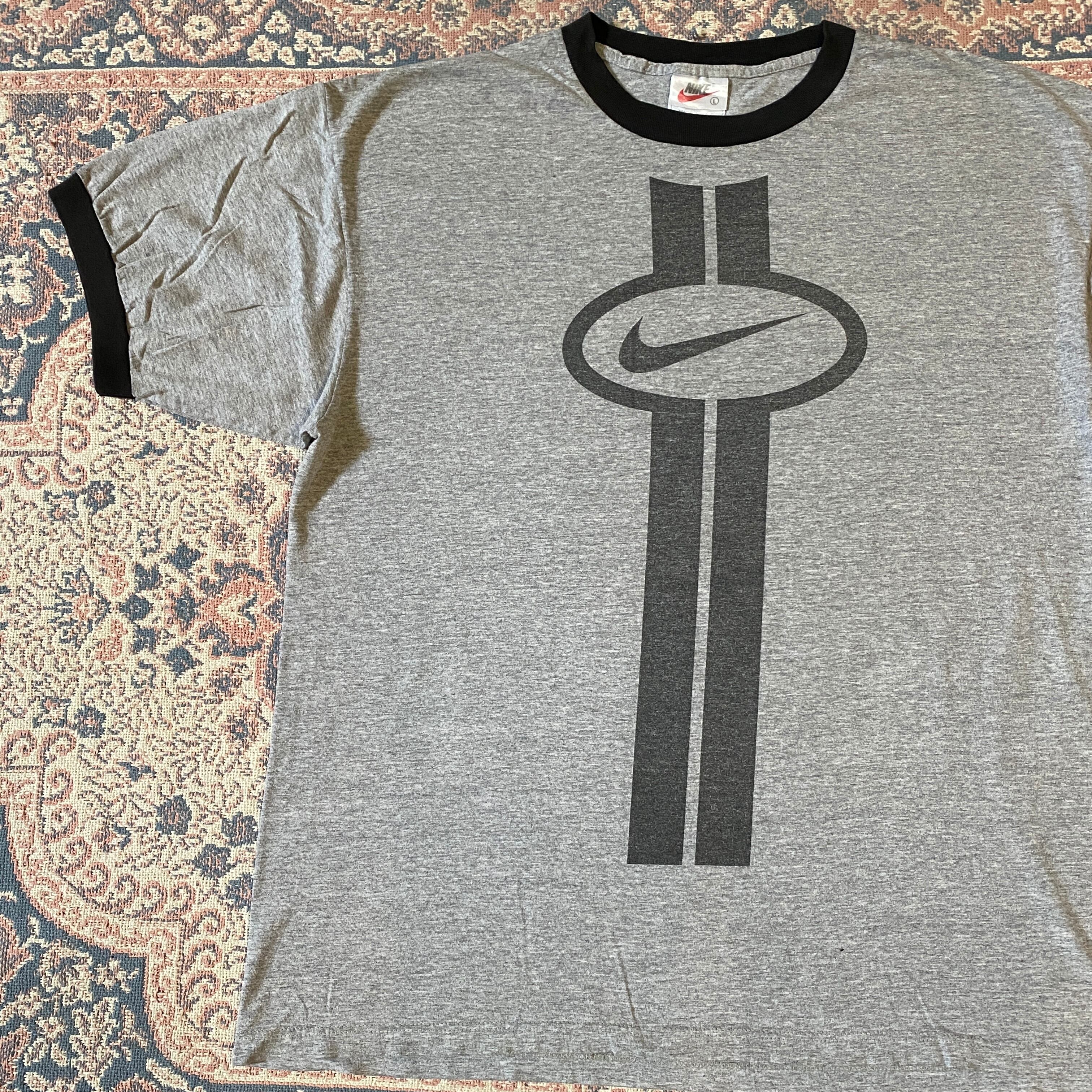 1316 90s 90年代 NIKE USA製 リンガー Tシャツ ナイキ グレー y2k ビッグ スウォッシュ 古着 メンズ vintage L
