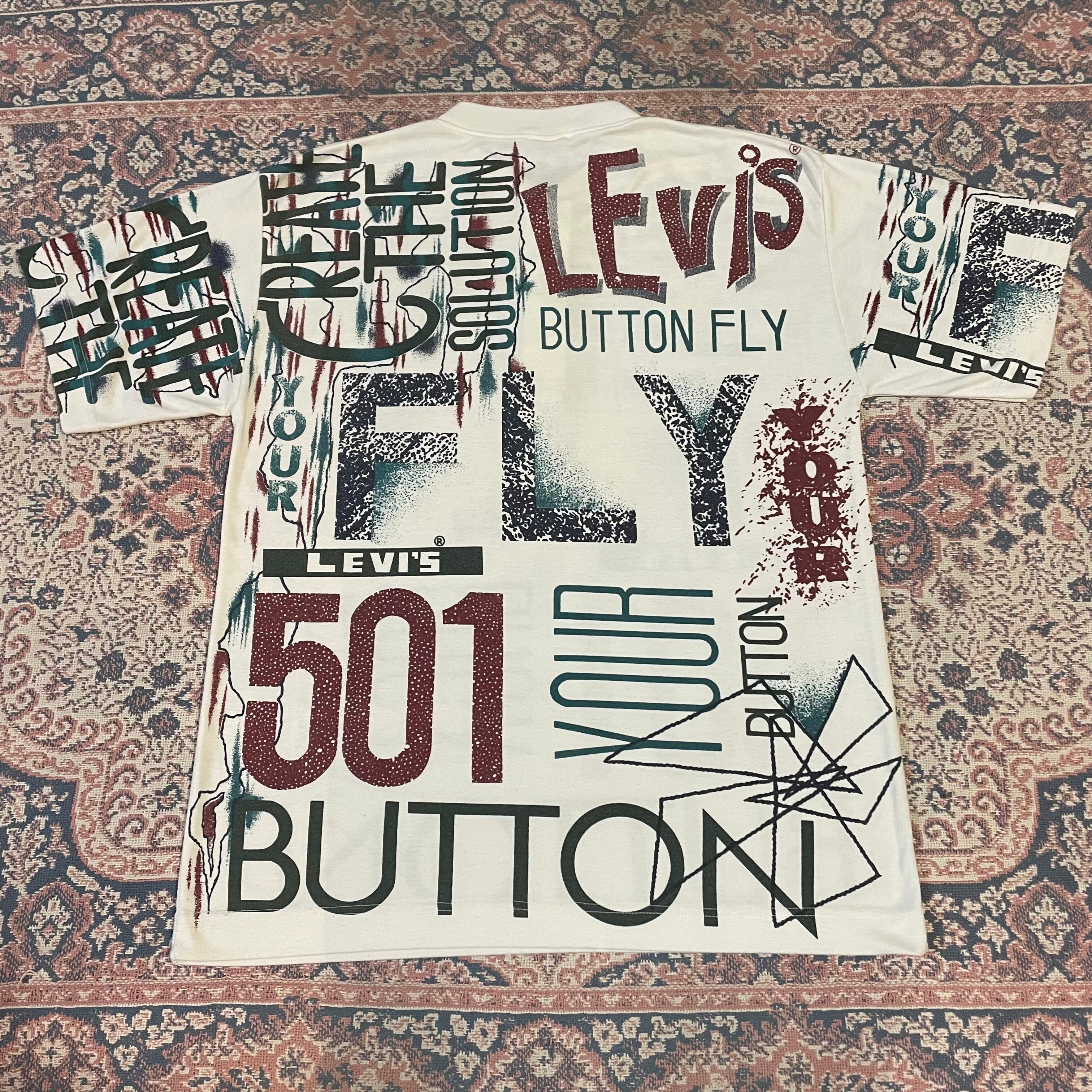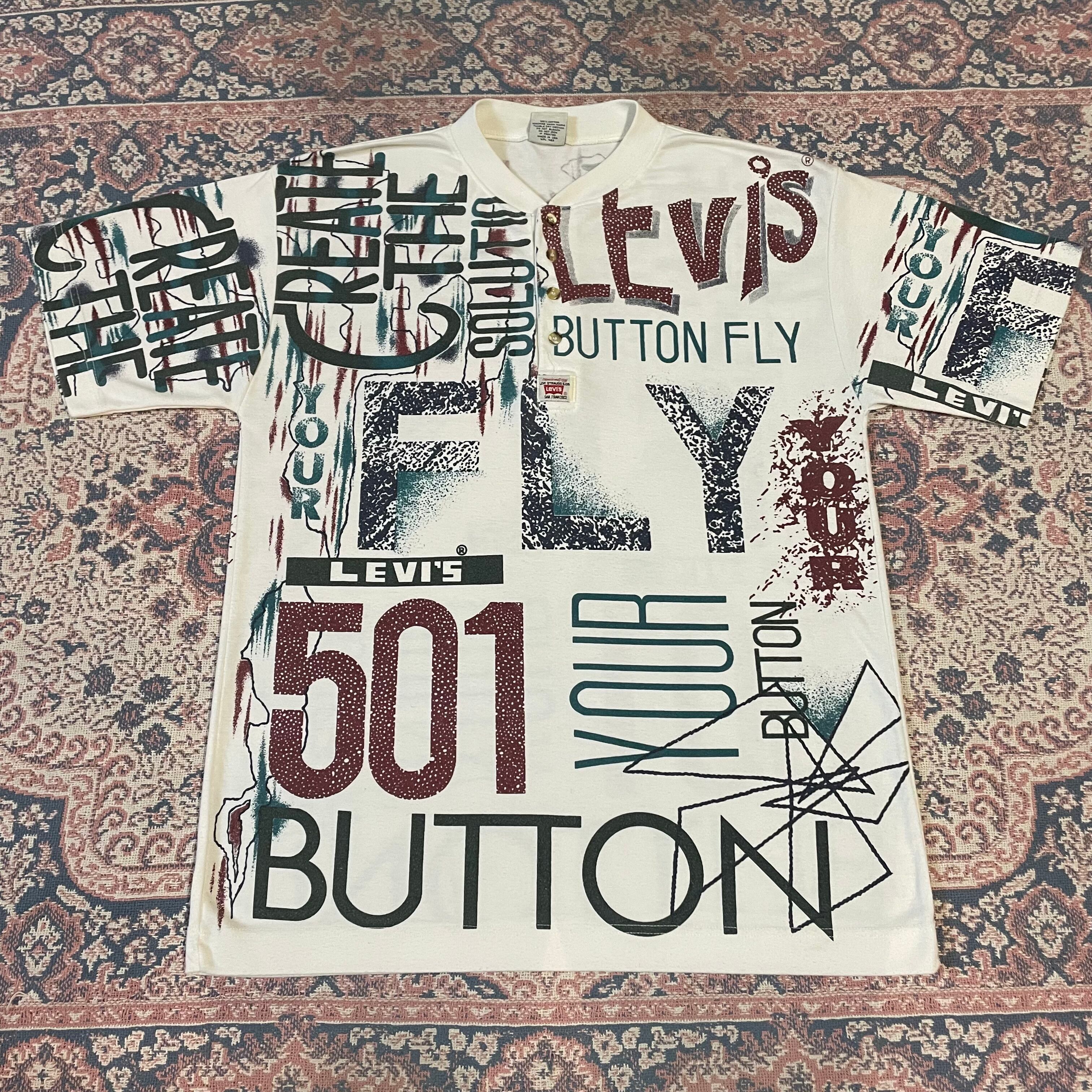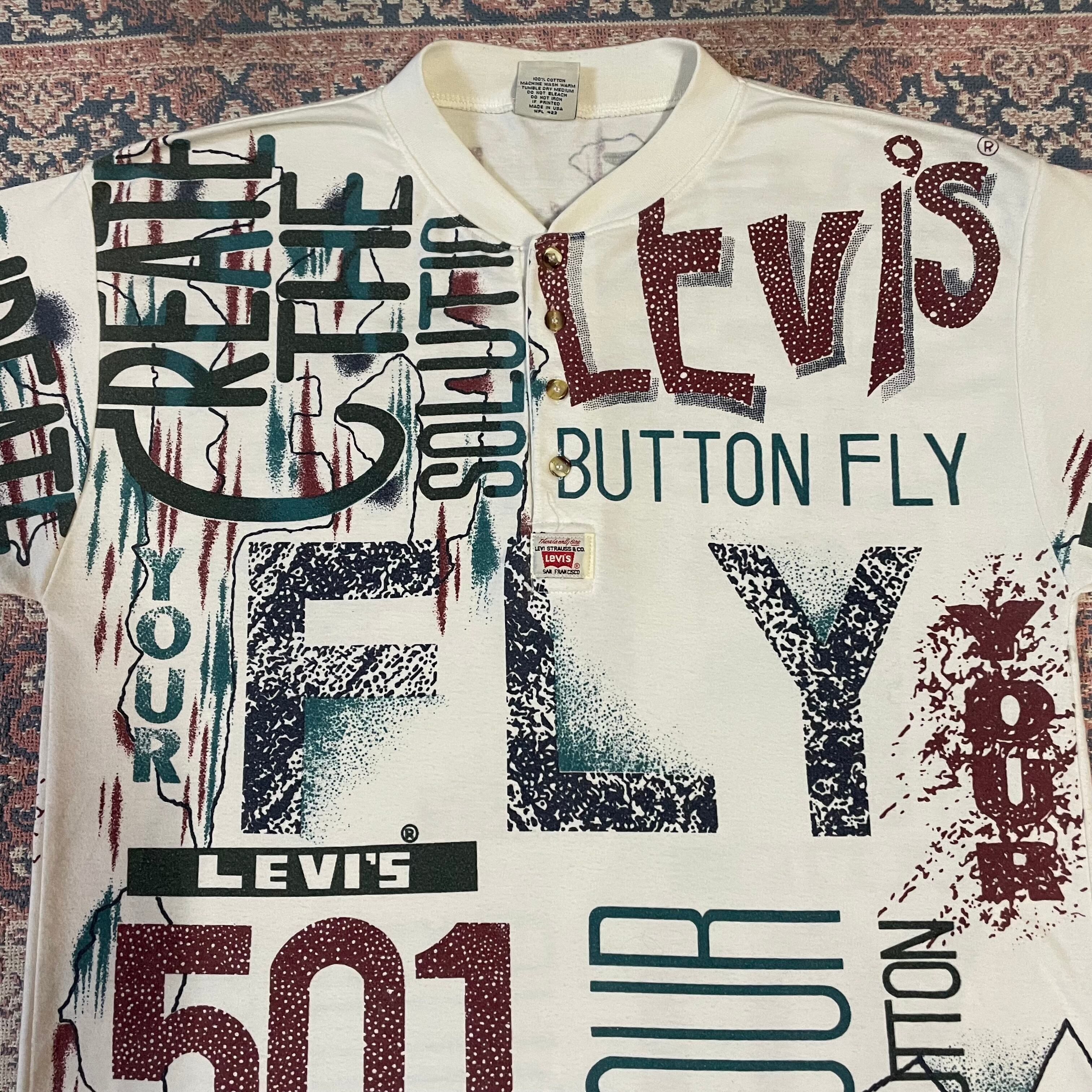 1543 90s 90年代 USA製 Levis 501 総柄 Tシャツ ハーフボタン リーバイス メンズ 古着 vintage デザイン 両面プリント