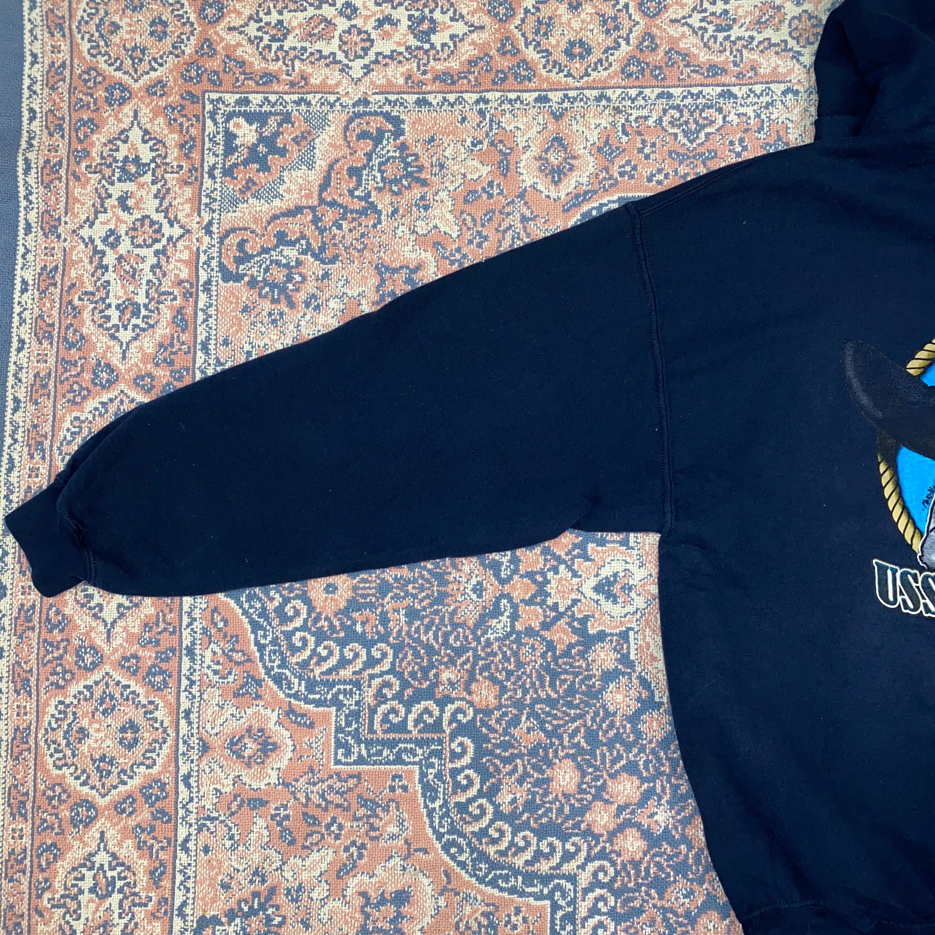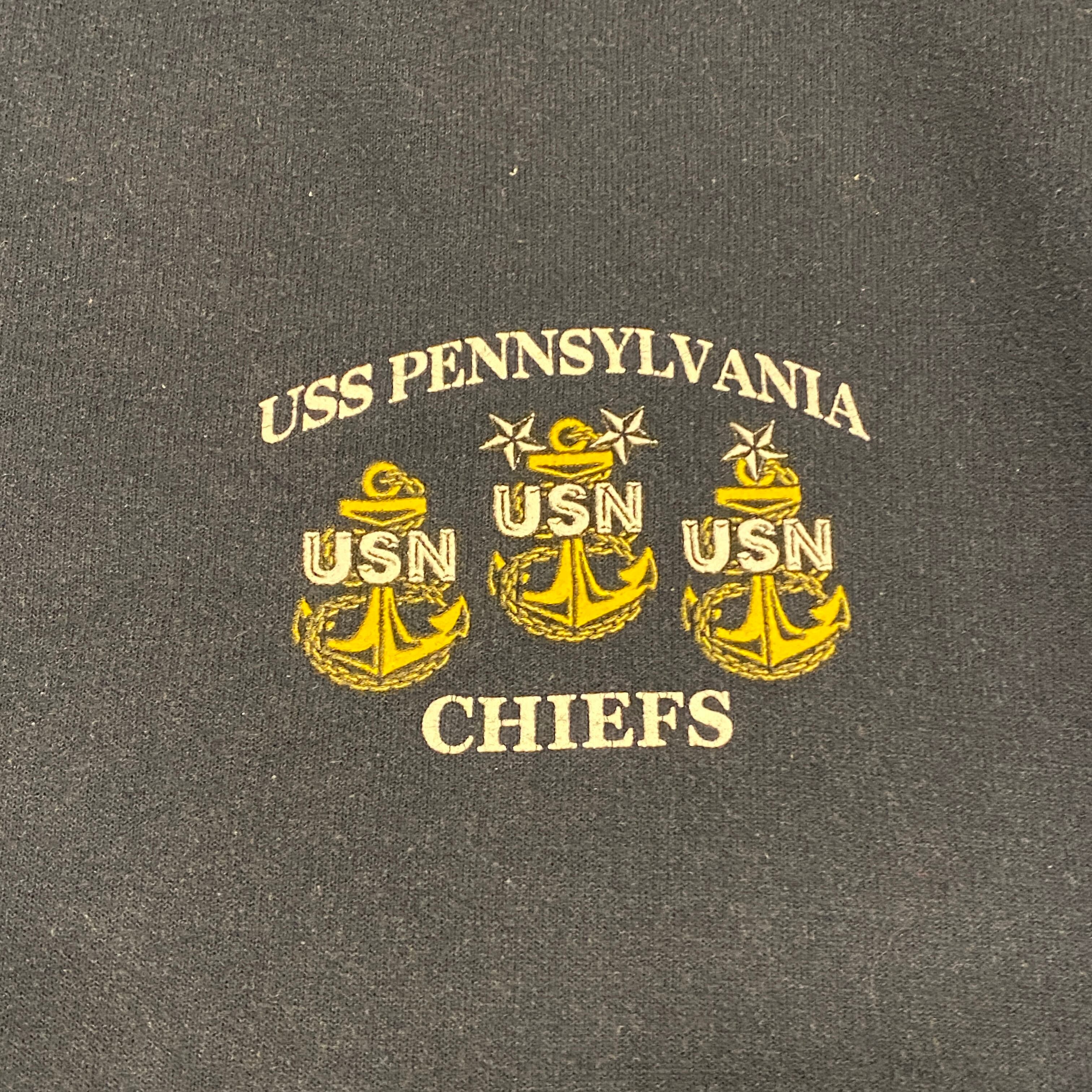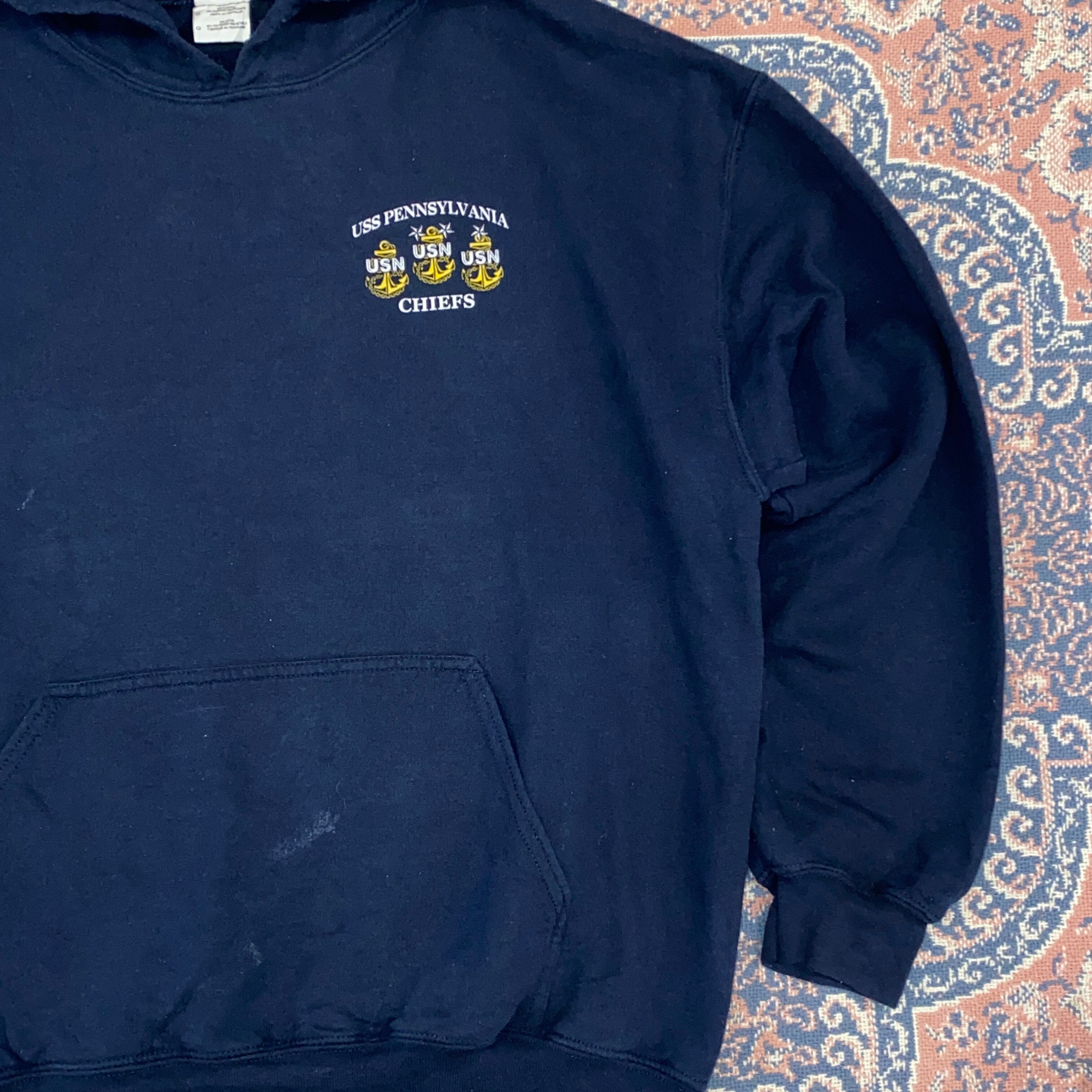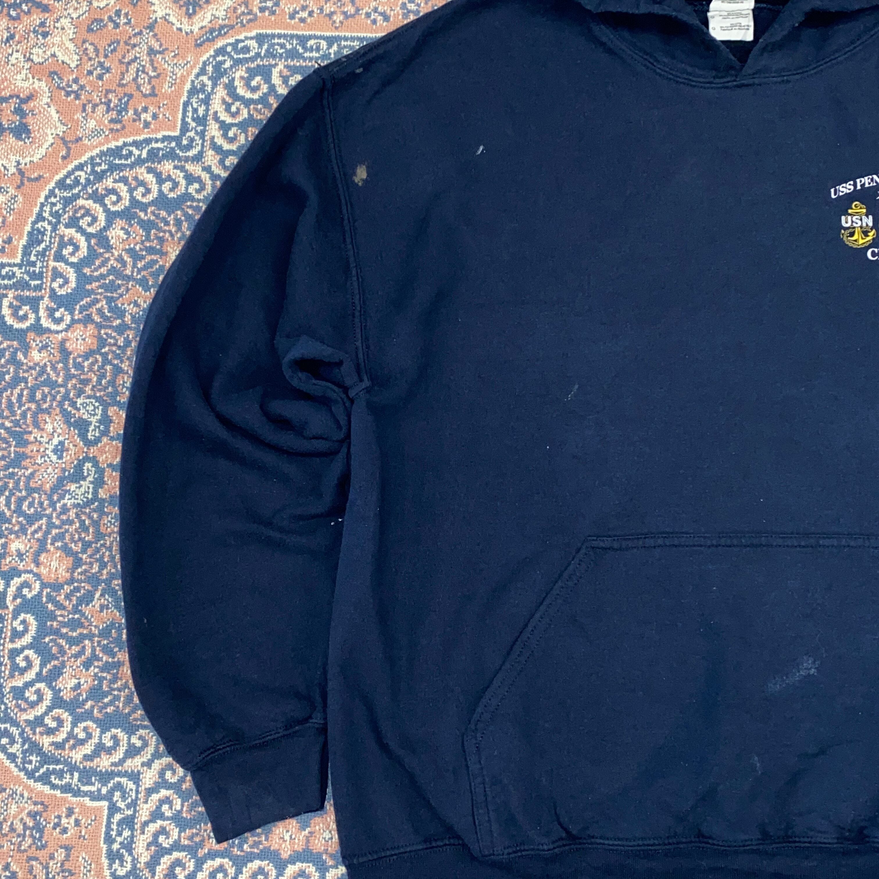 1612 90s 90年代 GILDAN プリント パーカー フーディー 長袖 ギルダン 米海軍 メンズ 古着 vintage Pennsylvania ペンシルベニア ネイビー 両面プリント