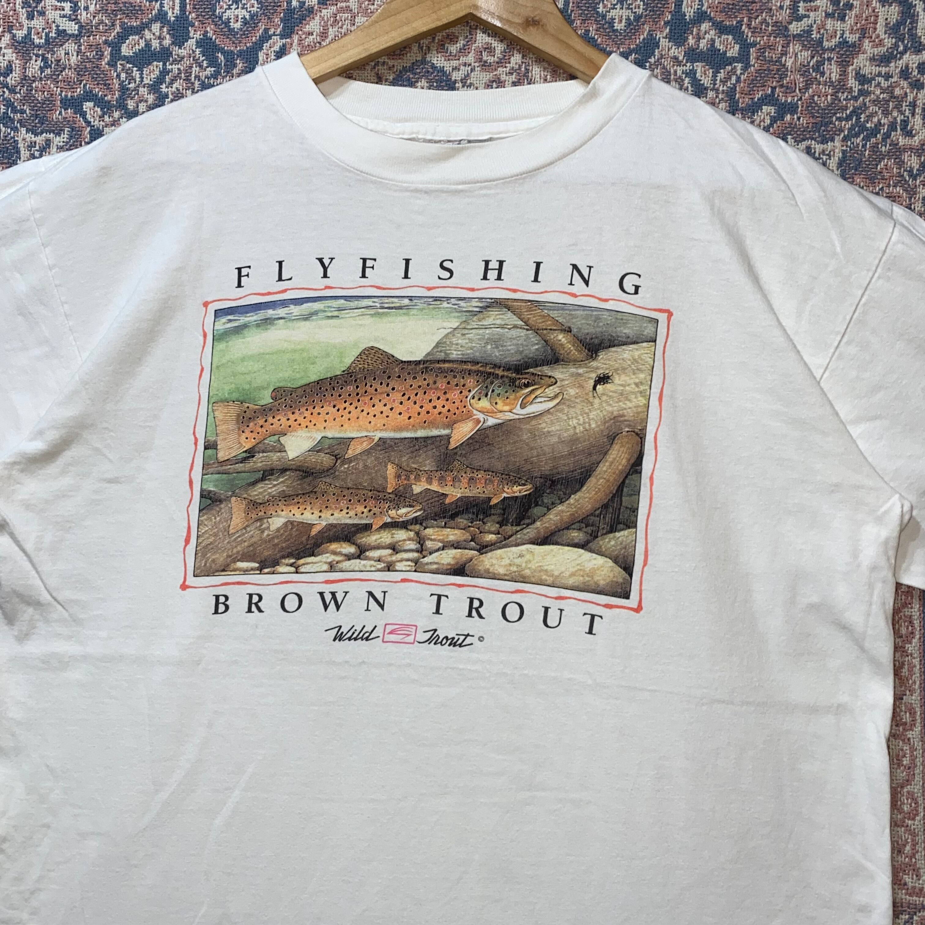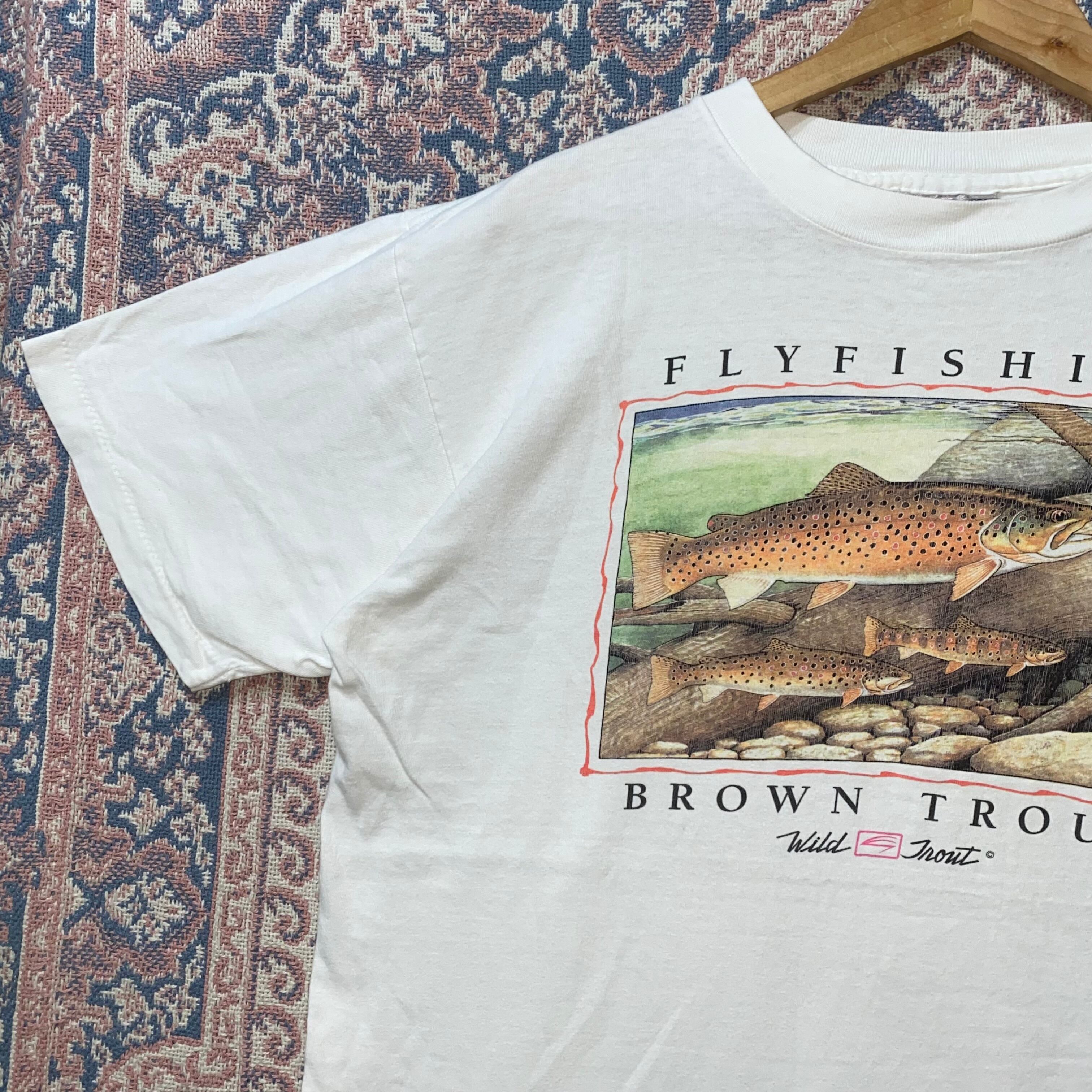 1658 90s 90年代 USA製 ΟΝΕΙΤΑ フライフィッシング Tシャツ 魚 フィッシュ イラスト ブラウントラウト シングルステッチ 古着 メンズ vintage XL