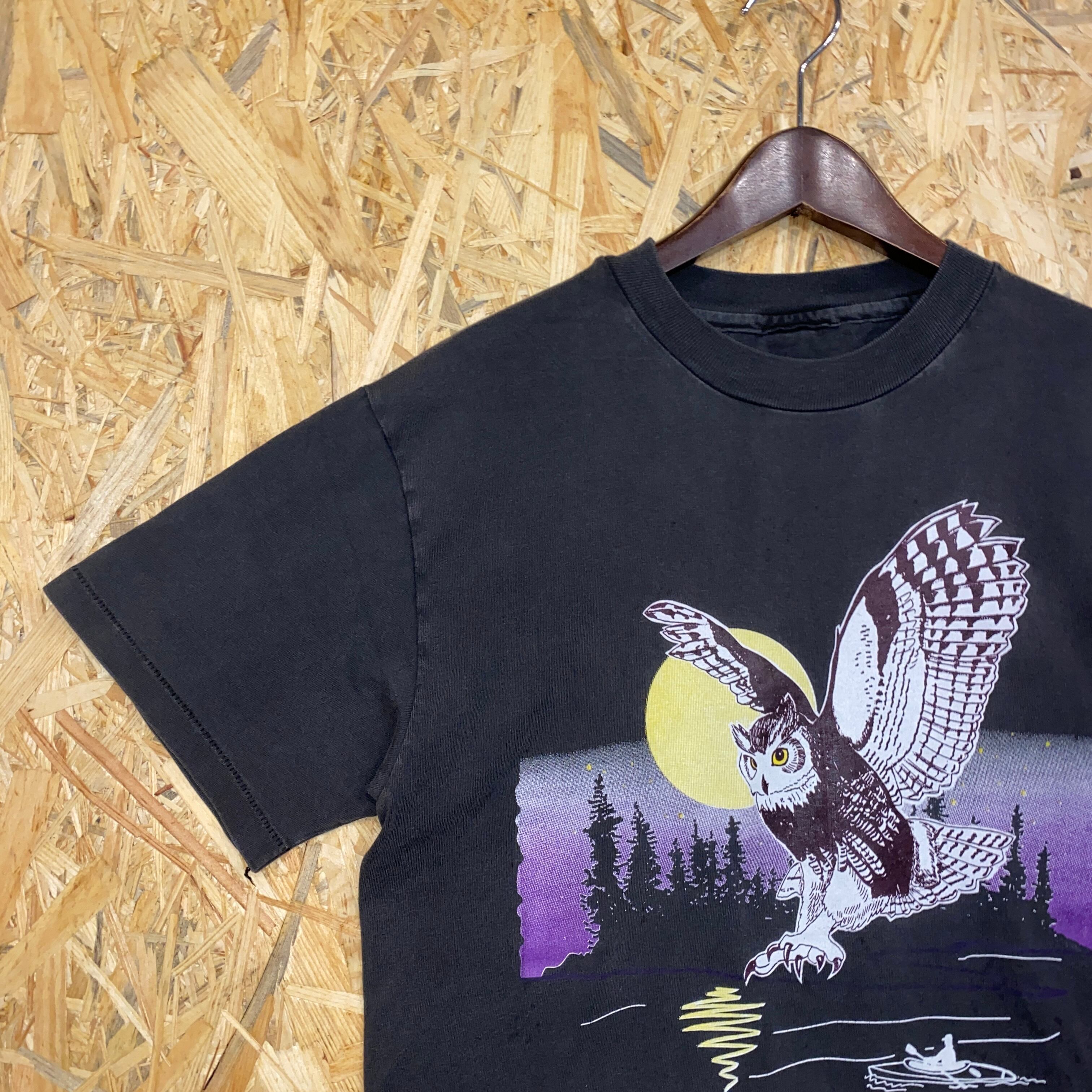 1775 プリント アニマル Tシャツ フクロウ シングルステッチ スミクロ 黒 古着 メンズ vintage