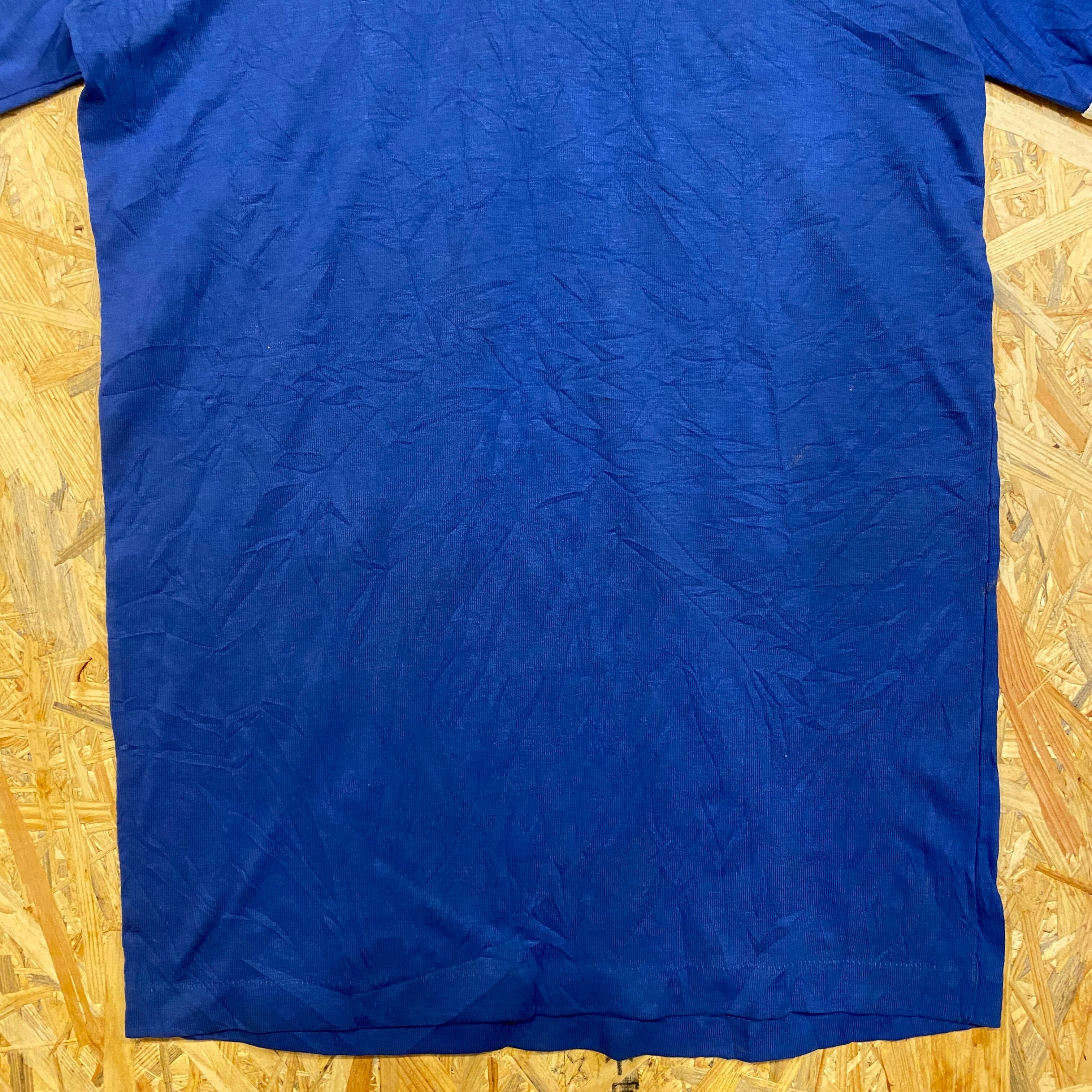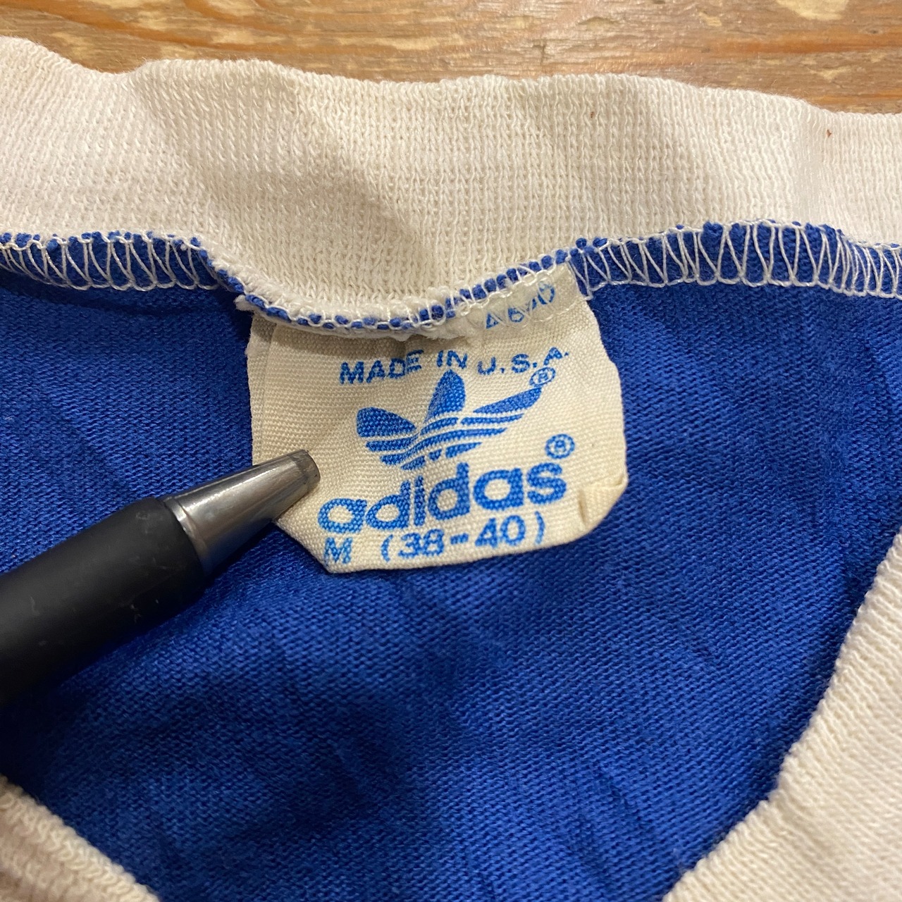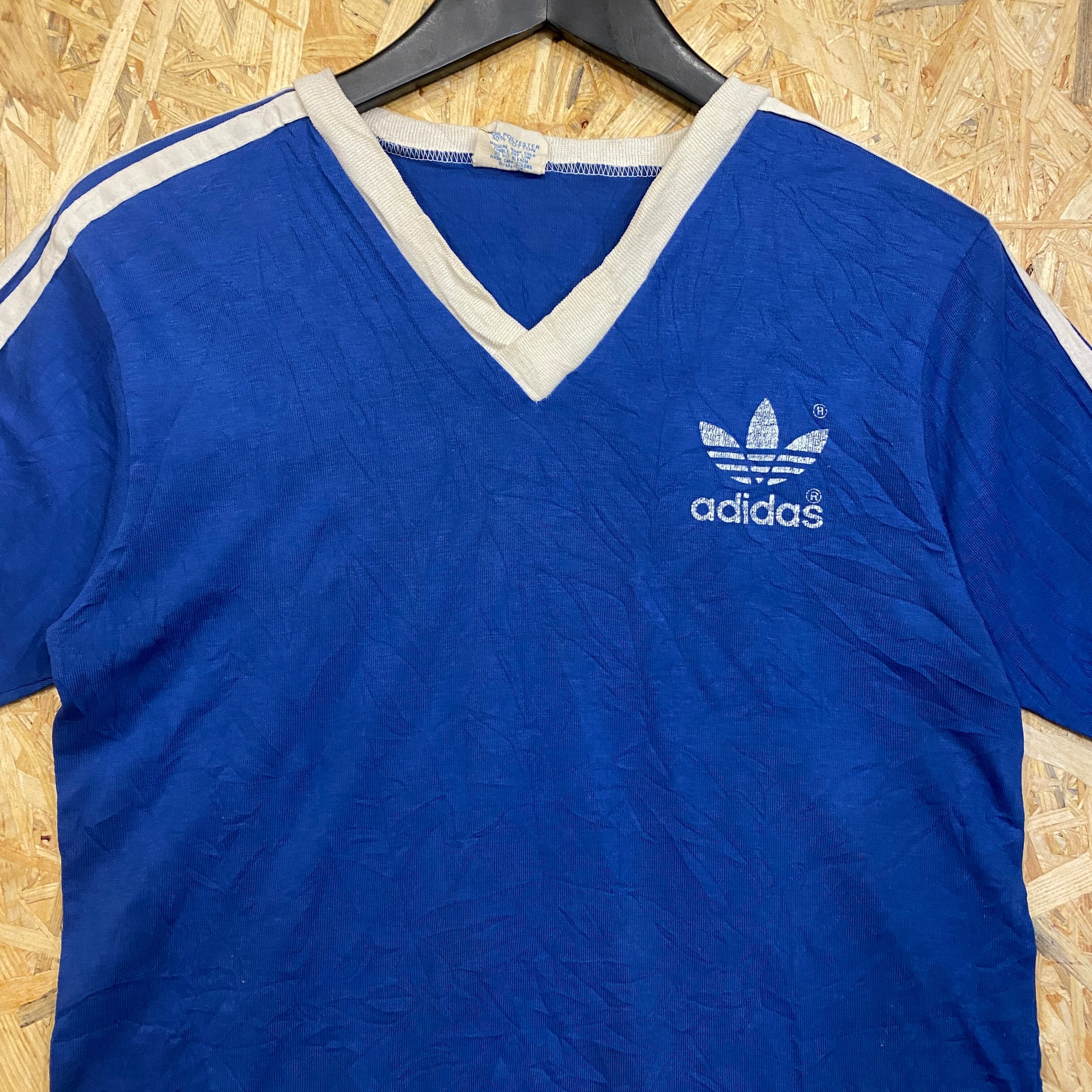 1779 80s 80年代 USA製 adidas ゲームシャツ サッカーシャツ ロゴプリント アディダス メンズ 古着 vintage 3Lライン ブルー 青 ワンポイント シングルステッチ