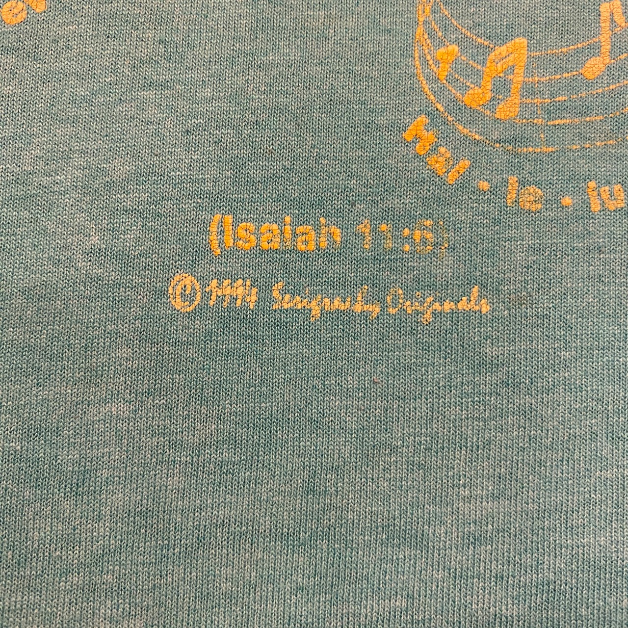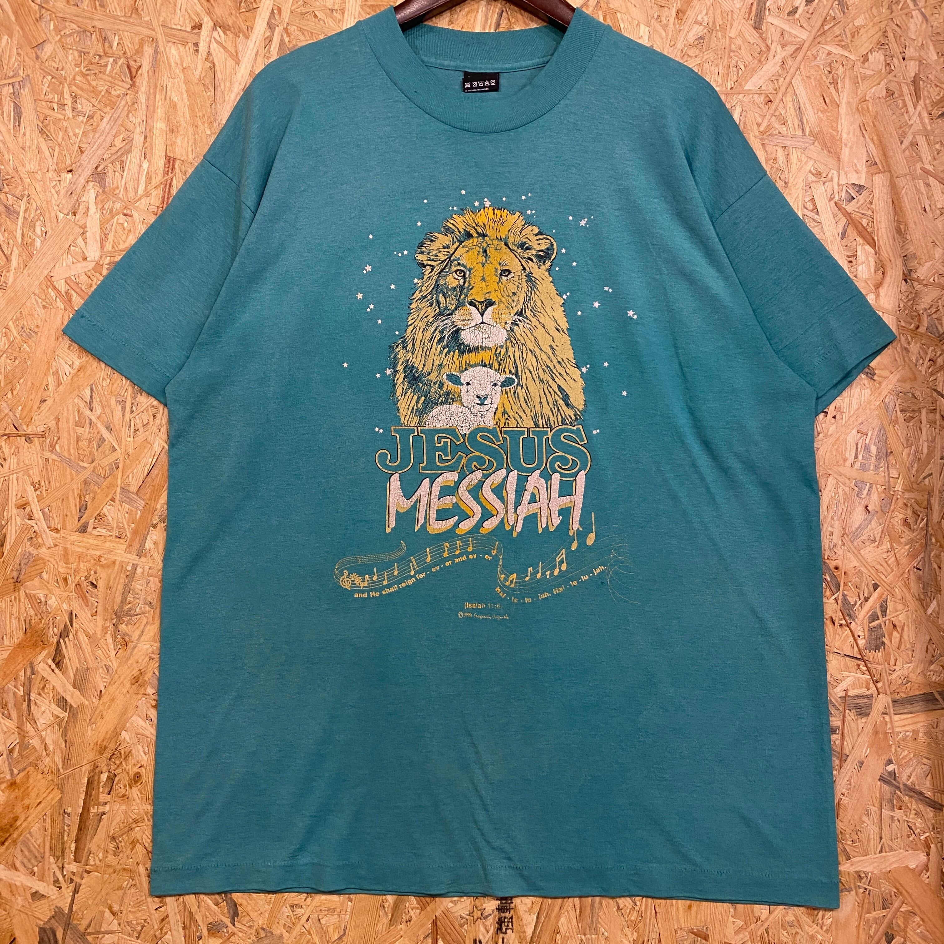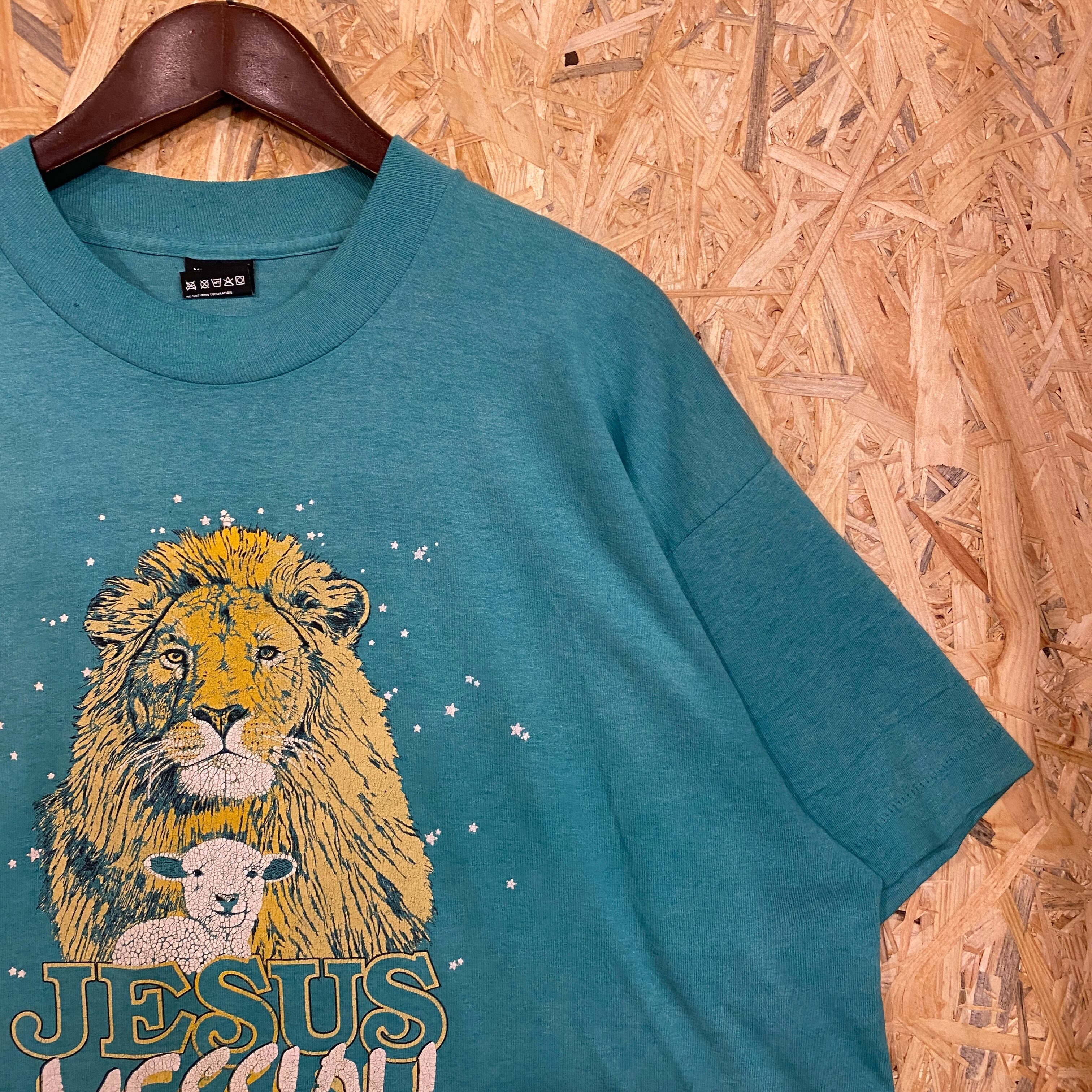 1842 90s〜 90年代〜 USA製 FRUIT OF THE ROOM フルーツオブザルーム 両面プリント Tシャツ ライオン シングルステッチ エメラルドグリーン 緑 古着 メンズ vintage XL JESUS MESSIAH 聖書 キリスト
