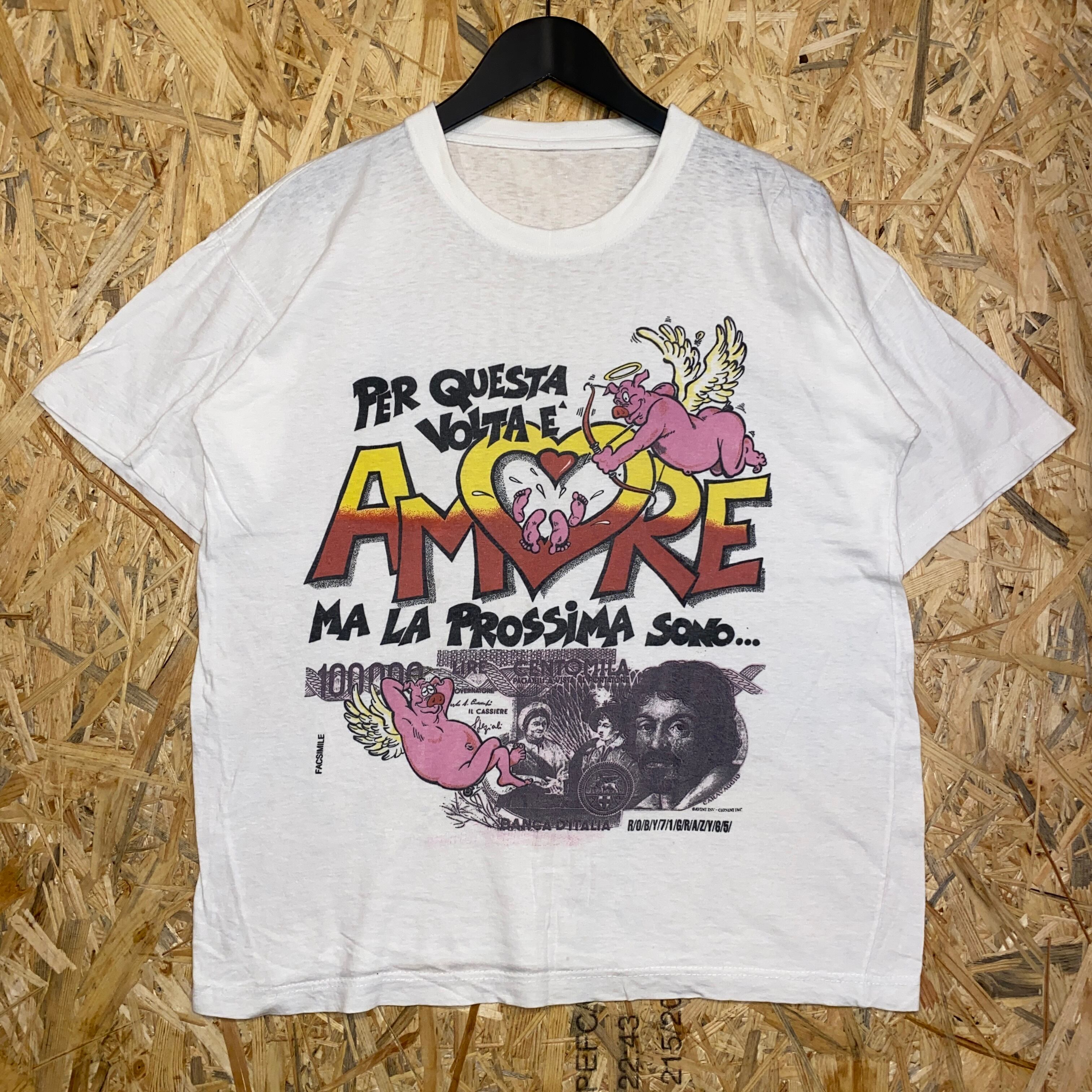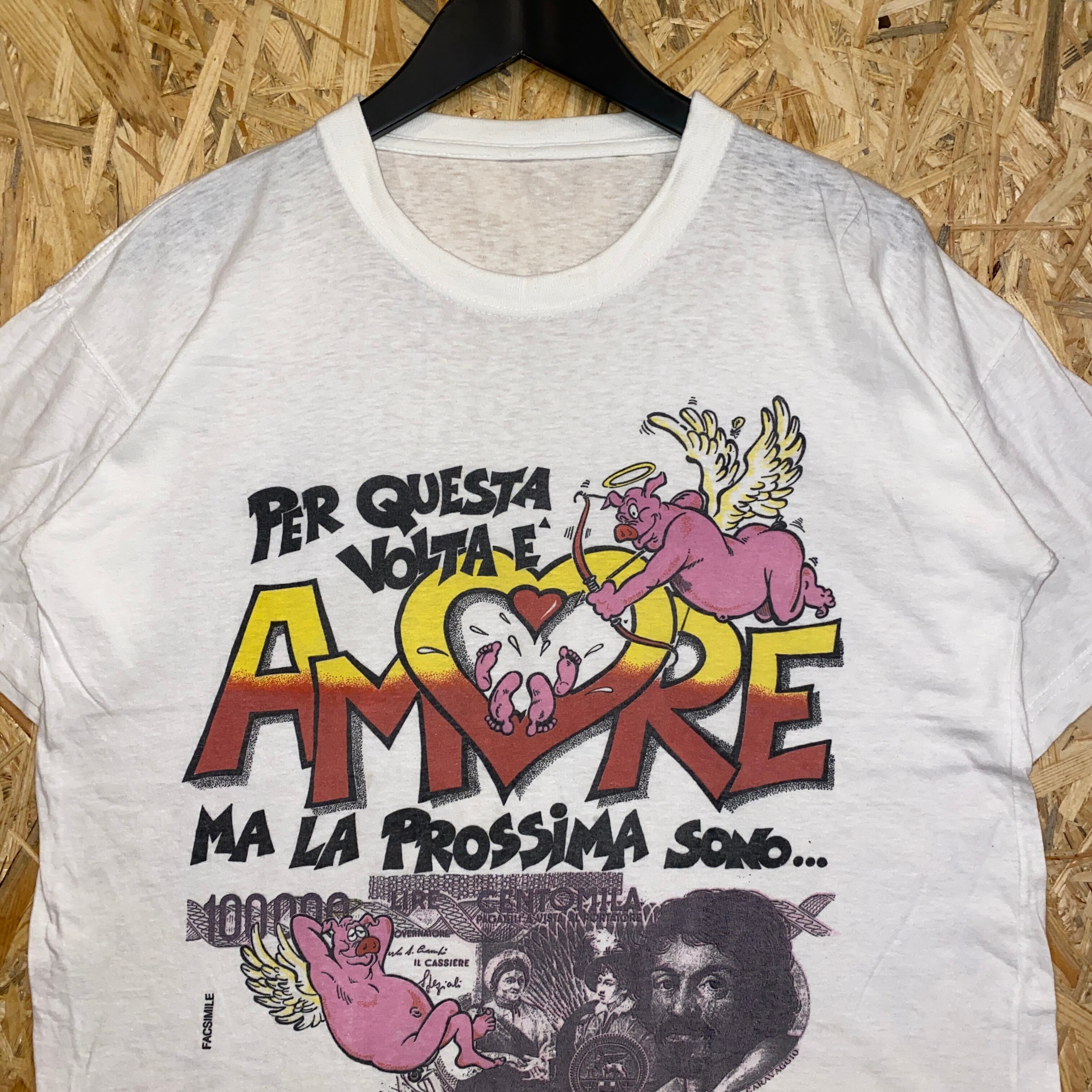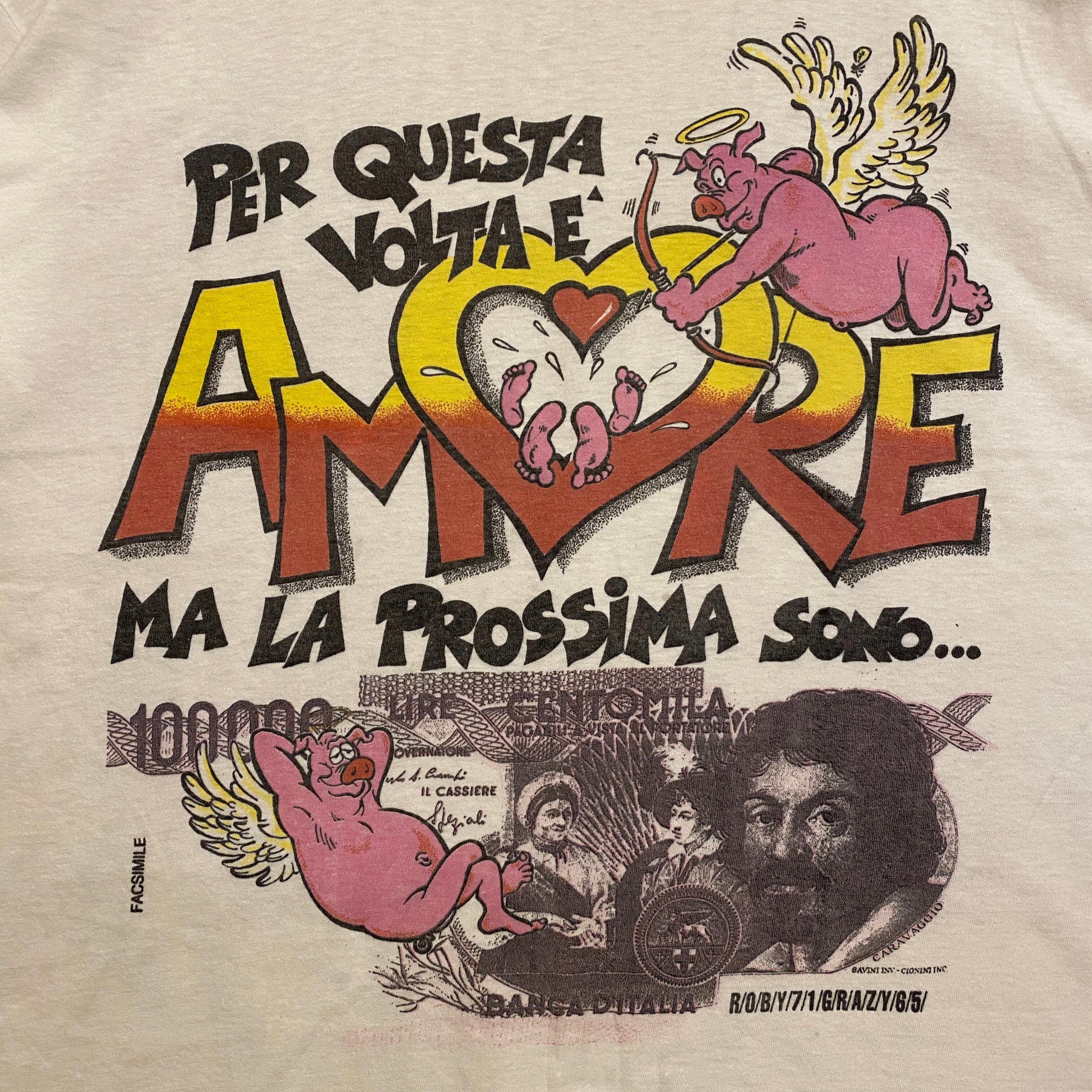 1890 90s〜 90年代〜 グラフィック プリント Tシャツ イタリア Italy 企業物 CARAVAGGIO AMORE アモーレ キューピッド 天使 豚 動物 ホワイト 白 古着 メンズ vintage M