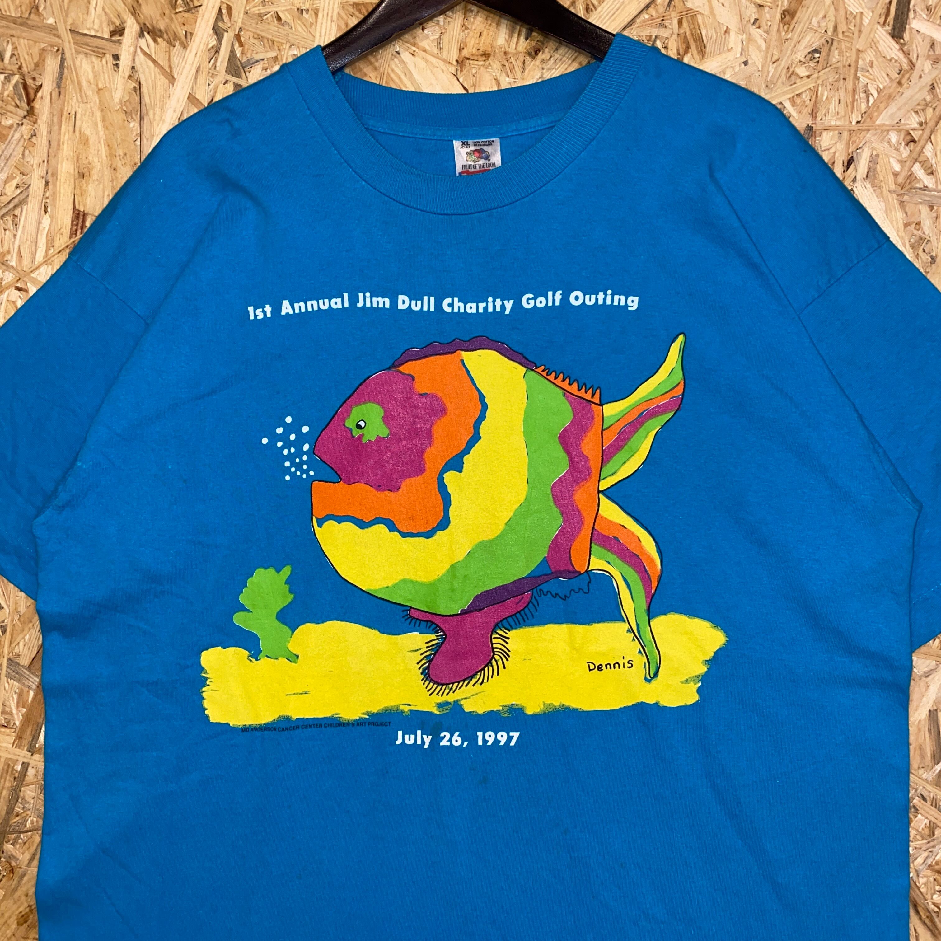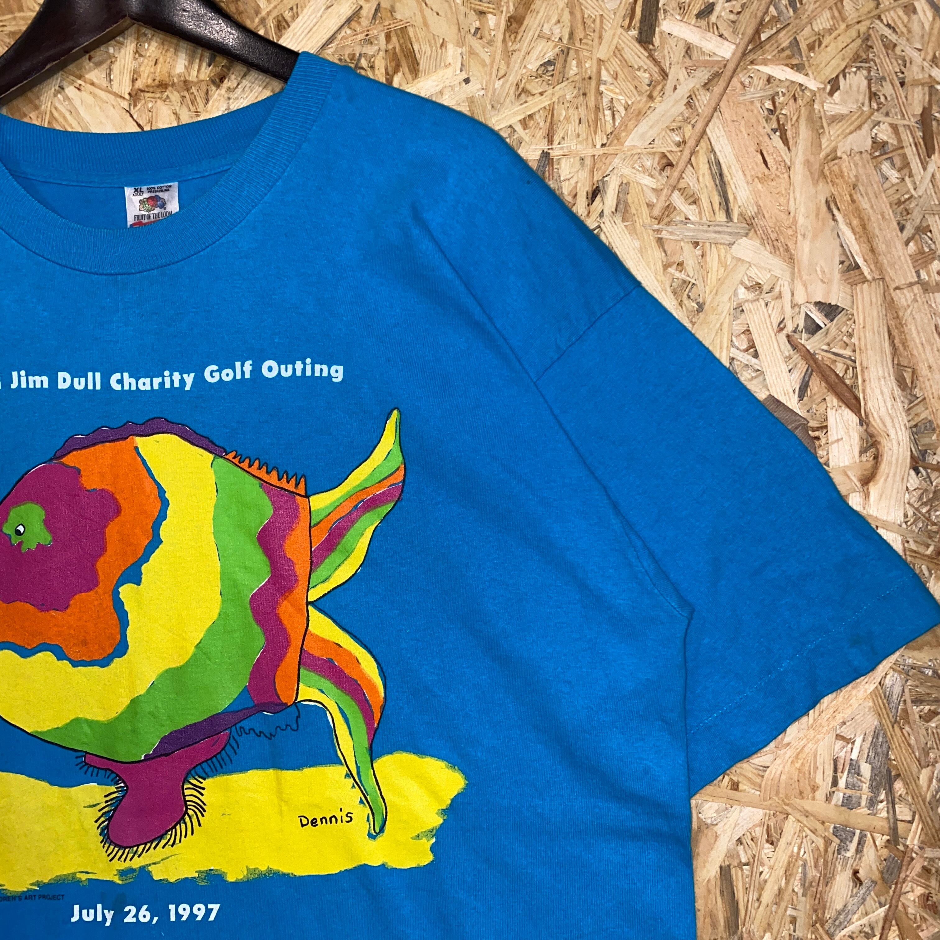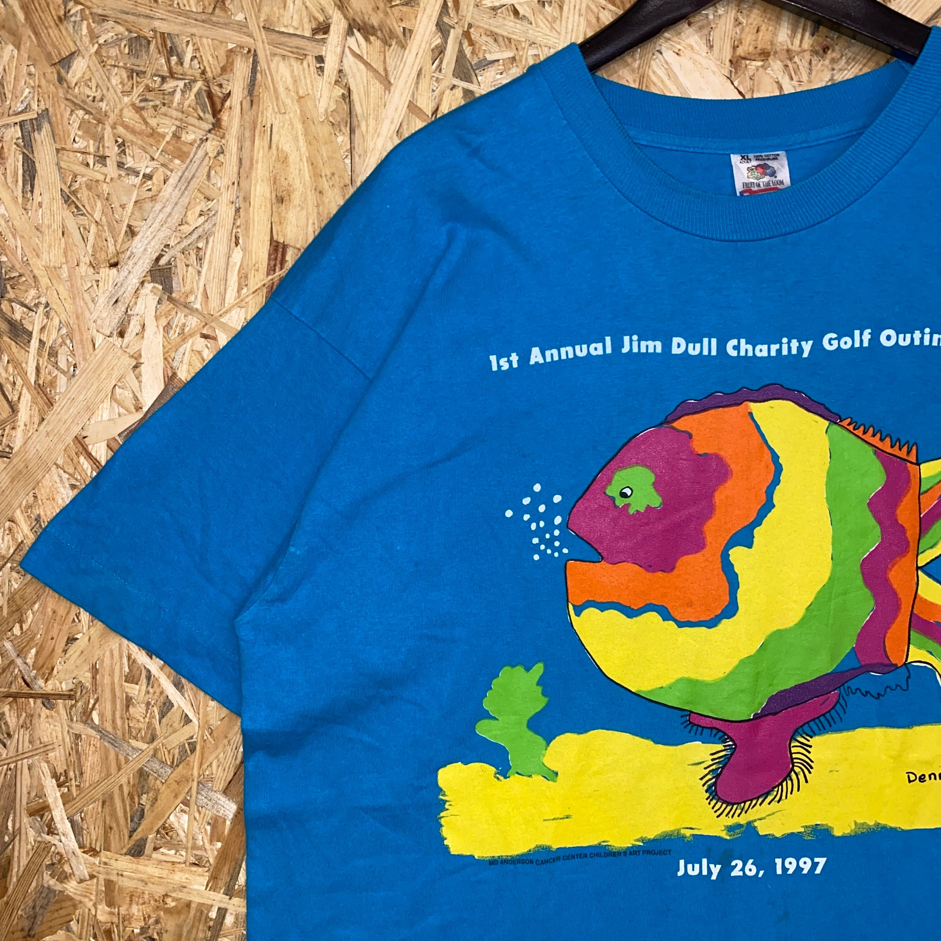 2108 90s 90年代 USA製 魚 アート プリント Tシャツ 児童 チャリティー カラフル マンボウ シングルステッチ ブルー 青 古着 メンズ vintage XL