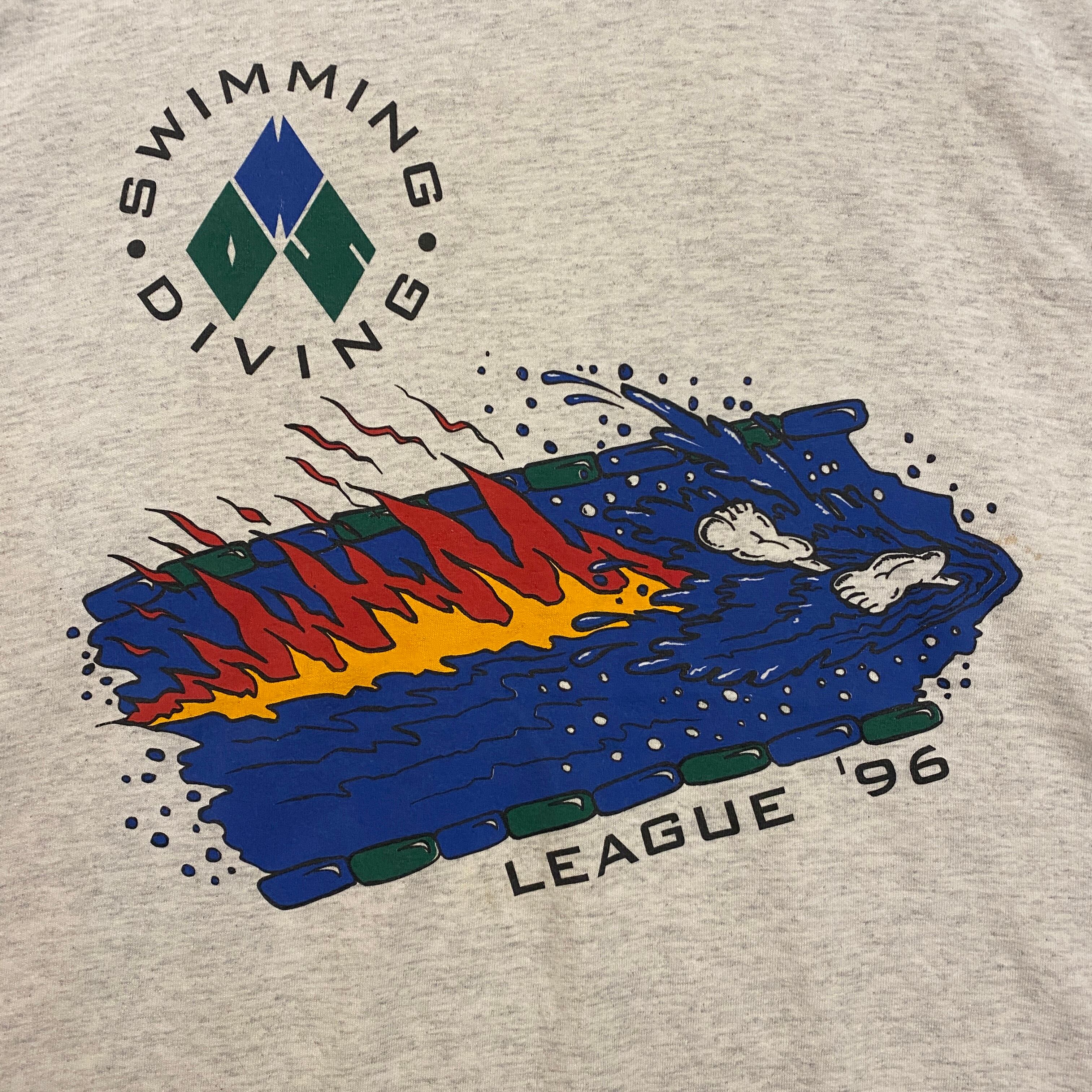 2177 90s 90年代 イラスト 両面 プリント Tシャツ 水泳 スポーツ swimming 炎 グラフィック グレー 古着 メンズ vintage