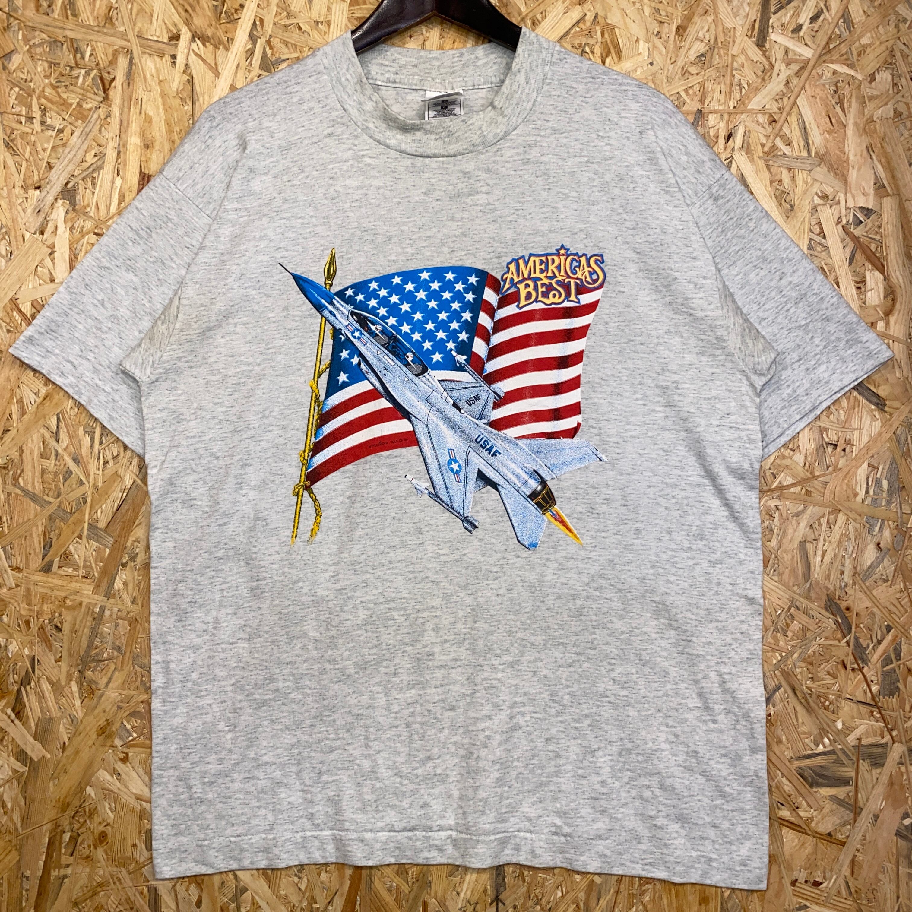 2206 90s 90年代 USAF アメリカ 国旗 プリント Tシャツ 空軍 F16 戦闘機 シングルステッチ グラフィック フルーツオブザルーム 古着 メンズ vintage