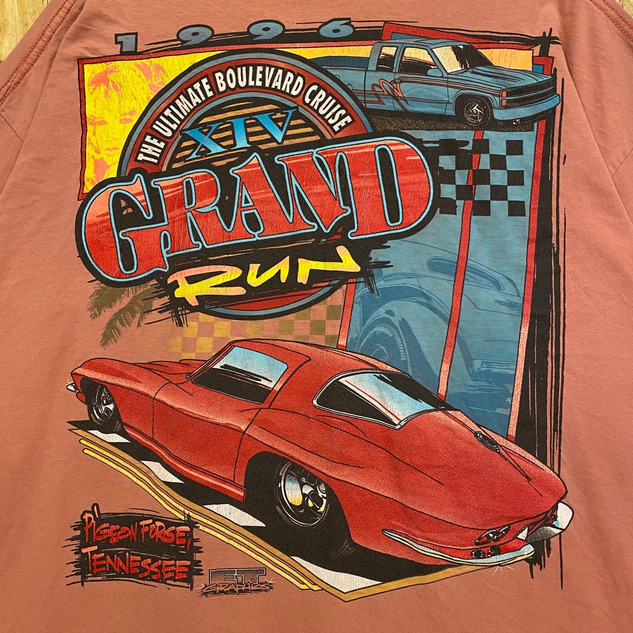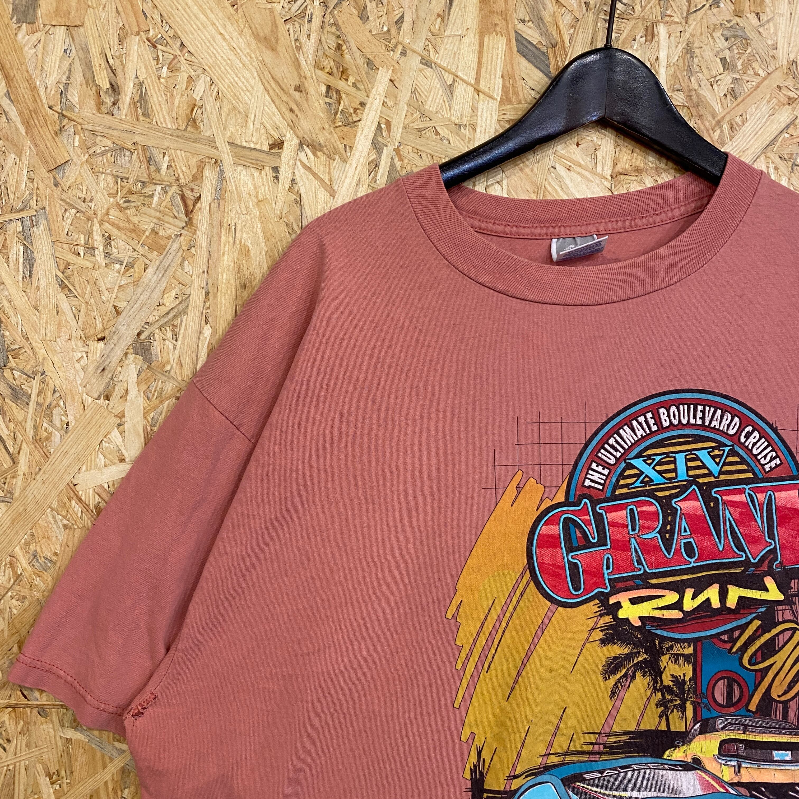 2235 90s 90年代 USA製 車 両面 プリント Tシャツ GRAND RUN クルーズイベント クラシックカー ピンク 古着 メンズ vintage
