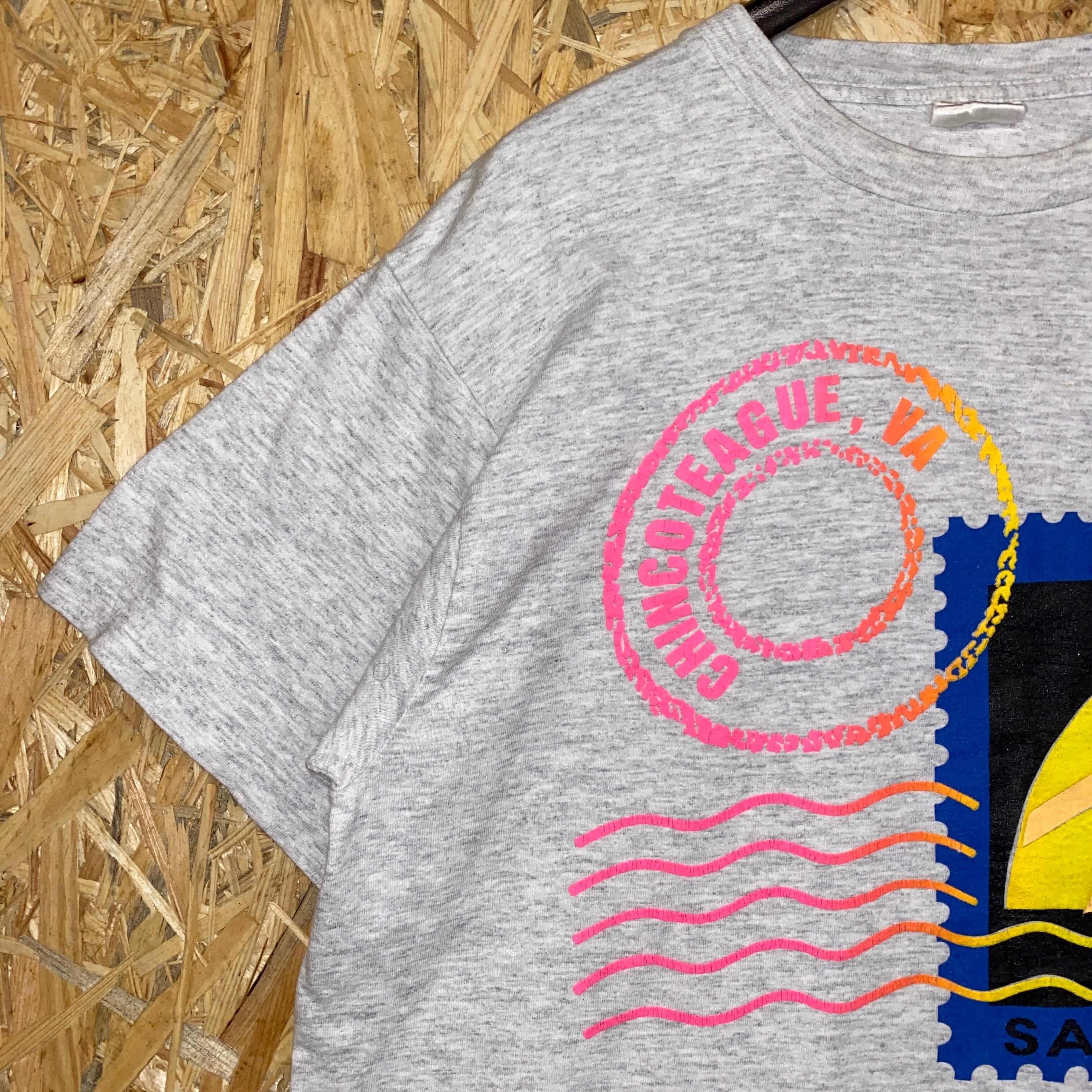 2258 90s〜 90年代〜 TULTEX タルテックス グラフィック プリント Tシャツ 切手 船 旅 カラフル バージニア州 シングルステッチ グレー 灰色 古着 メンズ vintage