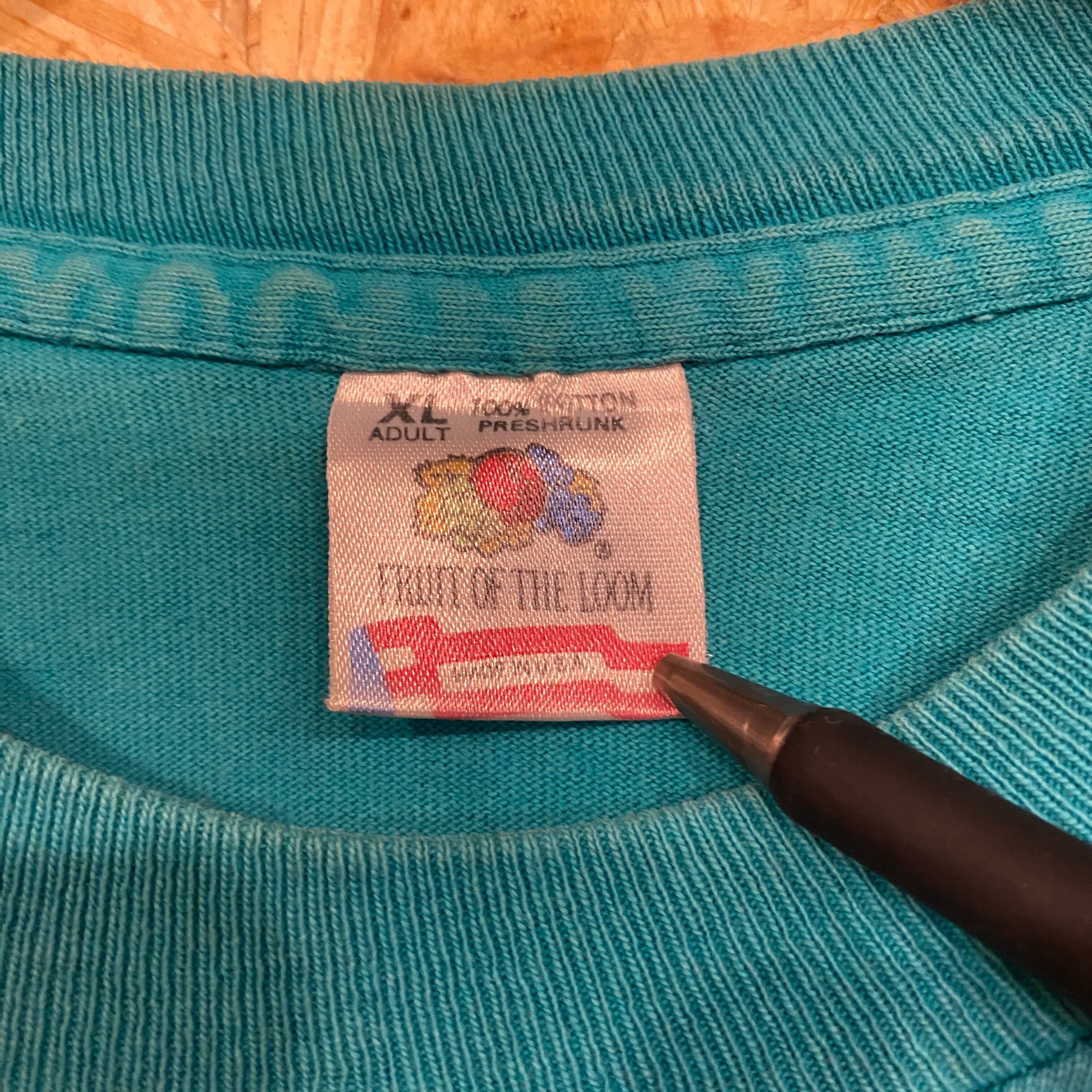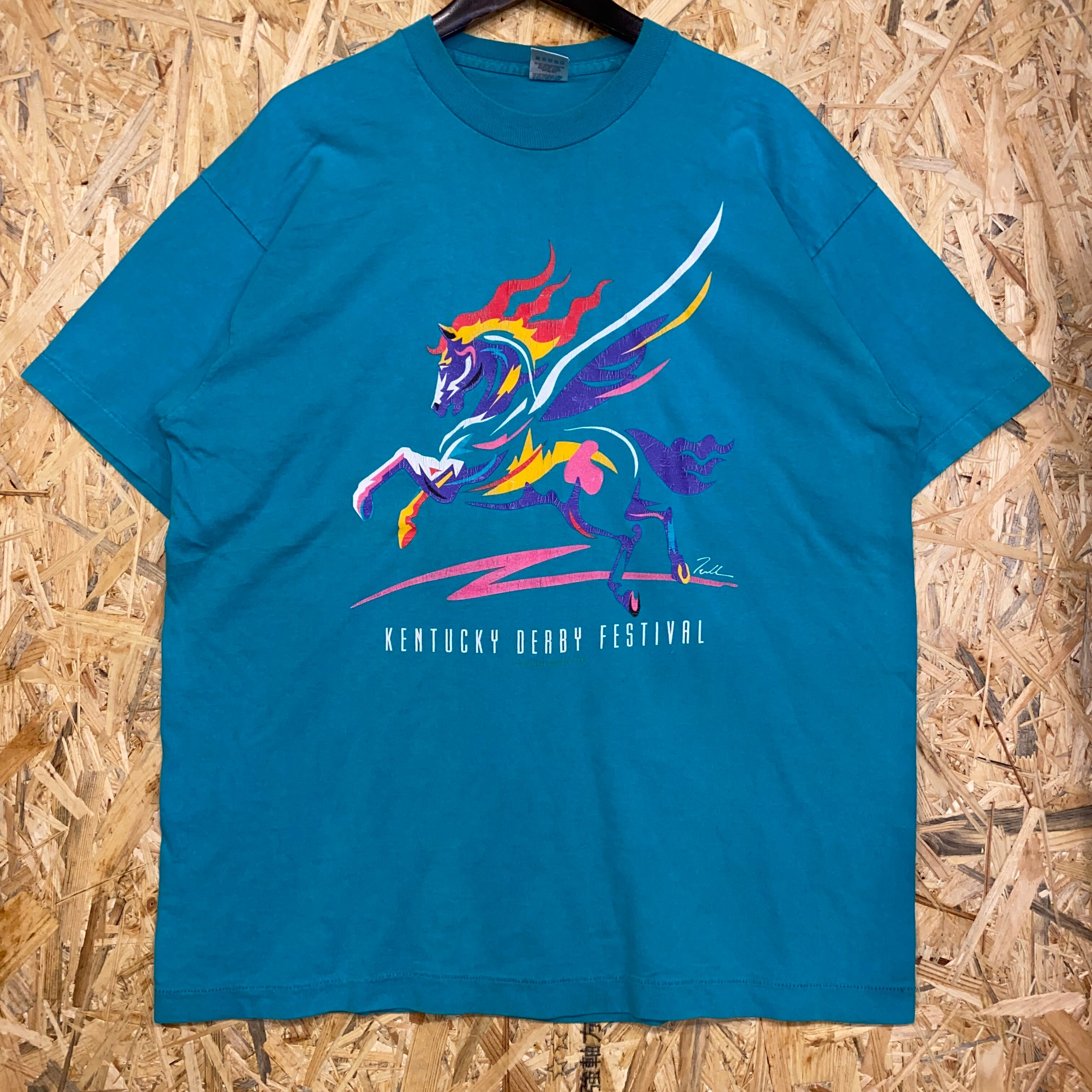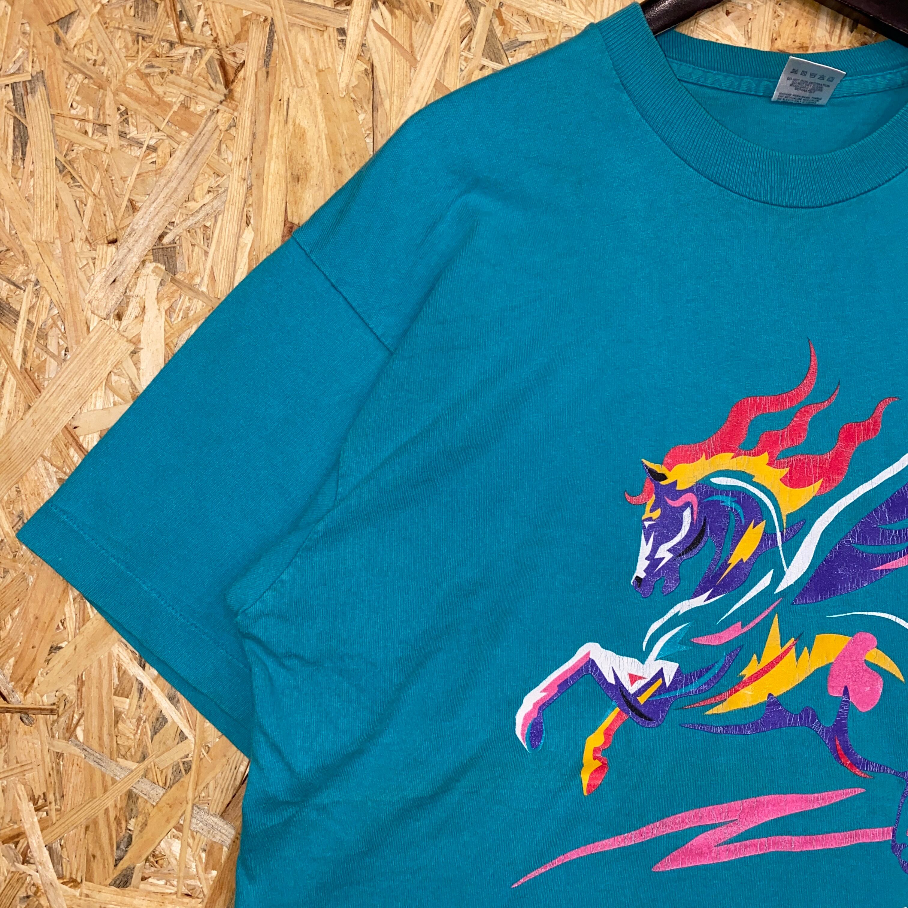 2261 90s〜 90年代〜 USA製 FRUIT OF THE ROOM フルーツオブザルーム グラフィック プリント Tシャツ 馬 ユニコーン シングルステッチ 青 ブルー グリーン 古着 メンズ vintage XL