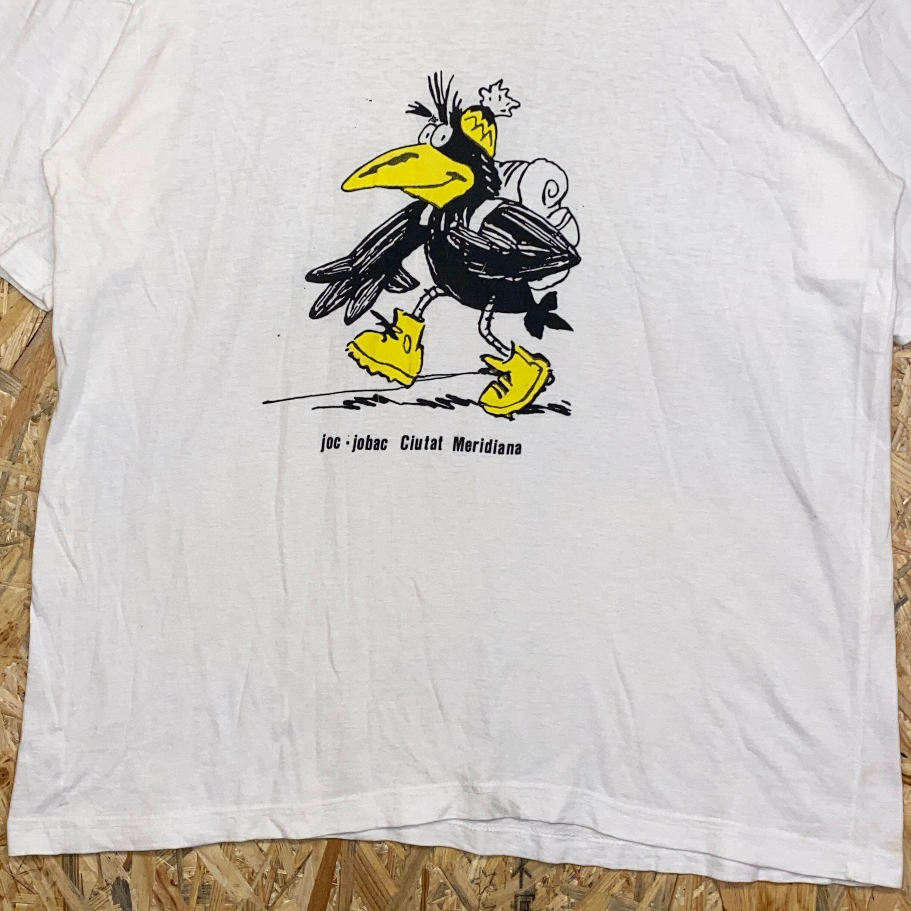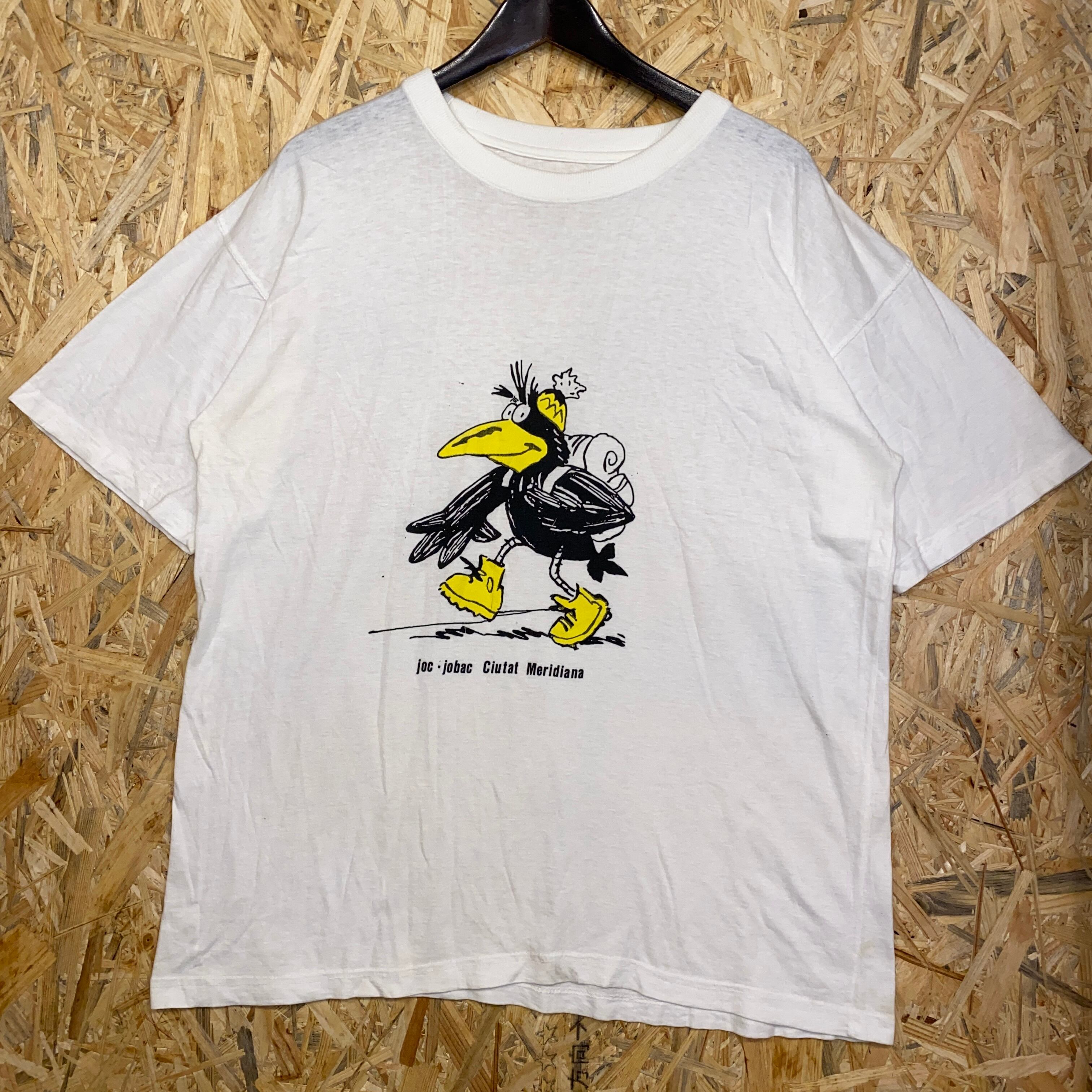 2274 イラスト Tシャツ カラス 鳥 アニマル ホワイト 白 スペイン バルセロナ 古着 メンズ vintage