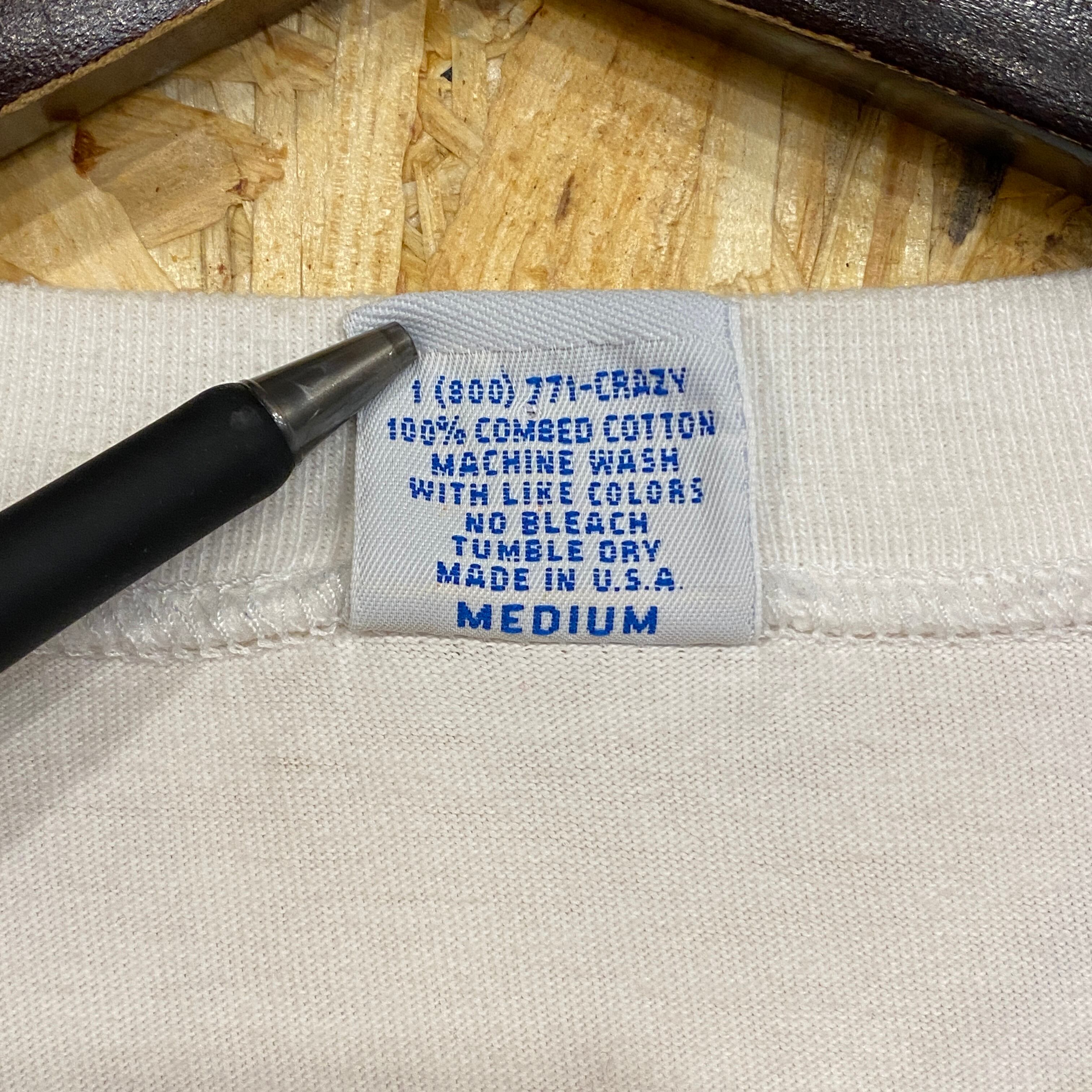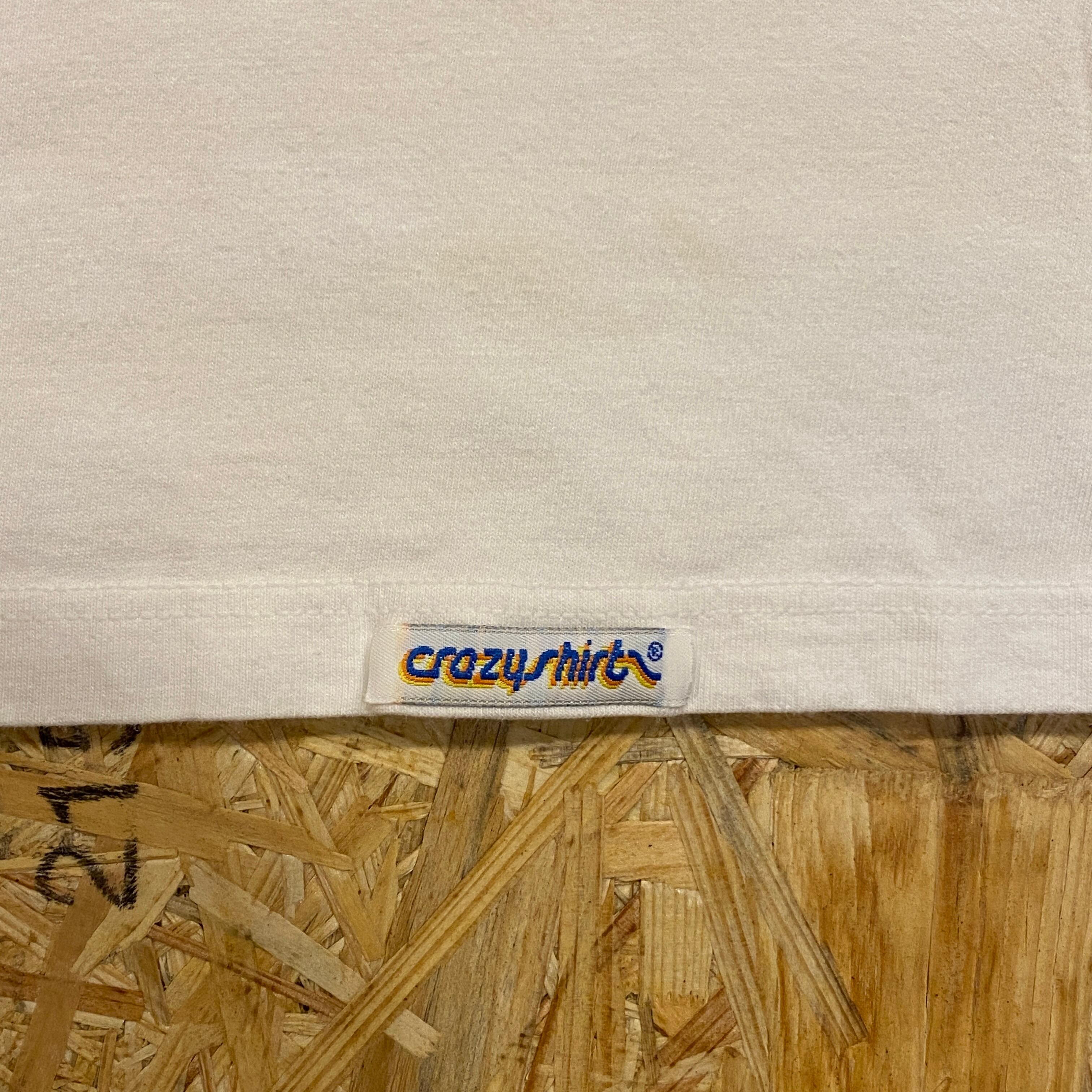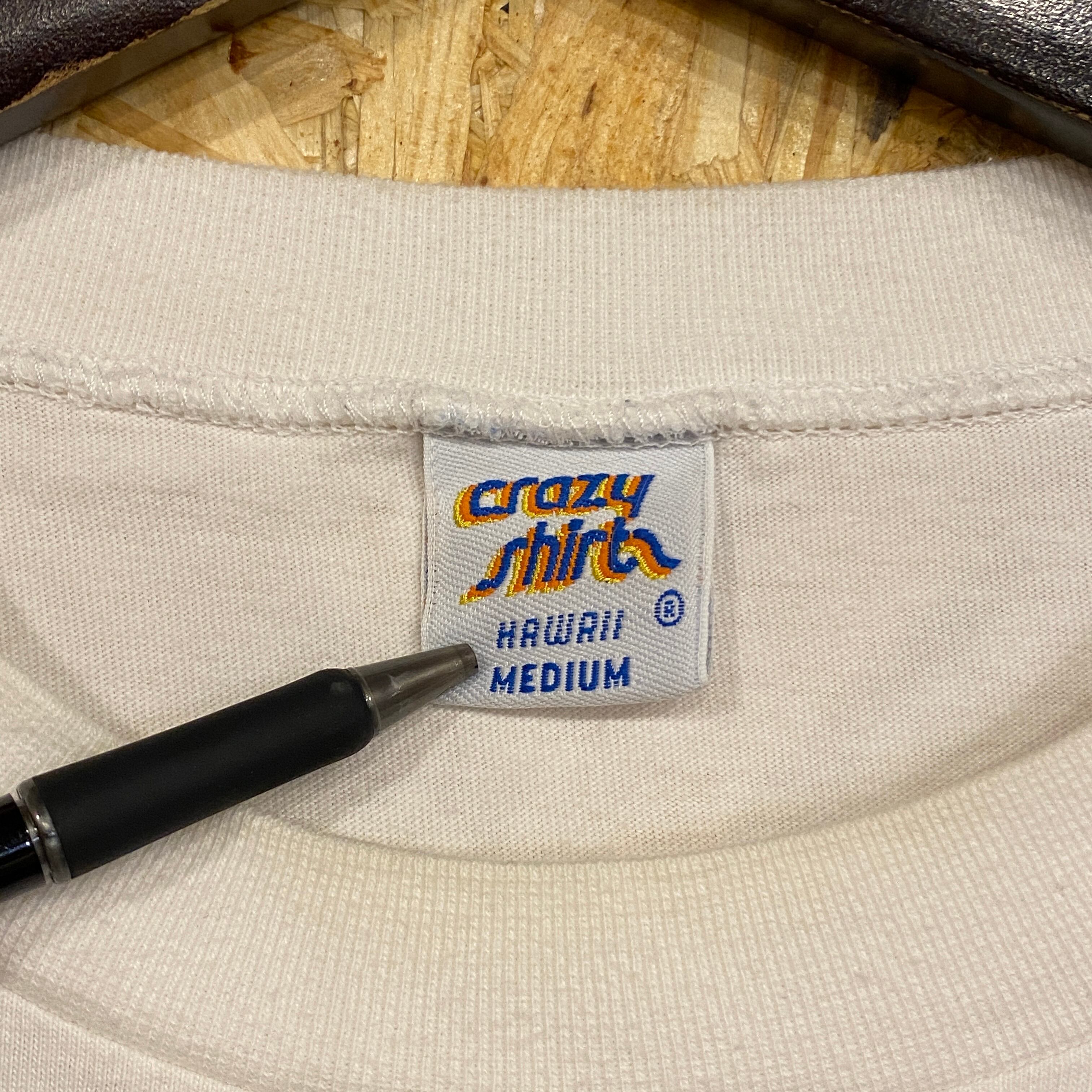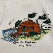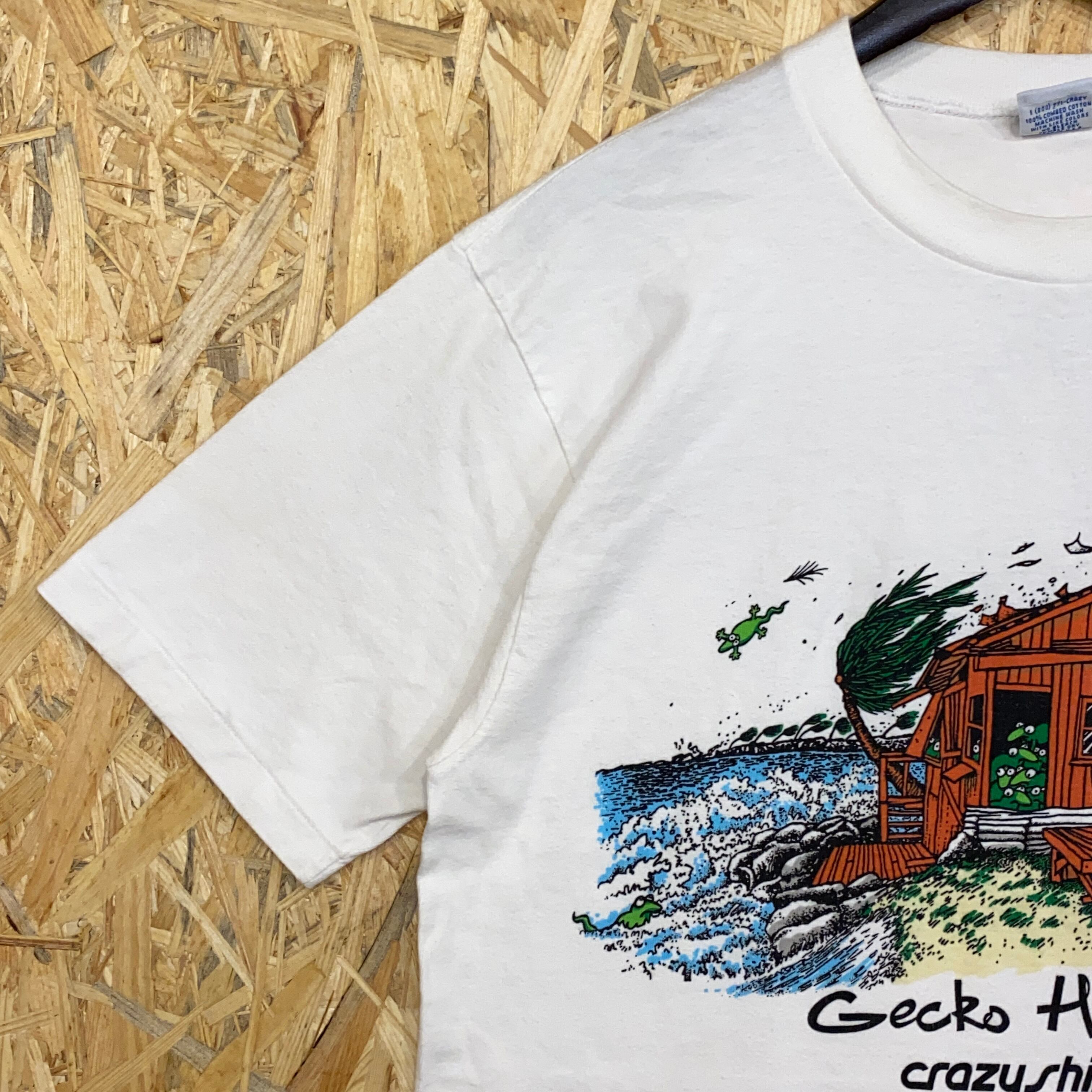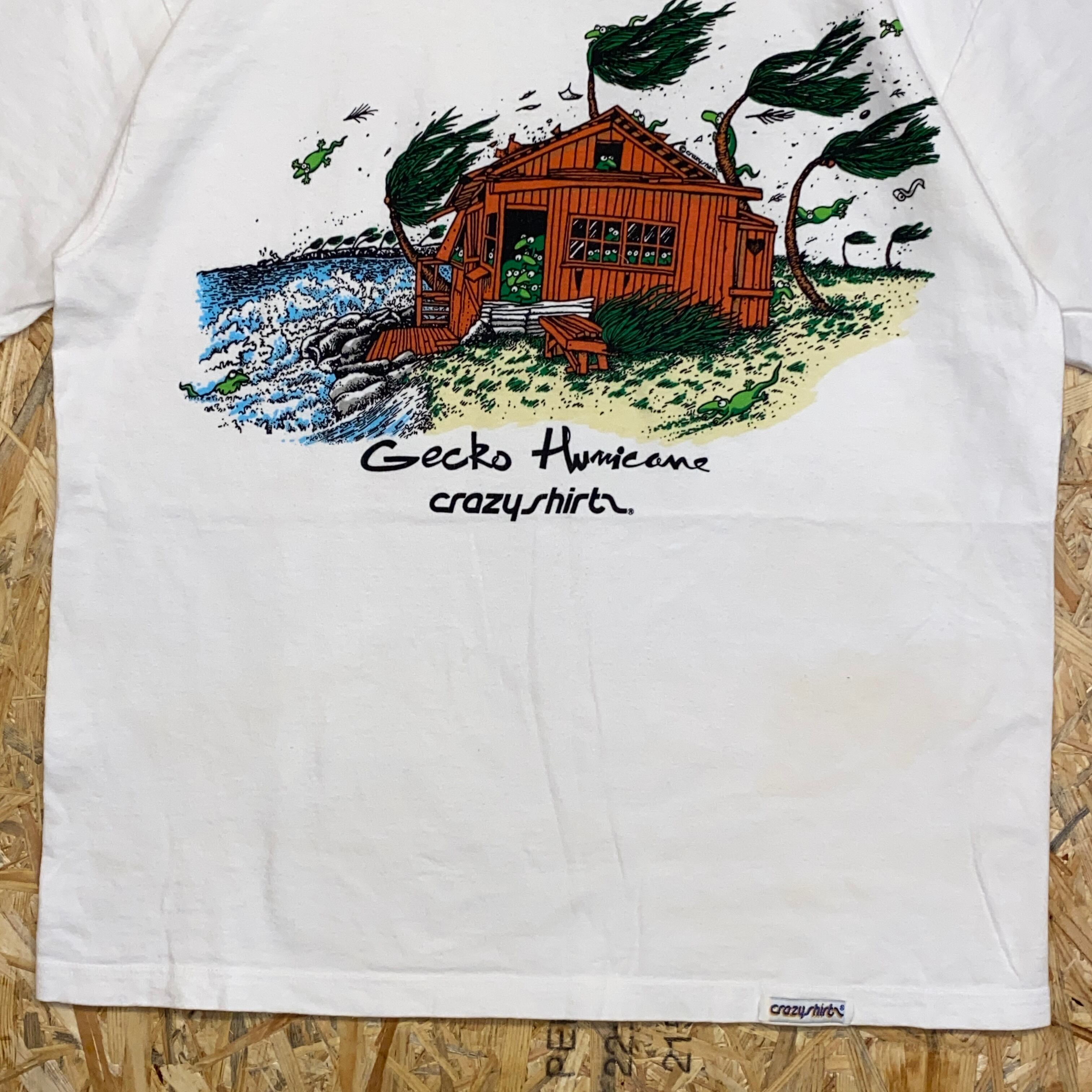 2315 90s 90年代 USA製 クレイジー シャツ ハワイ ビーチ 台風 家 海 アニマル イラスト Tシャツ ゲッコーハリケーン ホワイト 白 古着 メンズ vintage