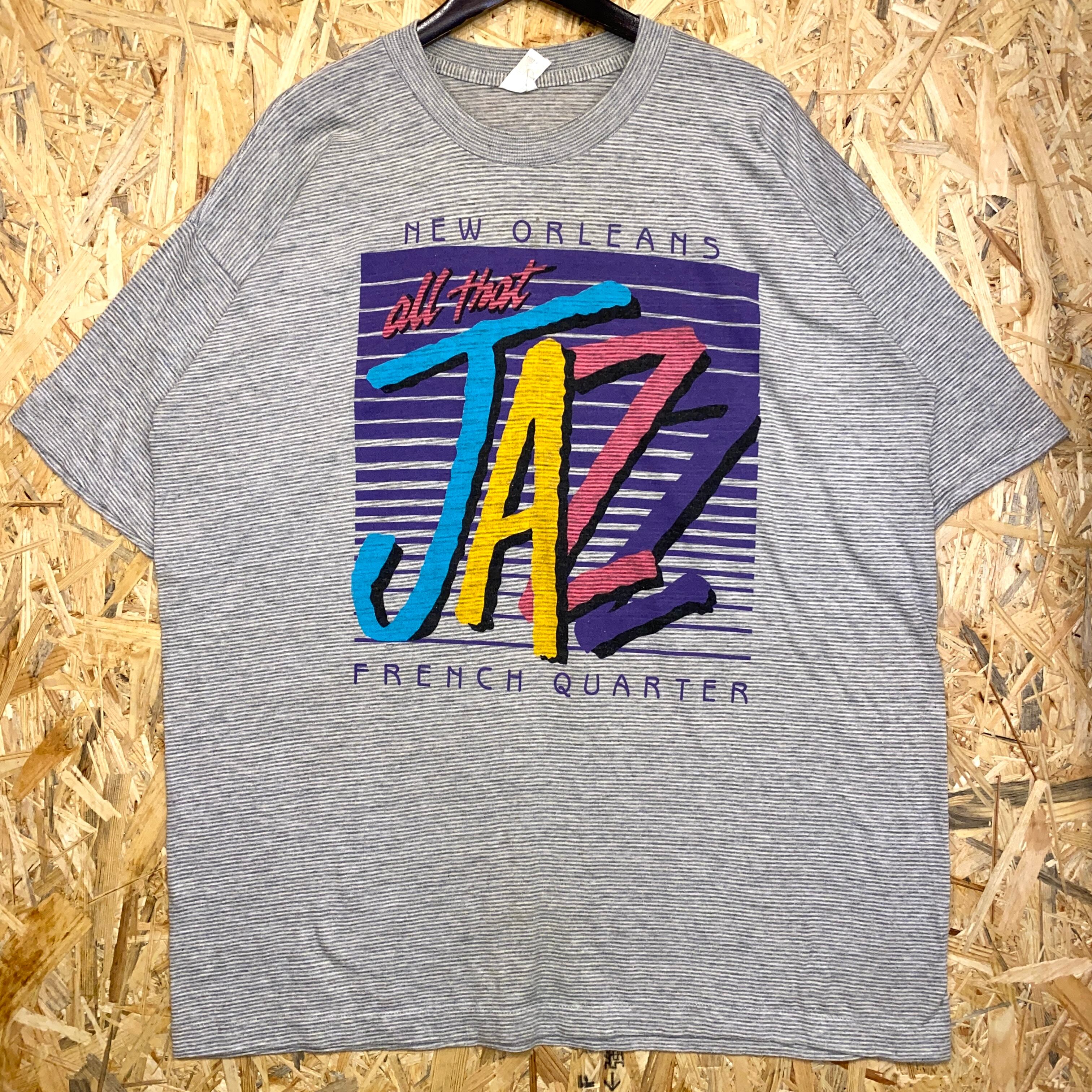 2318 90s〜 90年代〜 USA製 NEW ORLEANS プリント Tシャツ jazz ジャズ 音楽 music ボーダー グレー シングルステッチ 古着 メンズ vintage XL