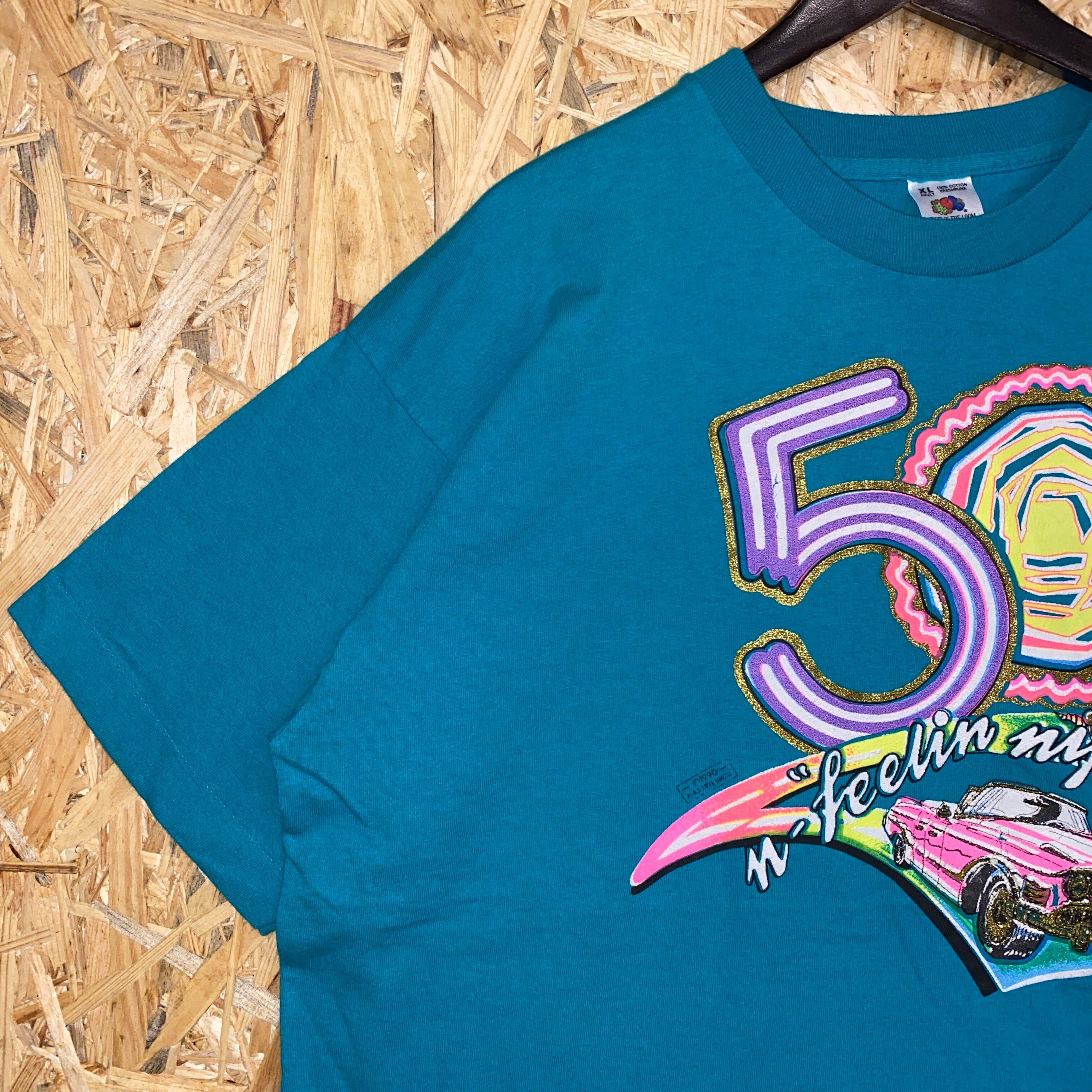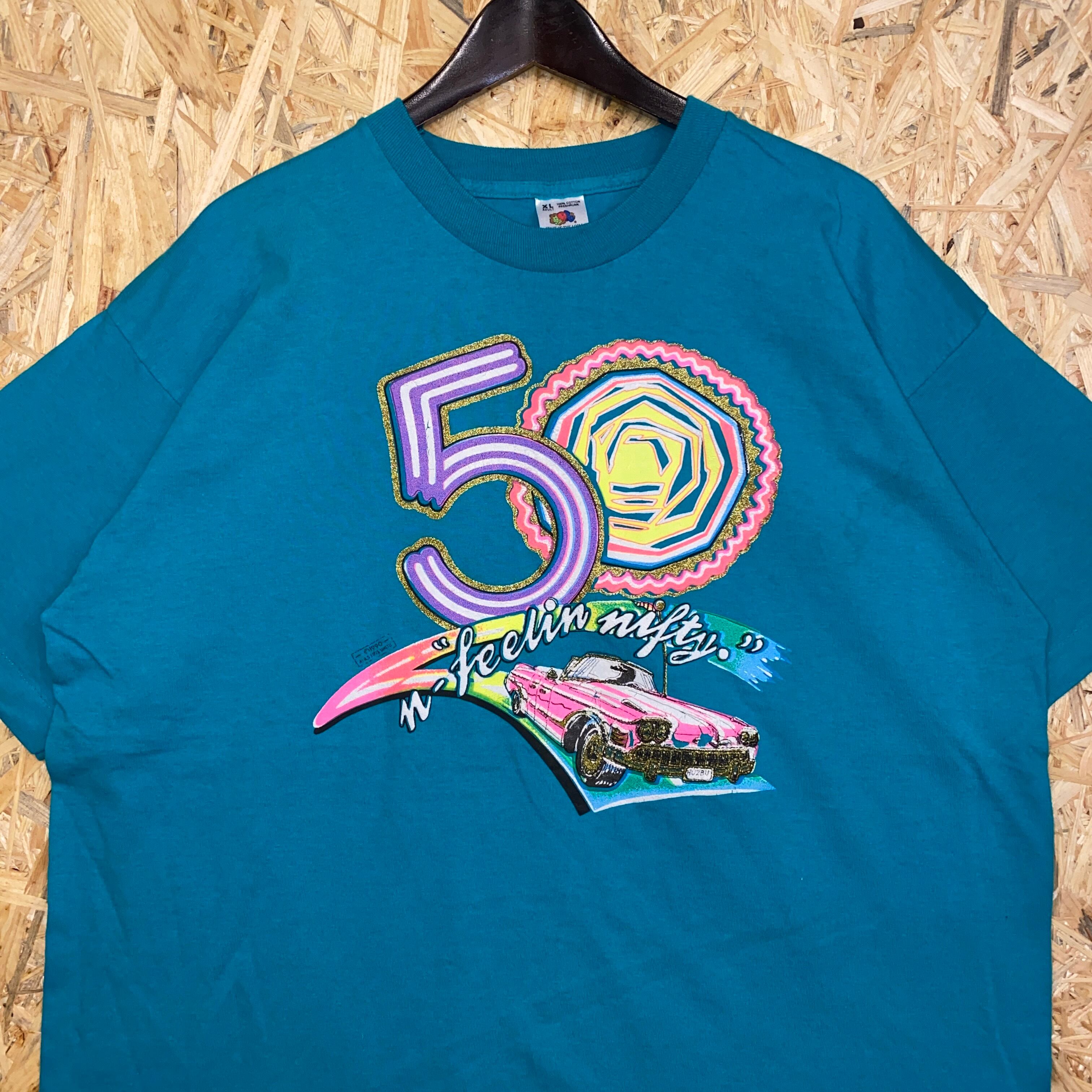 2331 90s 90年代 USA製 クラシックカー グラフィック Tシャツ "n-feelin' nifty" 50 記念 ターコイズ ブルー 古着 メンズ vintage XL