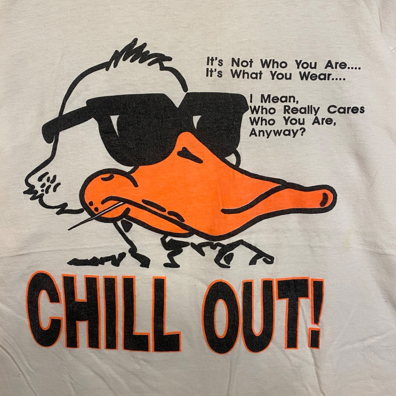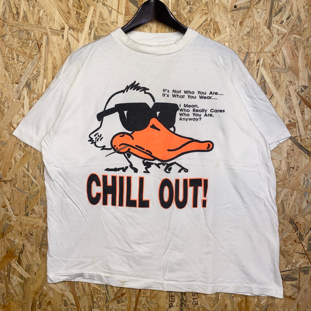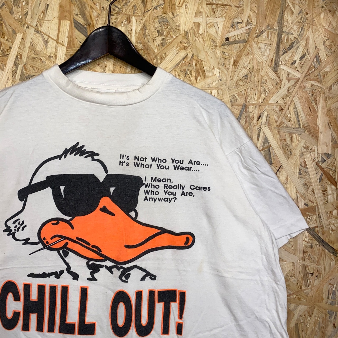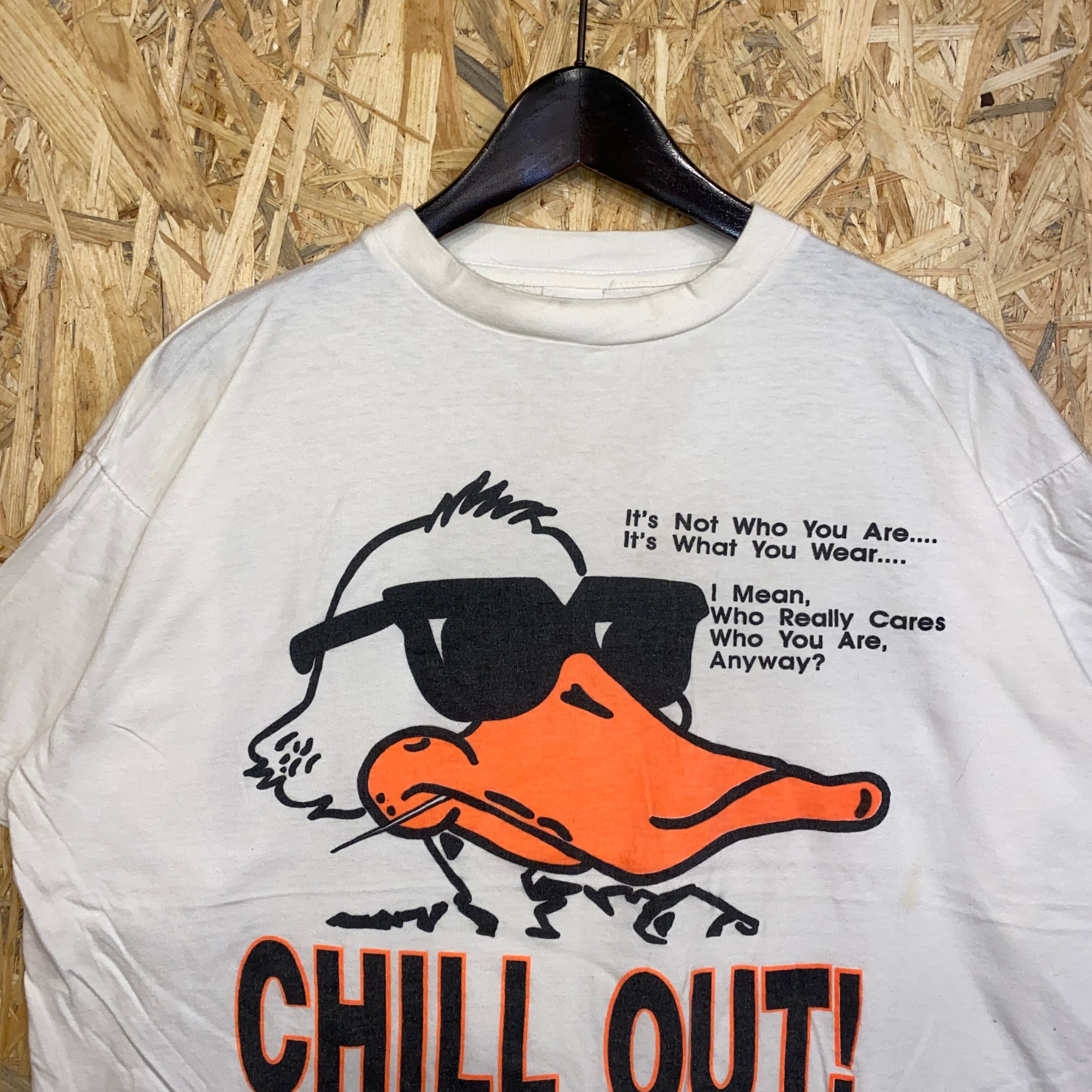 2341 80s 80年代 "CHILL OUT!" ダック プリント Tシャツ グラフィック メッセージ シングルステッチ 白 ホワイト 古着 メンズ vintage