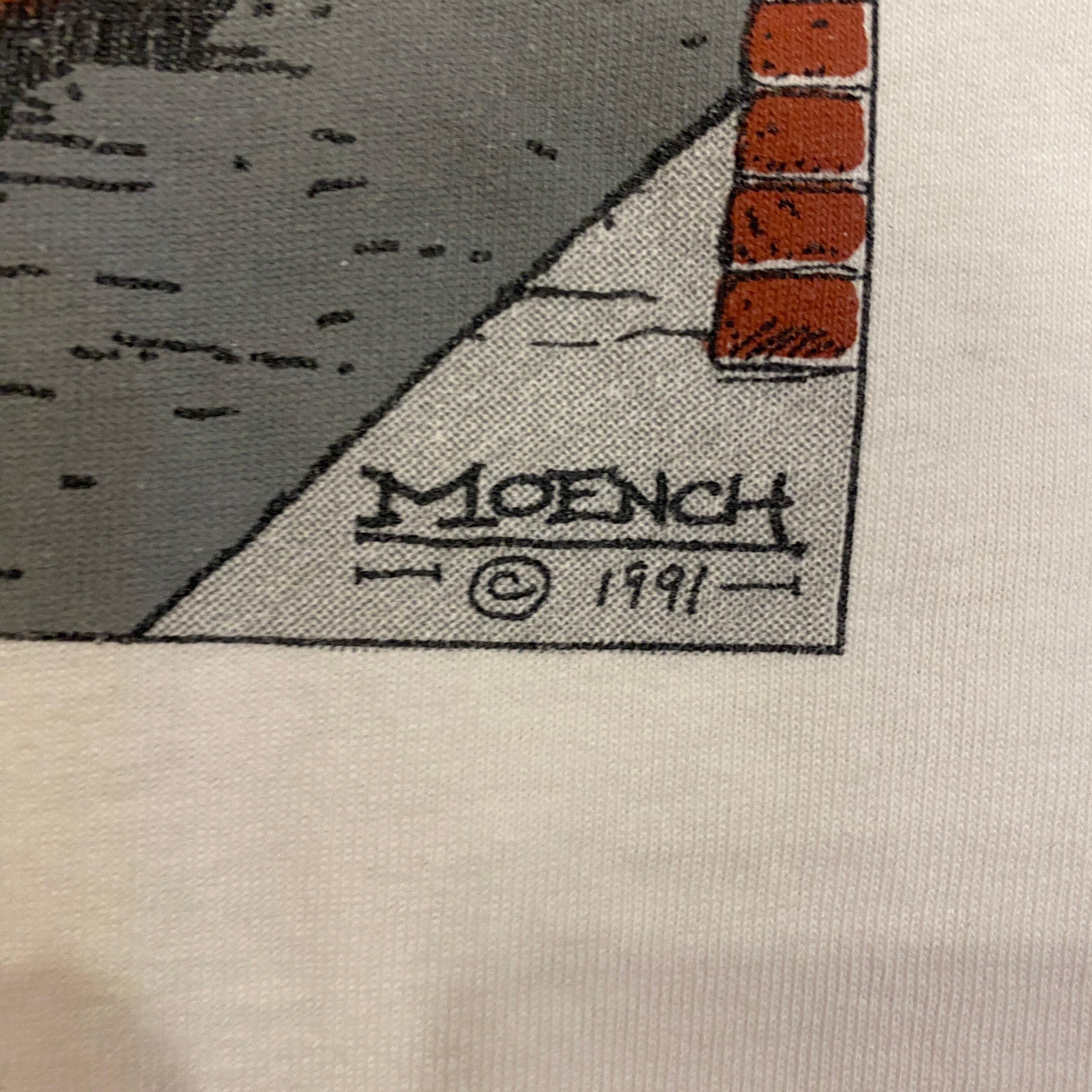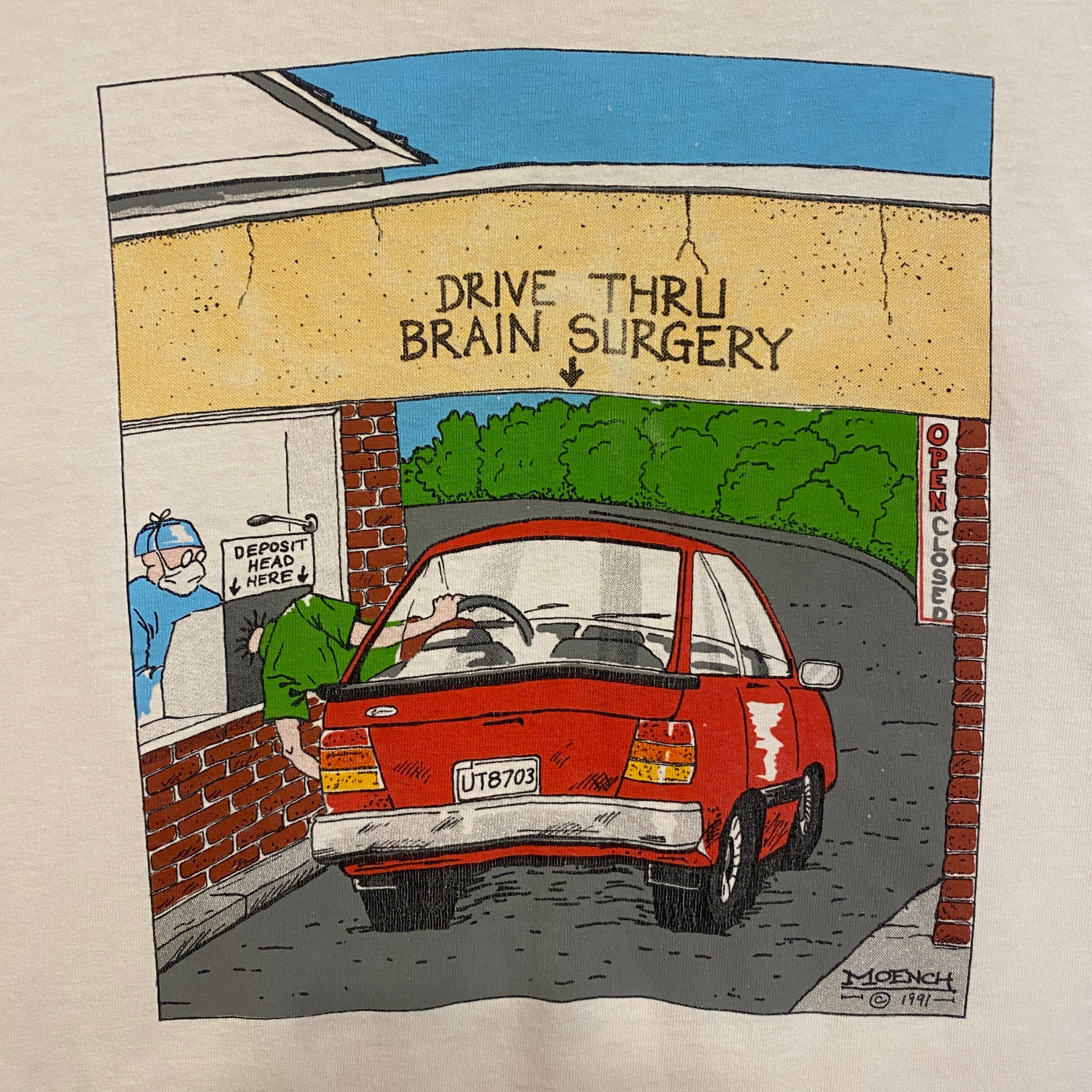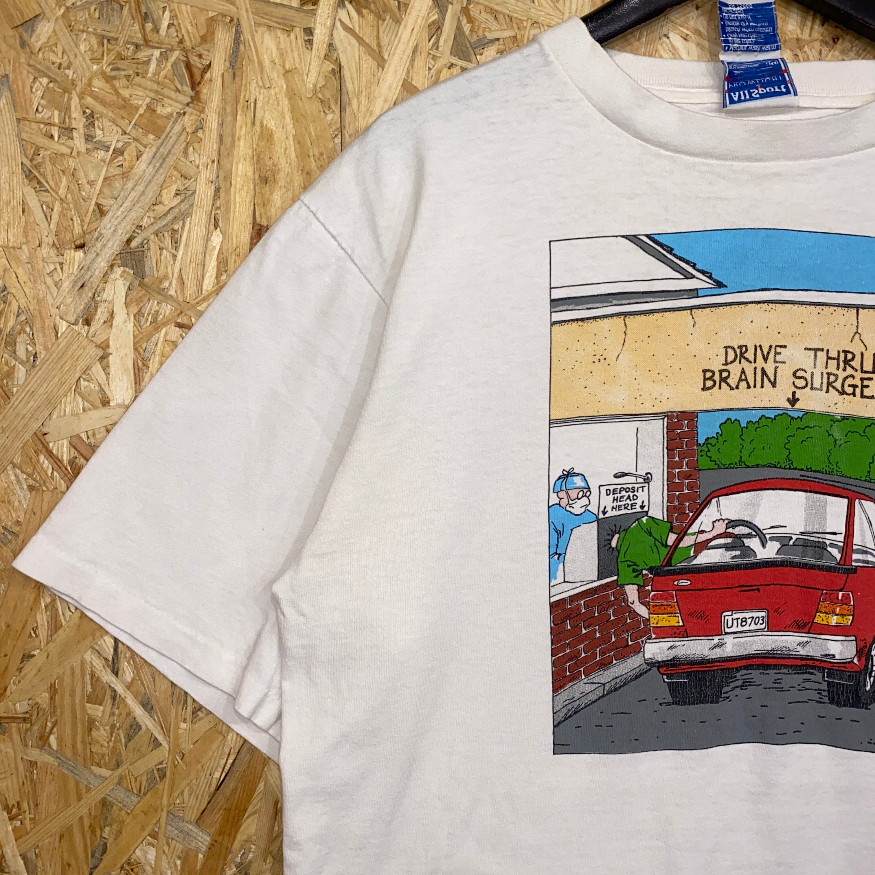 2344 1991s 90年代 USA製 風刺画 アート Tシャツ "DRIVE THRU BRAIN SURGERY" MOENCH グラフィック シングルステッチ 白 ホワイト 古着 メンズ vintage 90s