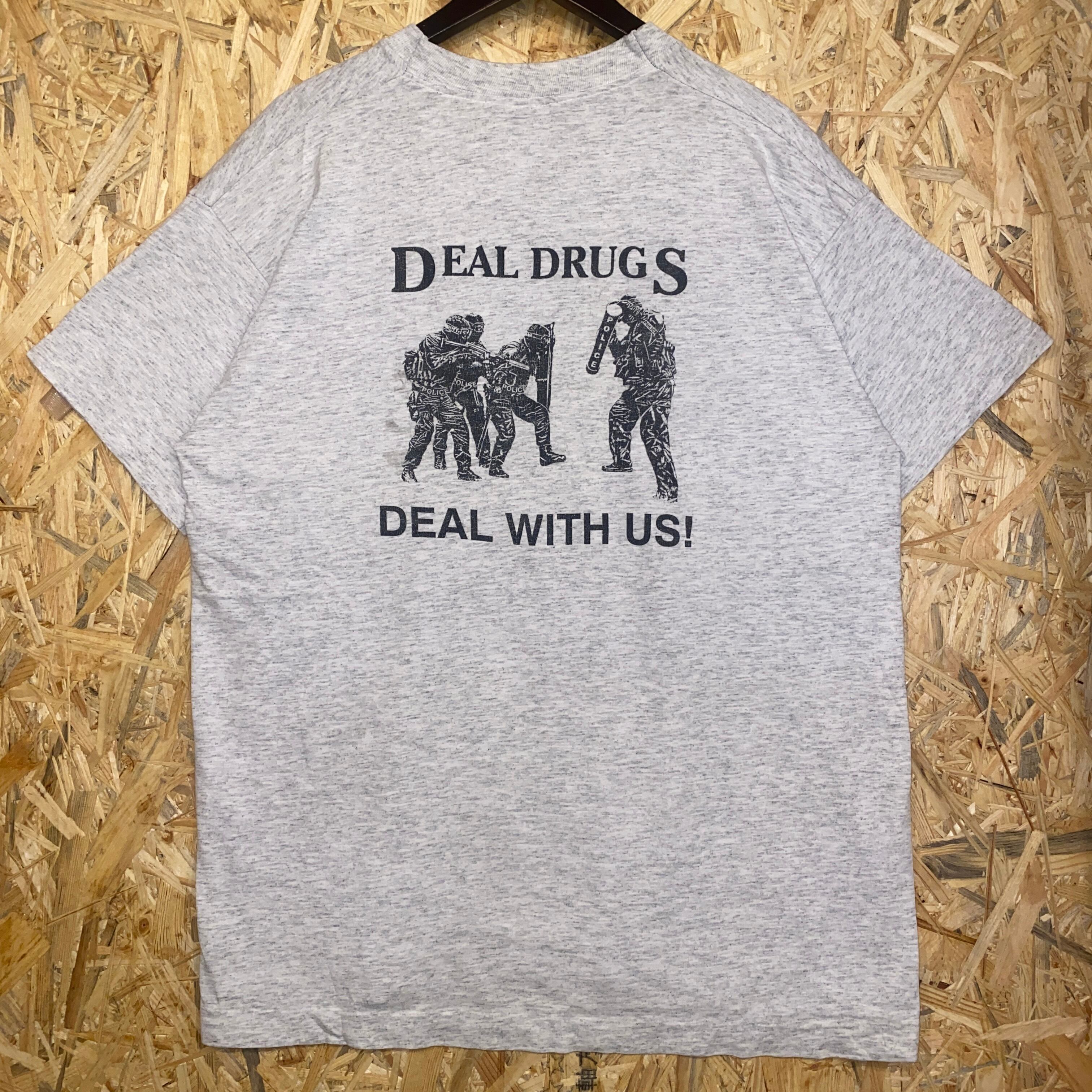 2351 90s 90年代 カナダ製 両面 プリント Tシャツ DEAL DRUGS DEAL WITH US! グラフィック メッセージ グレー シングルステッチ 古着 メンズ vintage