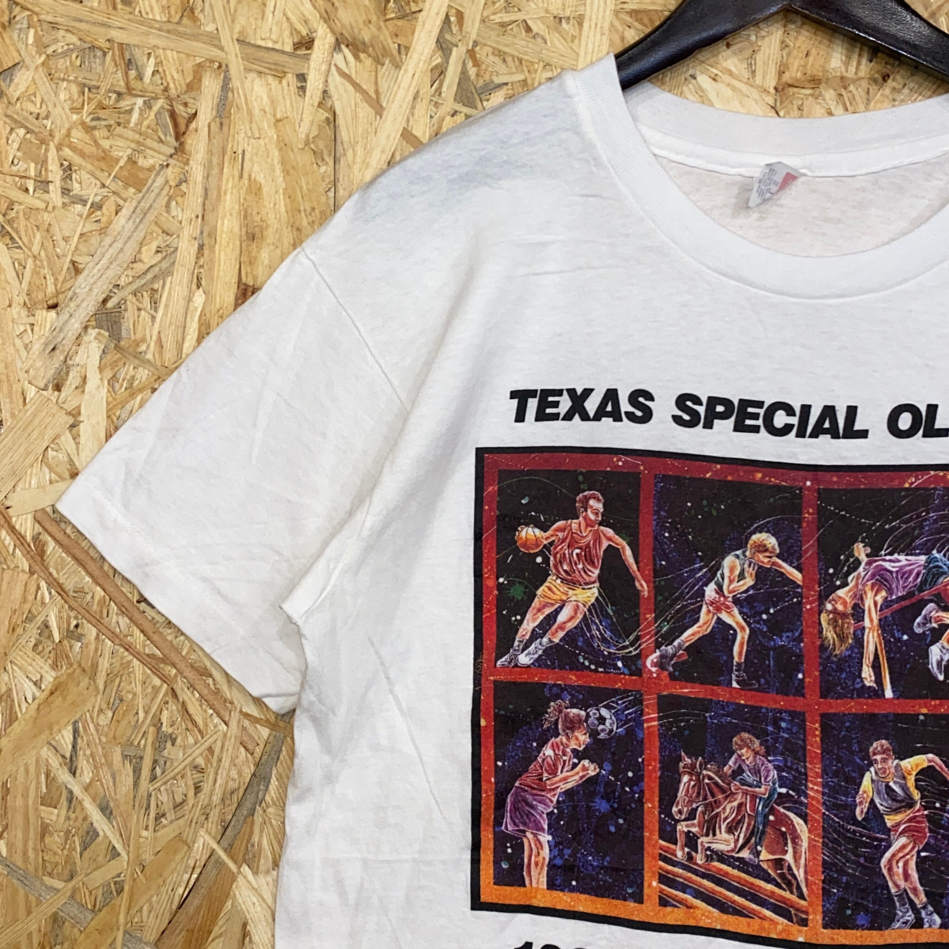 2370 80s〜 80年代〜 USA製 スポーツ イラスト Tシャツ テキサススペシャルオリンピックス 陸上 バスケ 乗馬 シングルステッチ Hanes ホワイト 白 古着 メンズ vintage