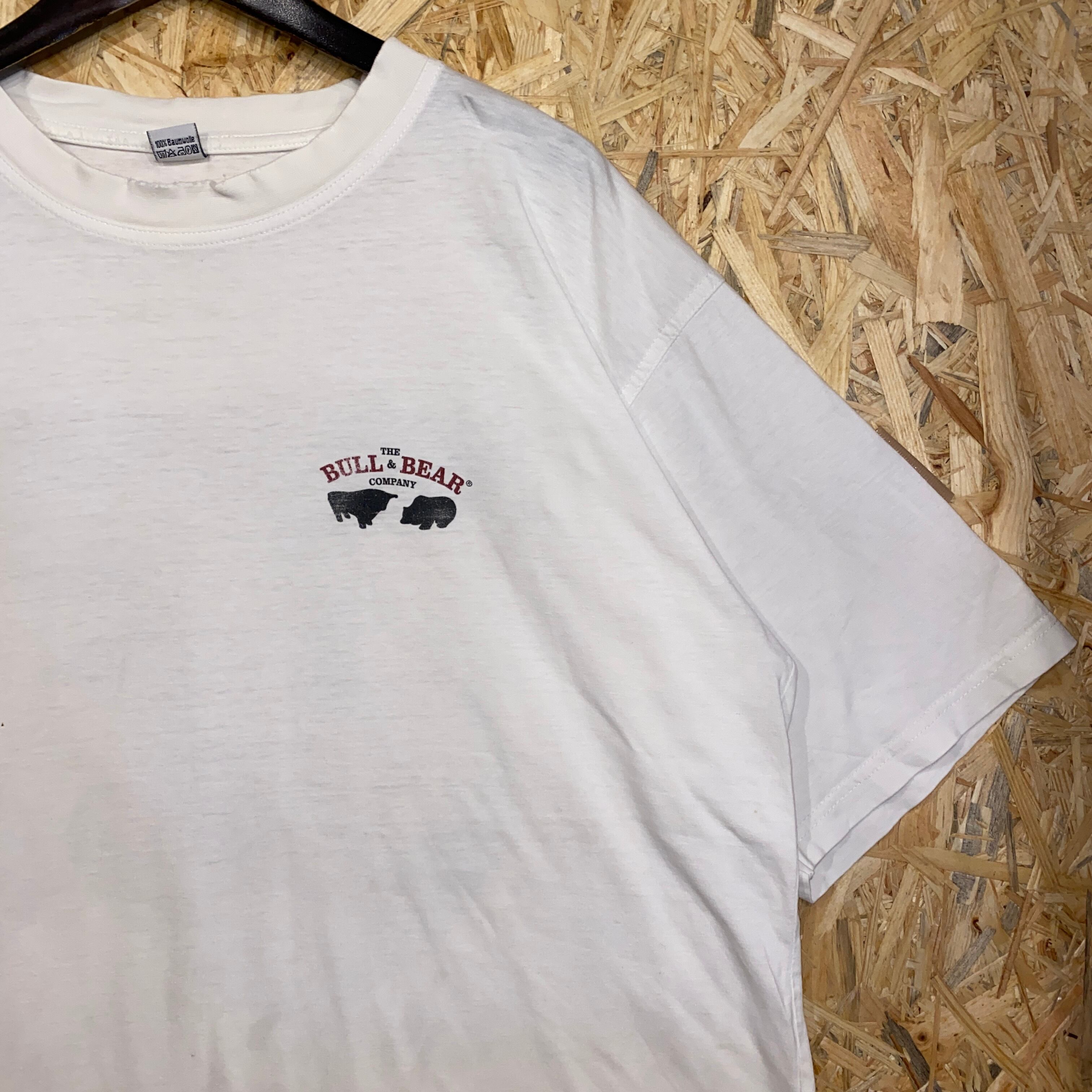 2383 BULL&BEAR 金融 市場 強気 弱気 企業ロゴ イラスト Tシャツ 牛 熊 アニマル ユーモラス ホワイト 白 古着 メンズ vintage