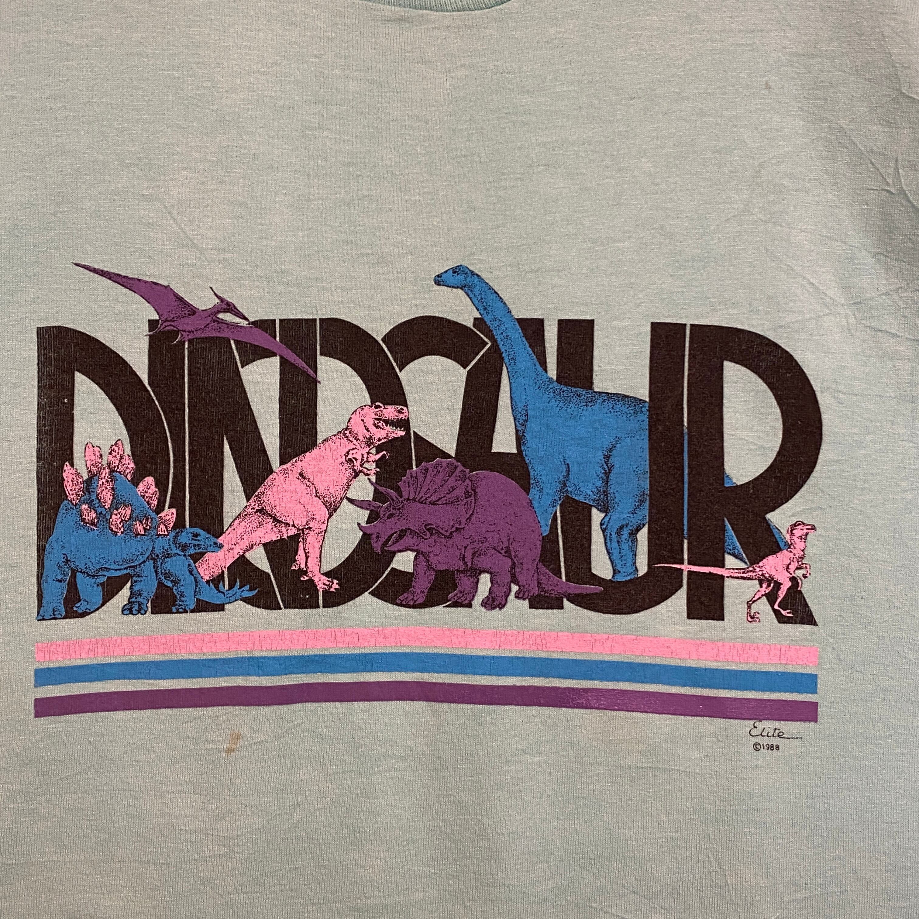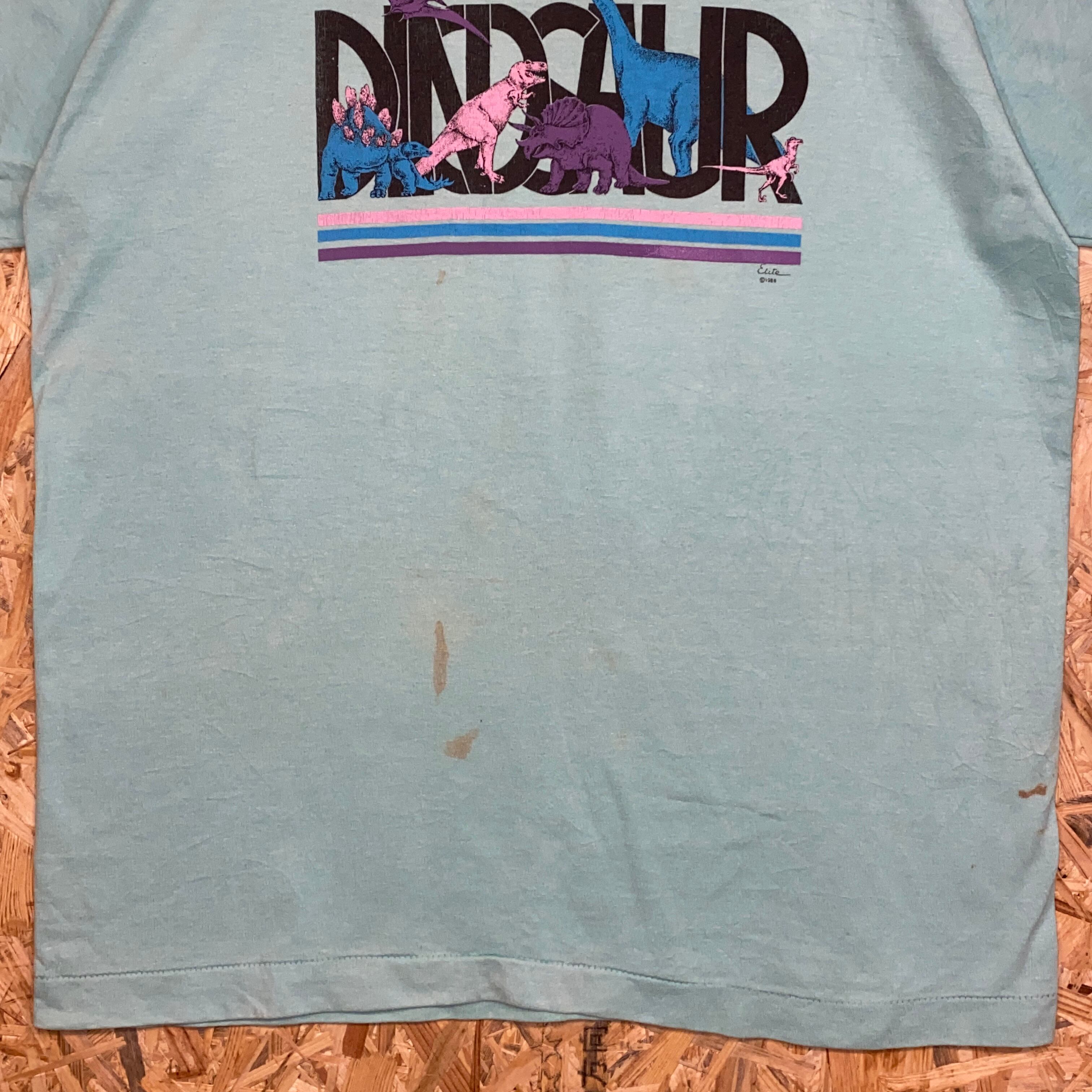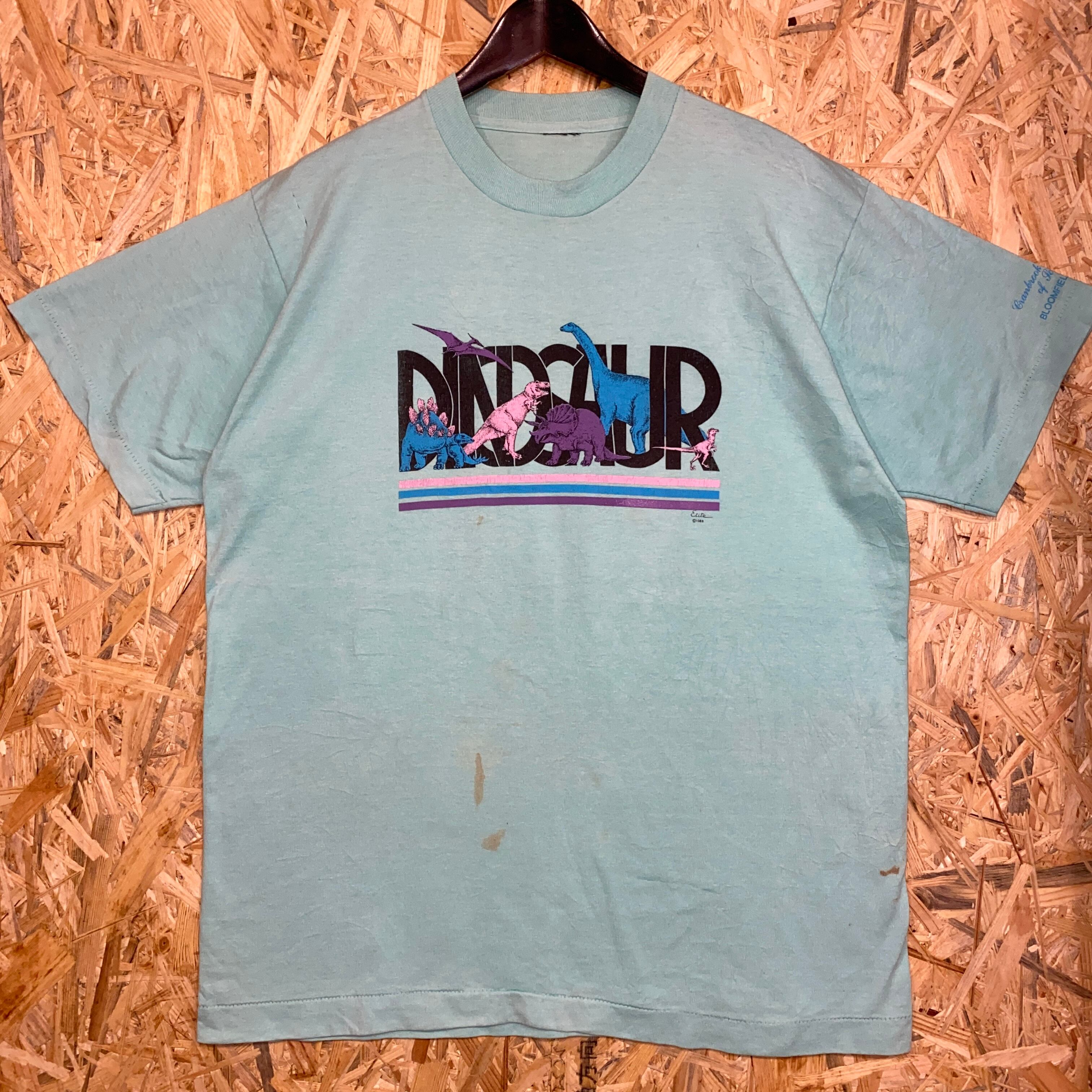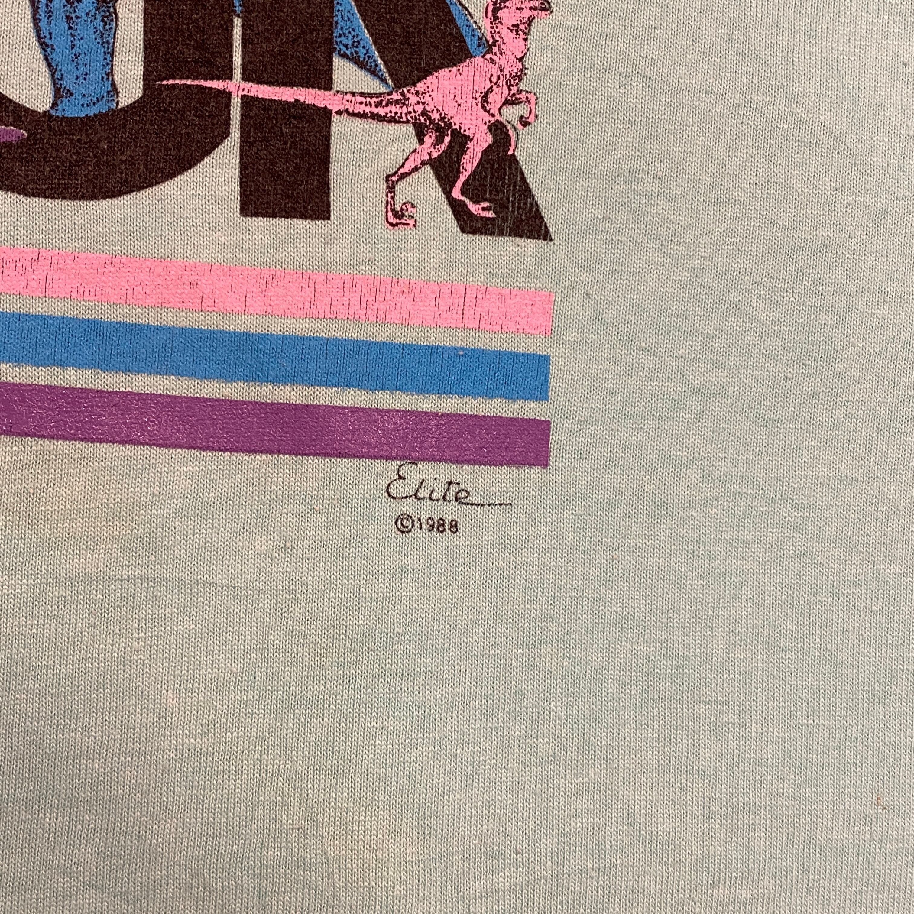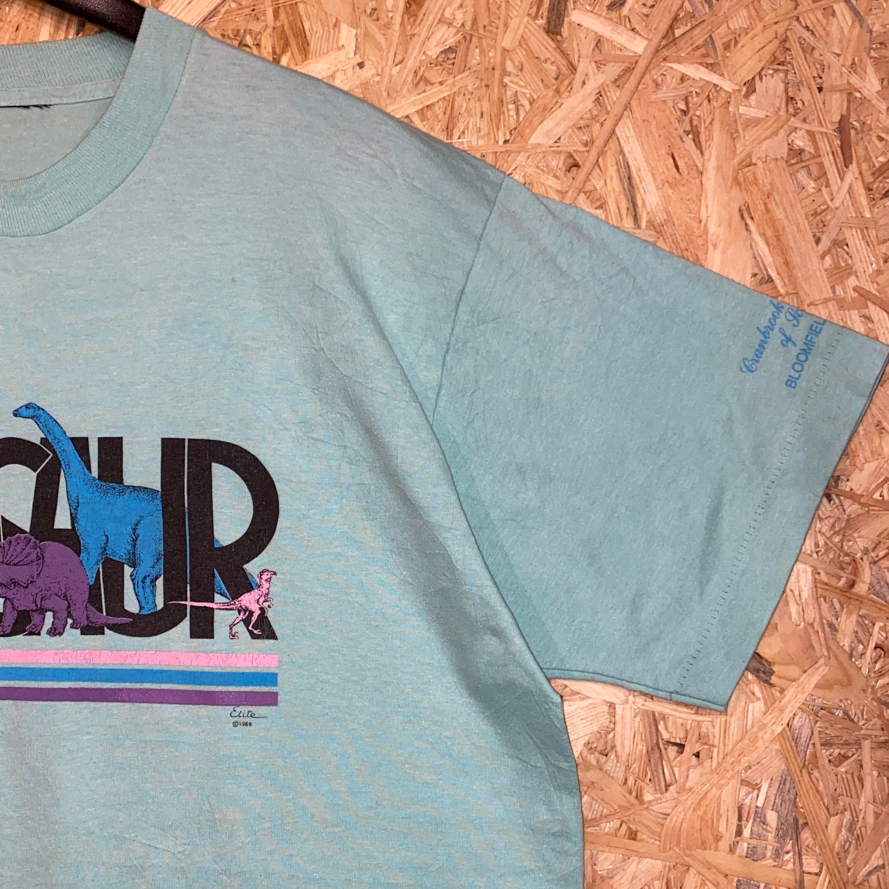 2432 80s 80年代 Elite グラフィック プリント Tシャツ 恐竜 アニマル 科学 ミシガン州 ライトブルー シングルステッチ 古着 メンズ vintage