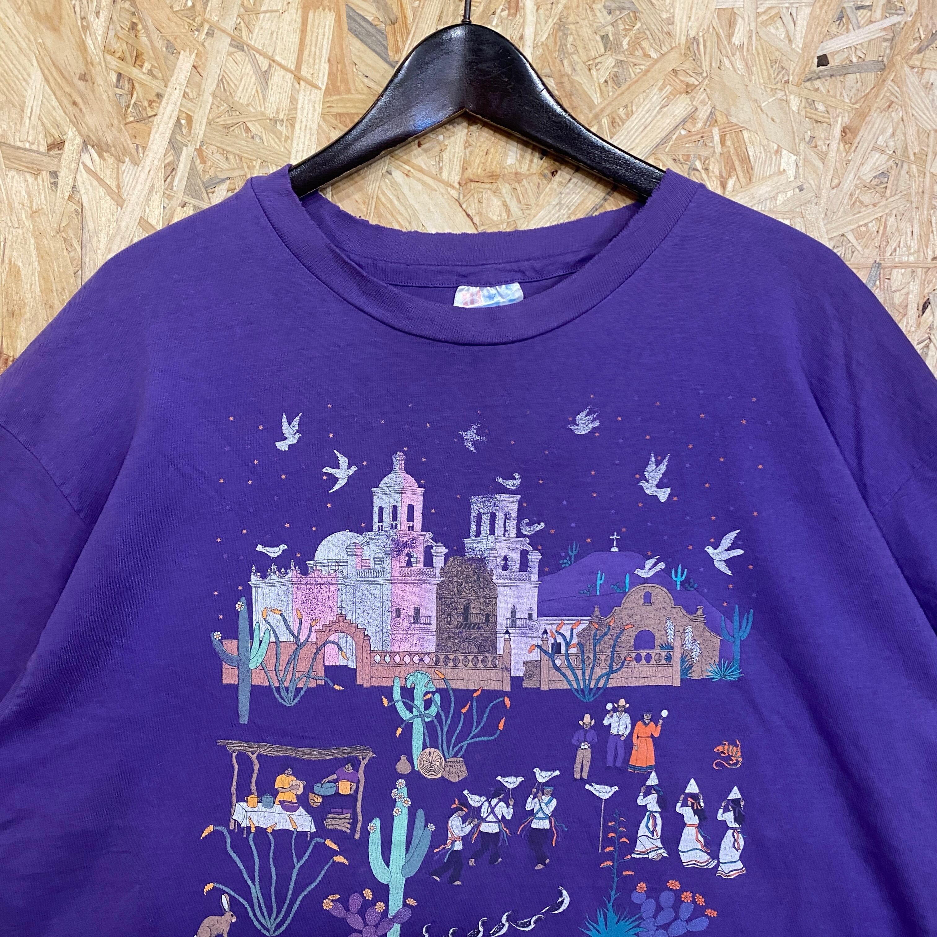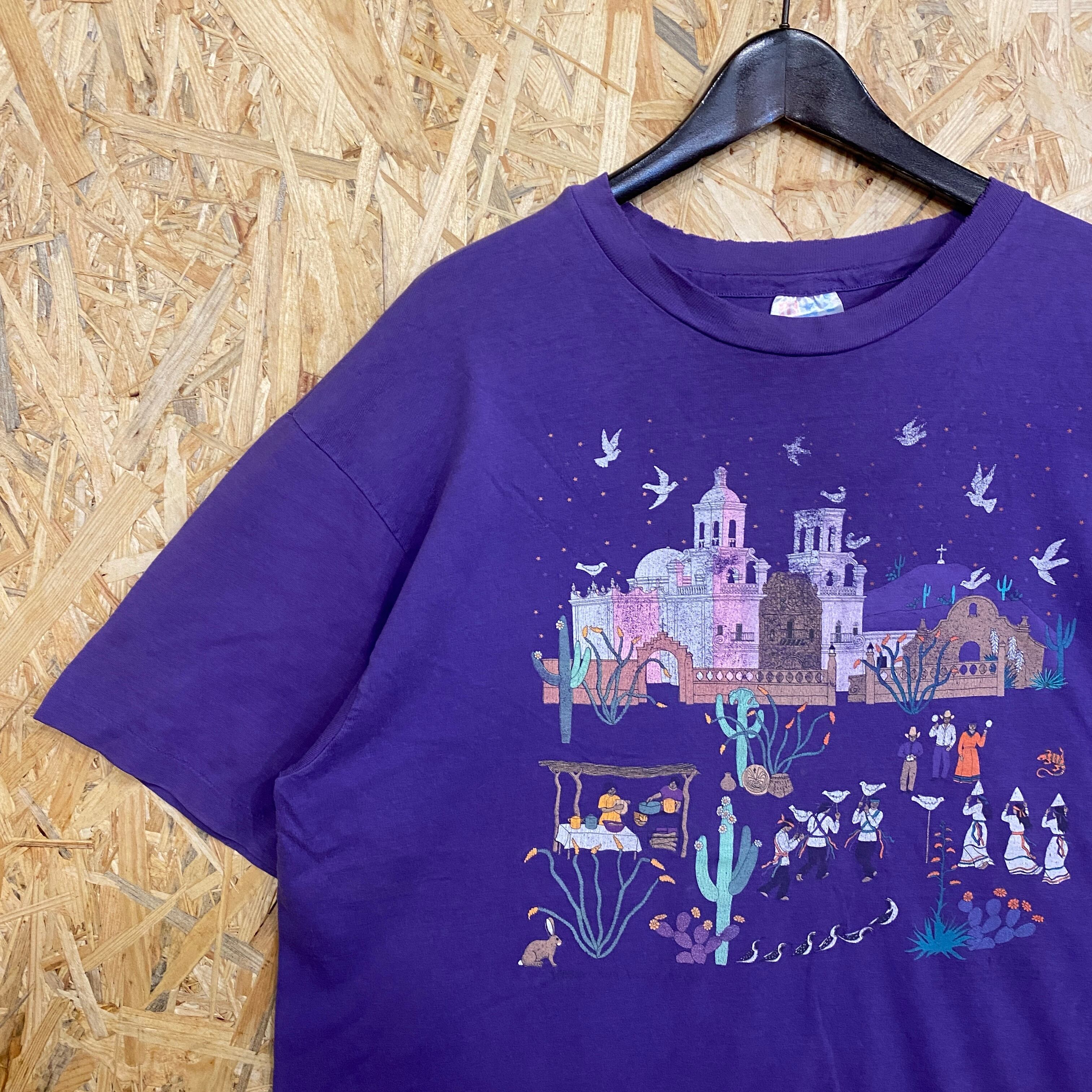 2472 90s 90年代 USA製 スペイン カルチャー イラスト Tシャツ アート アニマル 自然 シングルステッチ 紫 パープル 古着 メンズ vintage
