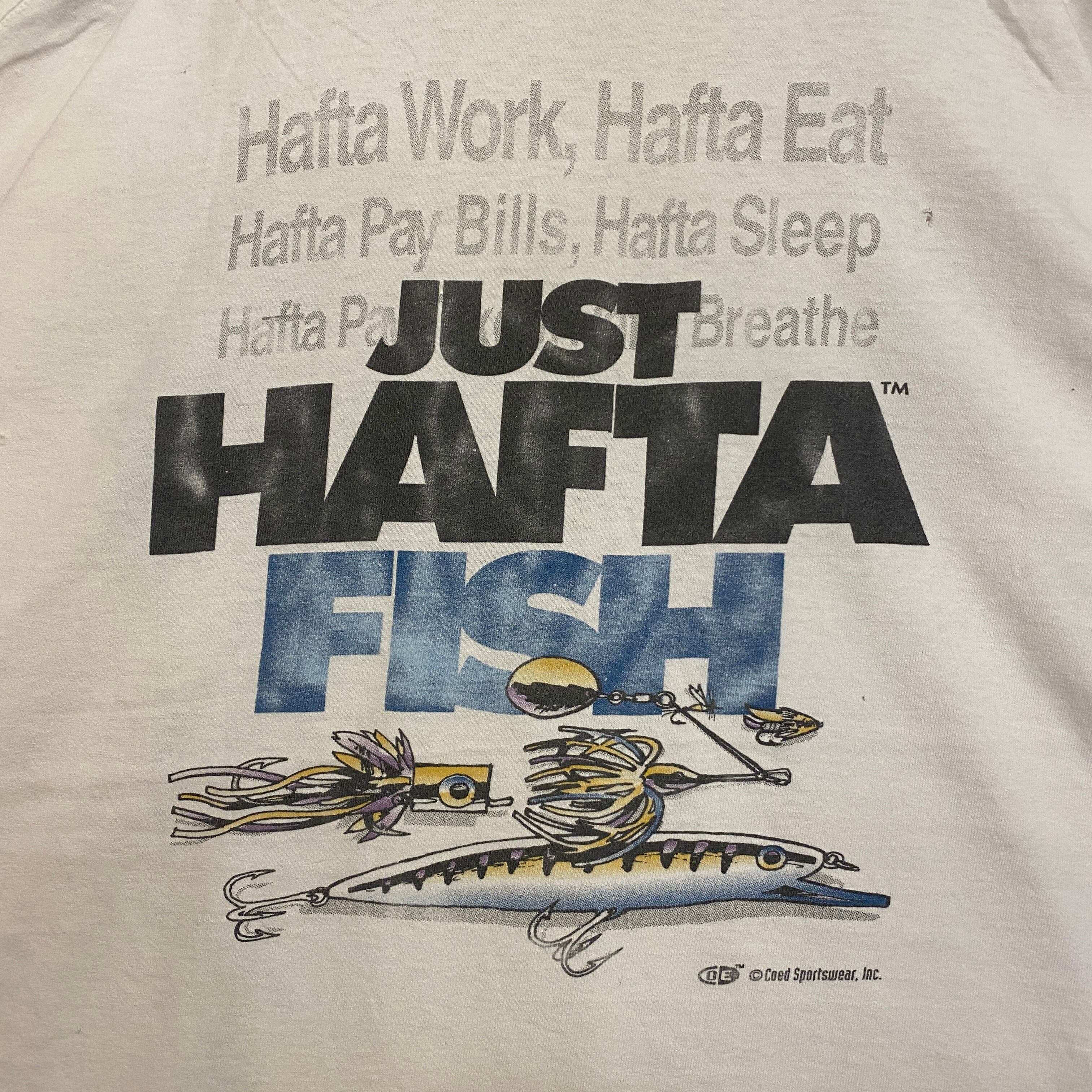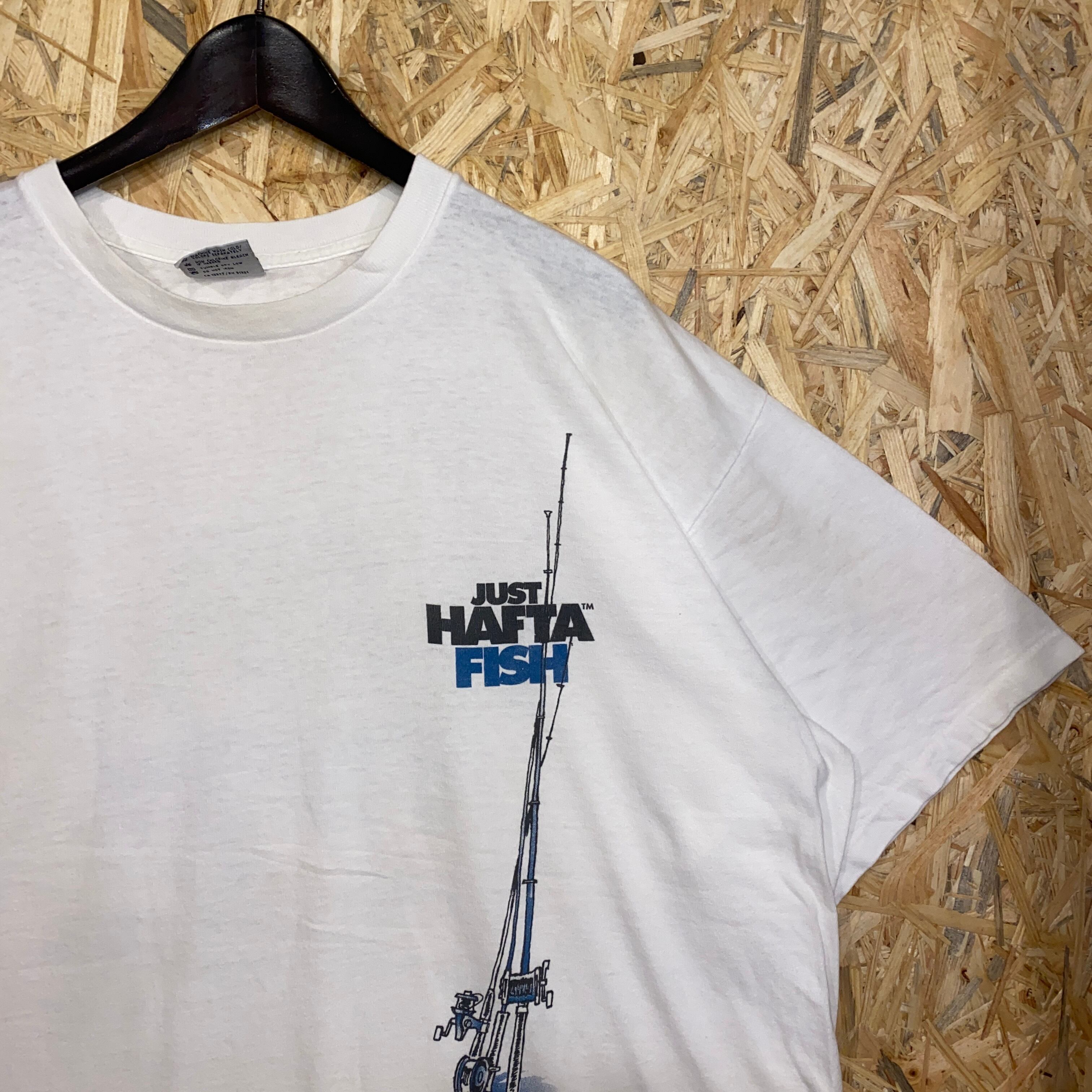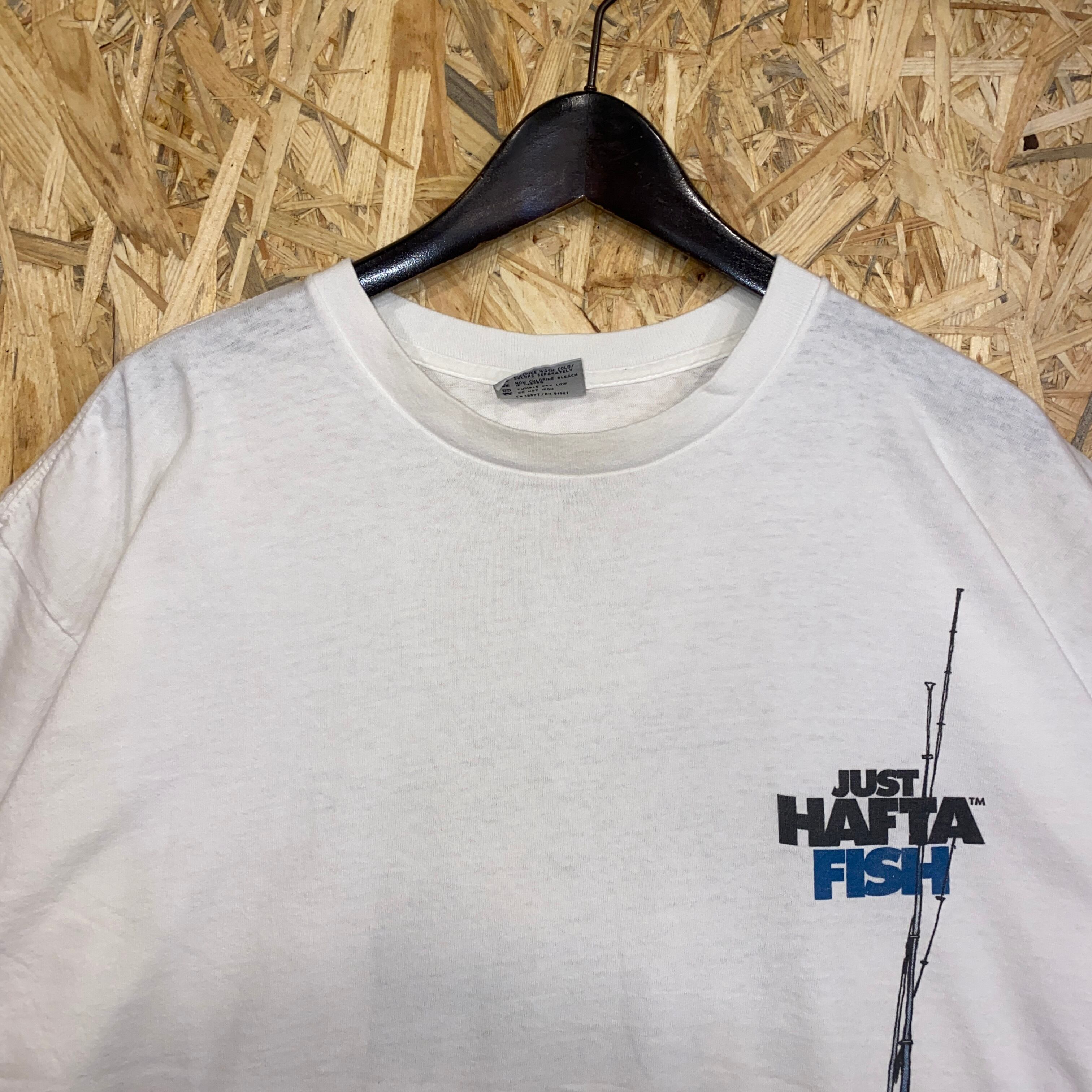2493 90s 90年代 USA製 JUST HAFTA FISH フィッシング Tシャツ 釣り タックル アウトドア 両面 プリント シングルステッチ 白 ホワイト 古着 メンズ vintage