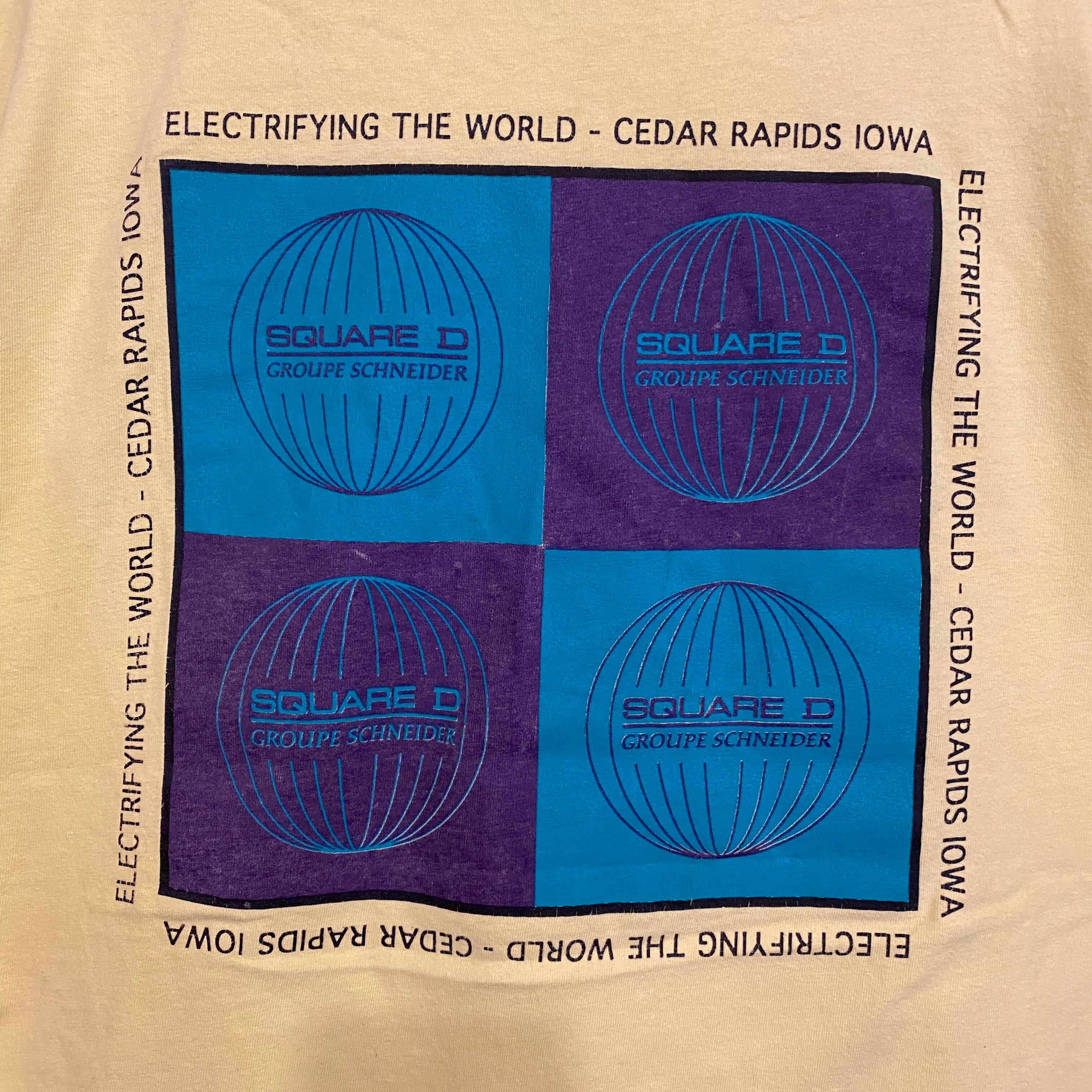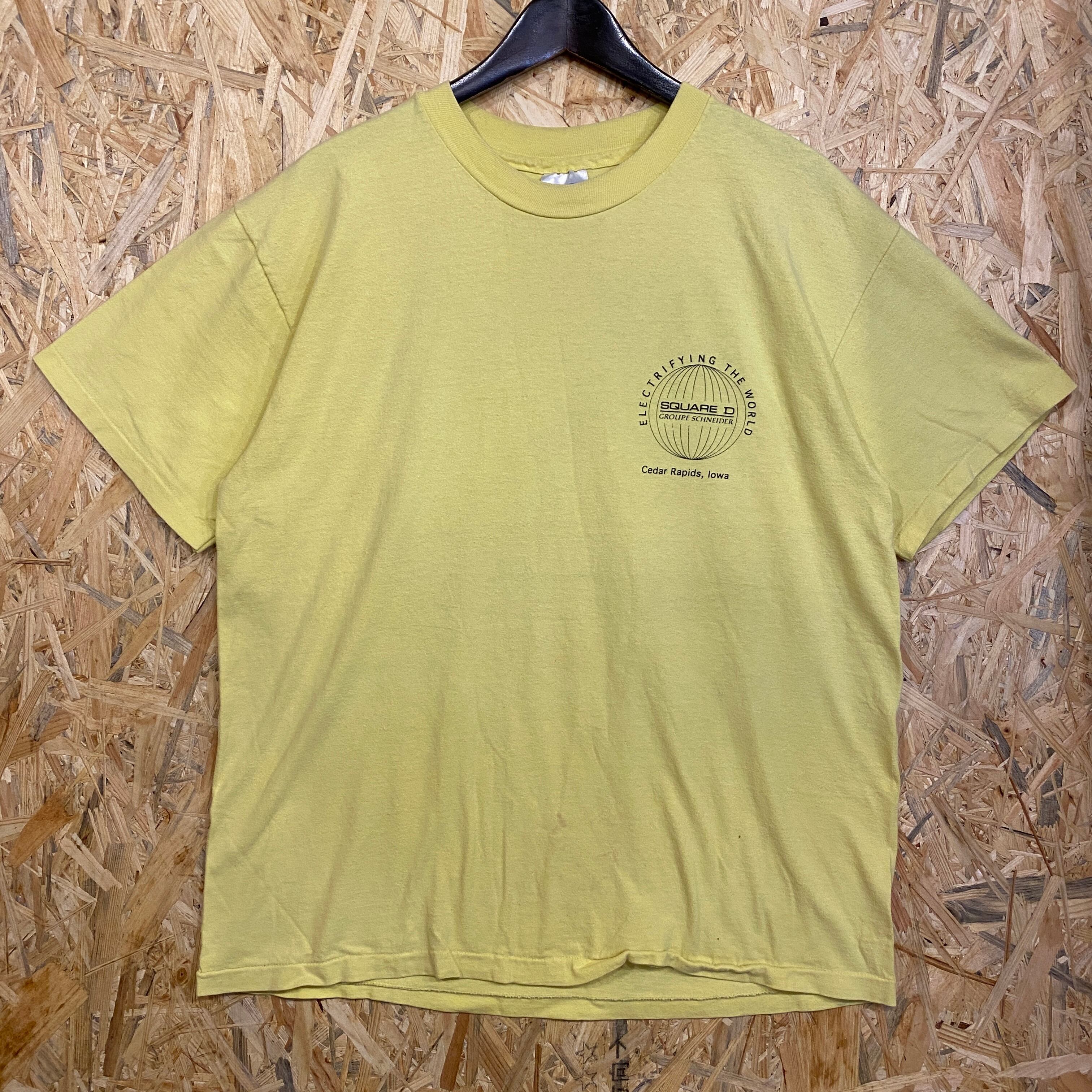 2507 90s 90年代 シングルステッチ Hanes ハーネス SQUARED 地球儀 電気機器 黄色Tシャツ 両面プリント プリントTシャツ 古着 メンズ vintage
