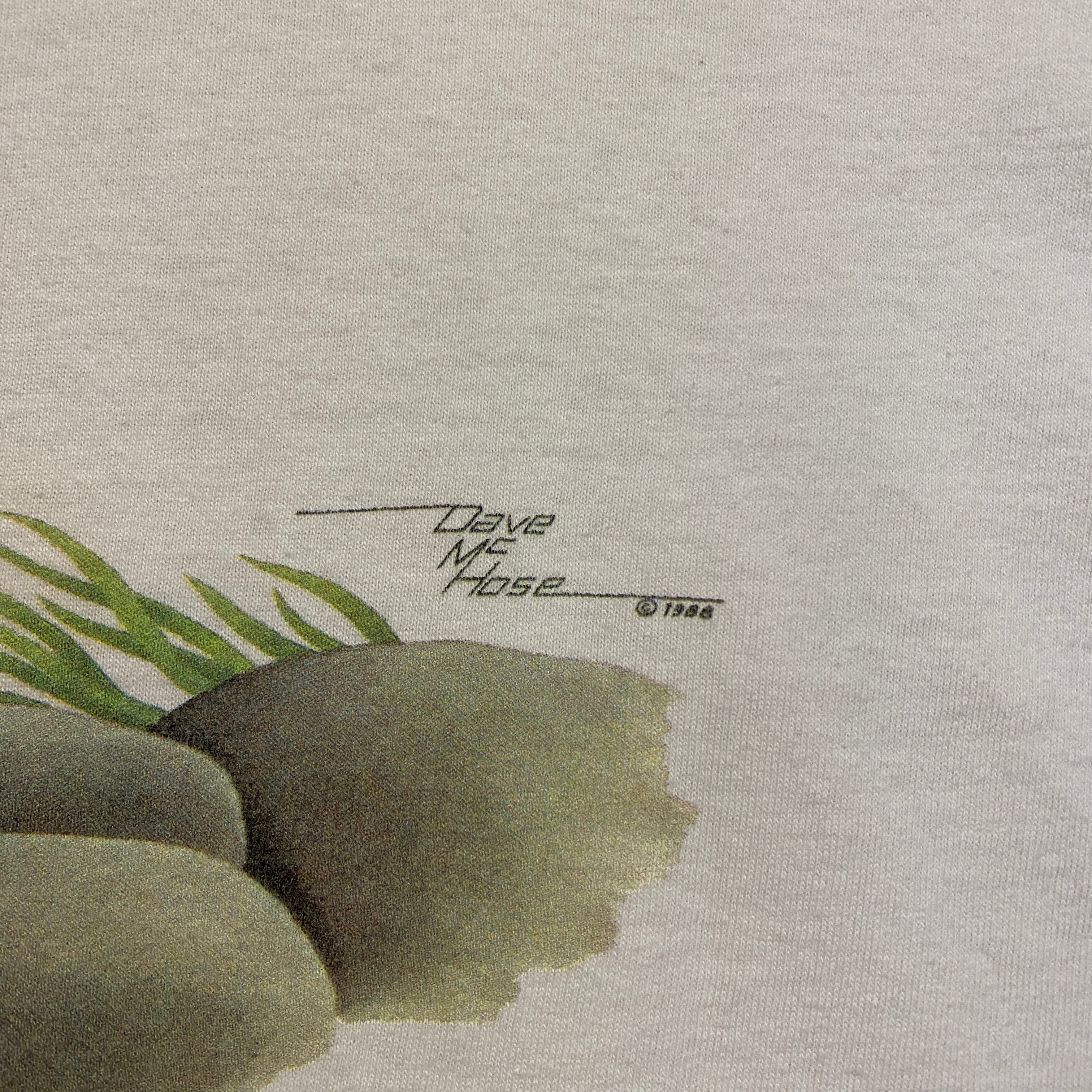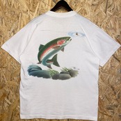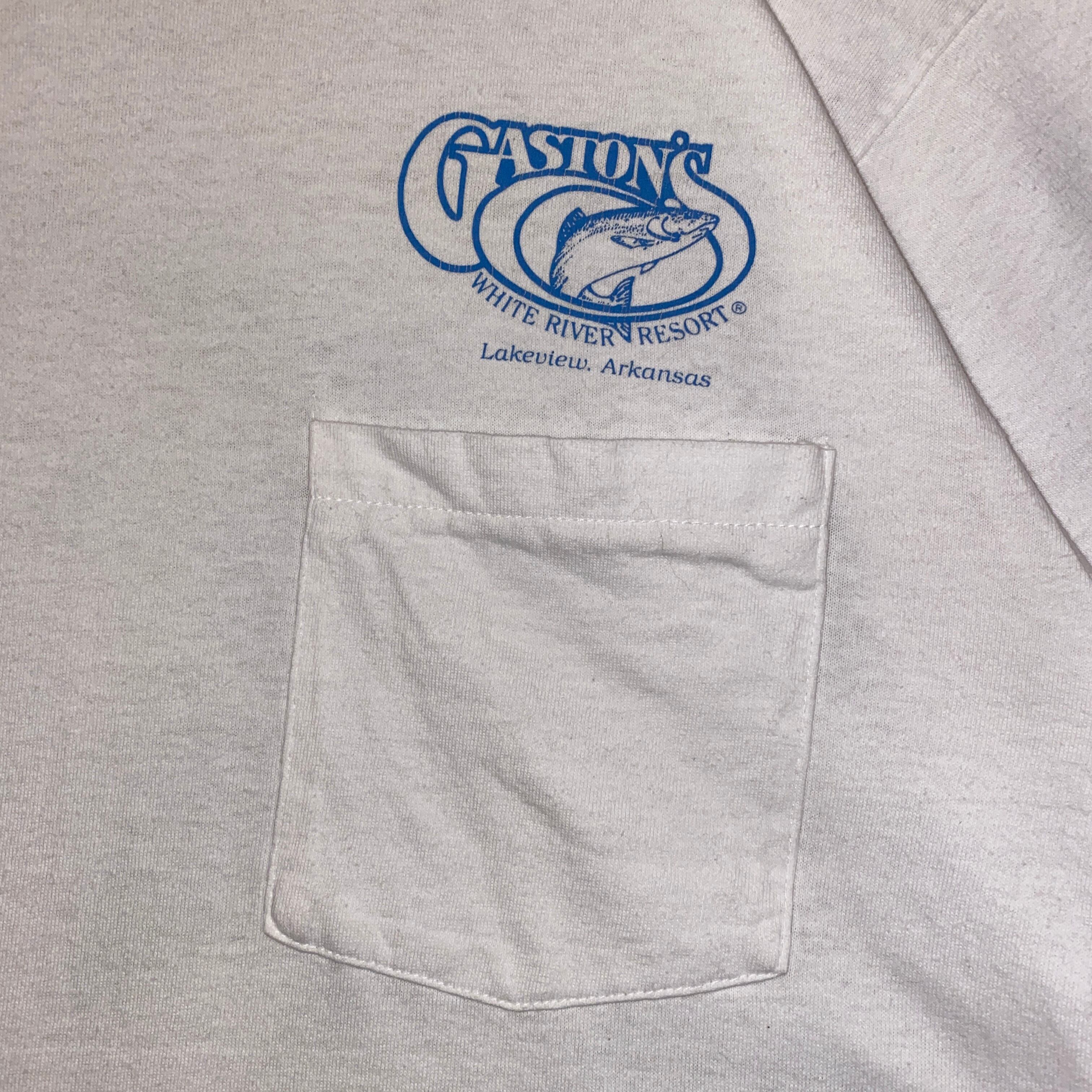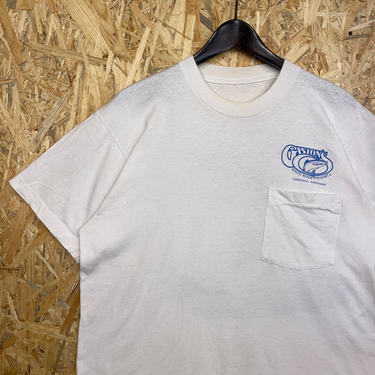 2518 1986s 80年代 トラウト フィッシング スーベニア Tシャツ 魚 釣り 両面 プリント 胸ポケット アウトドア ガストンホワイトリバー リゾート シングルステッチ 白 ホワイト 古着 メンズ vintage 80s