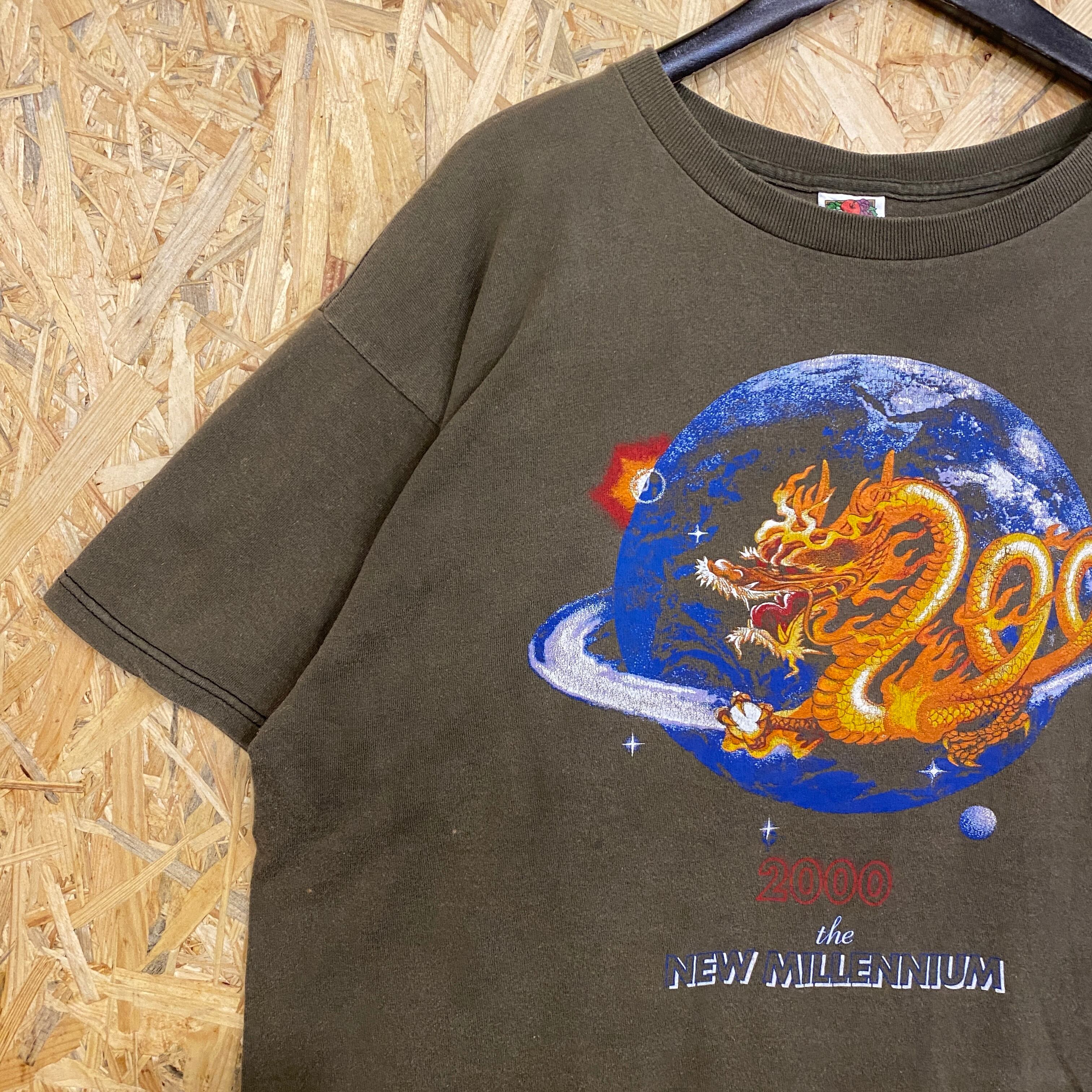2528 90s〜 90年代〜 FRUIT OF THE ROOM グラフィック プリント Tシャツ 龍 宇宙 ドラゴン ダークグレー 古着 メンズ vintage