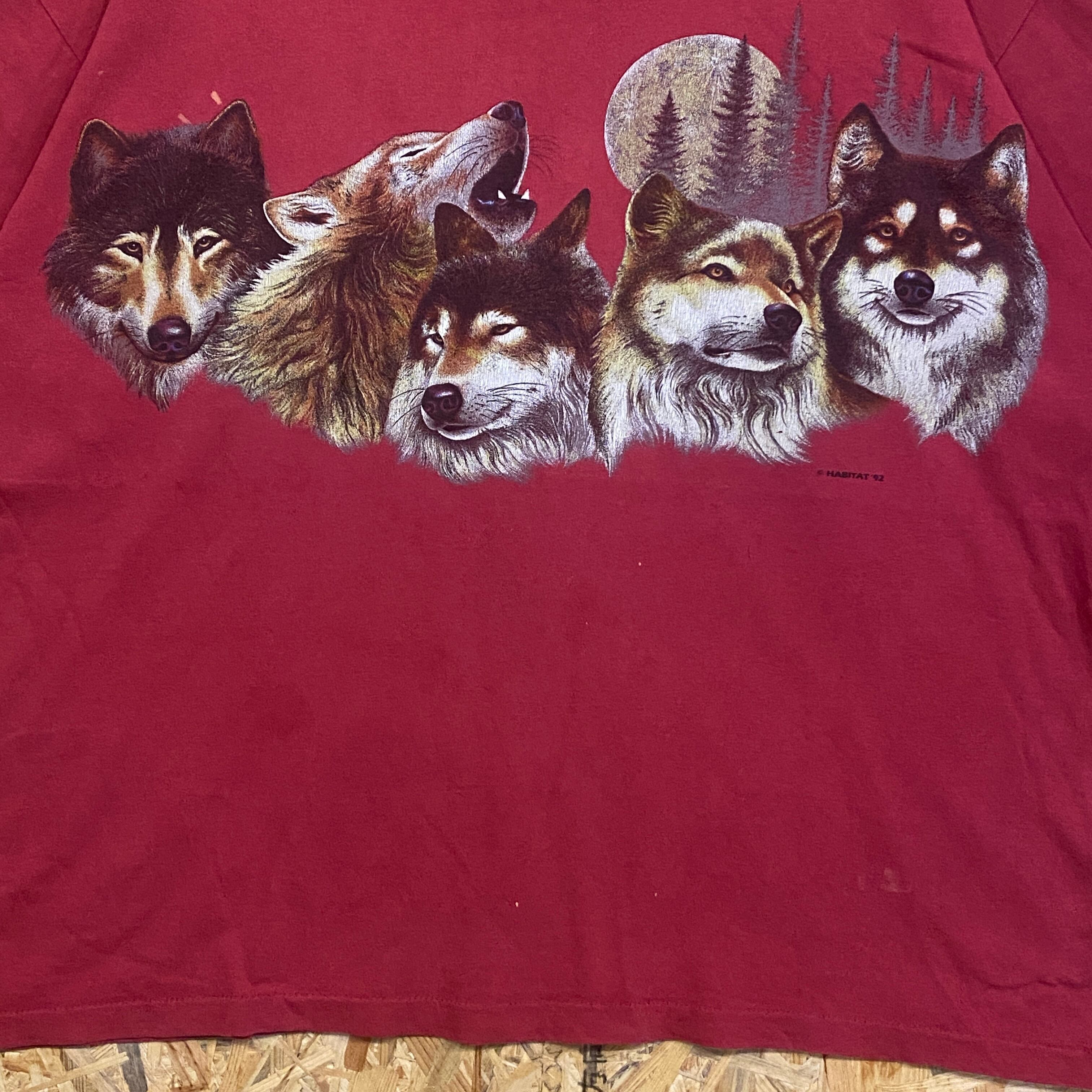 2544 1992年 USA製 SIGNAL “Five Wolves Moonlight” オオカミムーン Tシャツ シングルステッチ 赤 古着 メンズ vintage 90s 90年代