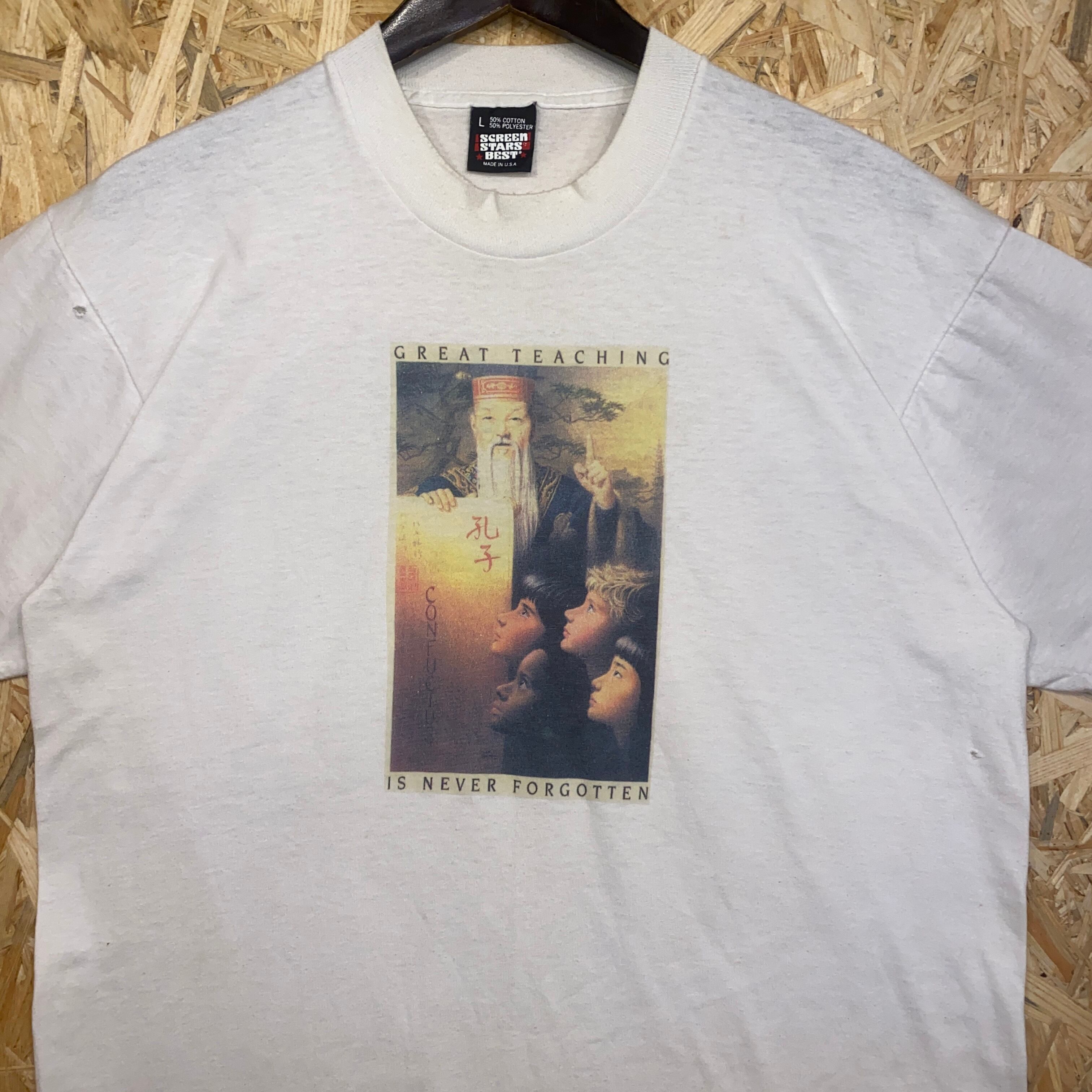 2559 90s 90年代 USA製 孔子 イラスト Tシャツ 哲学者 中国 宗教 写真 フォトT シングルステッチ ホワイト 白 スクリーンスターズ 古着 メンズ vintage