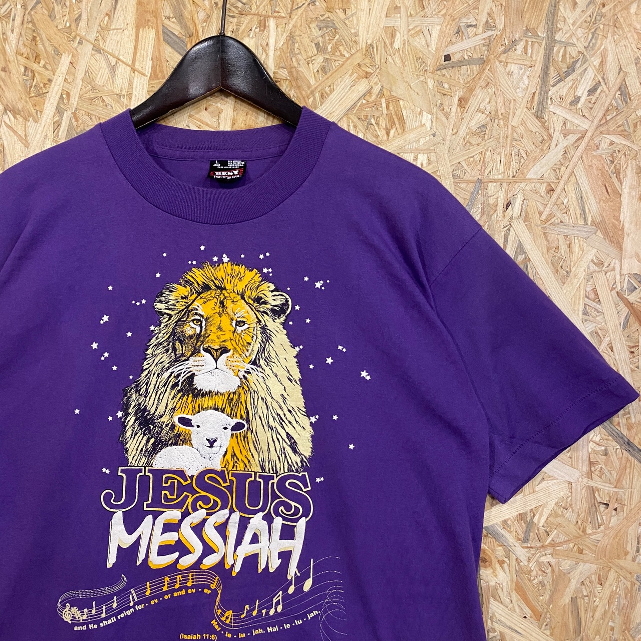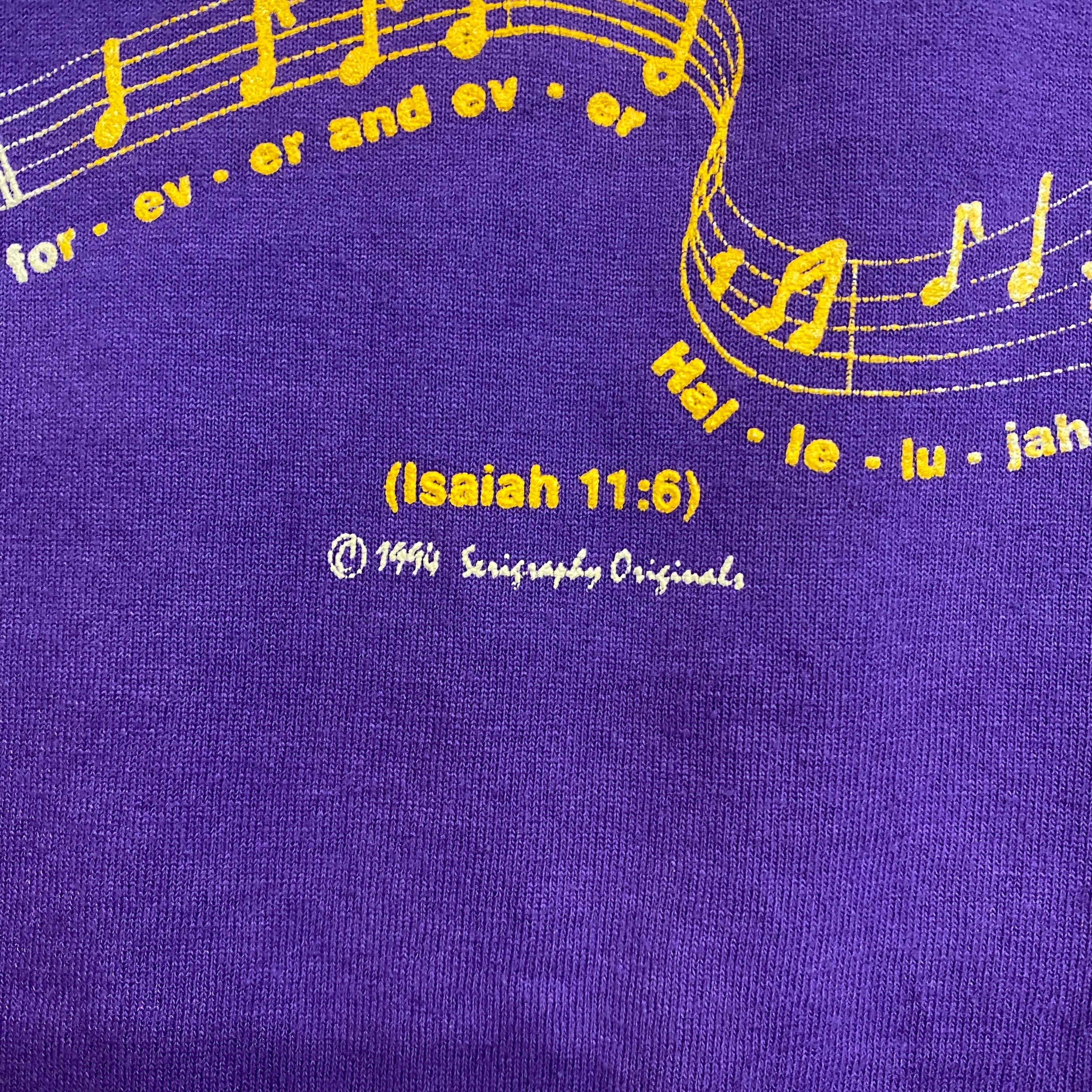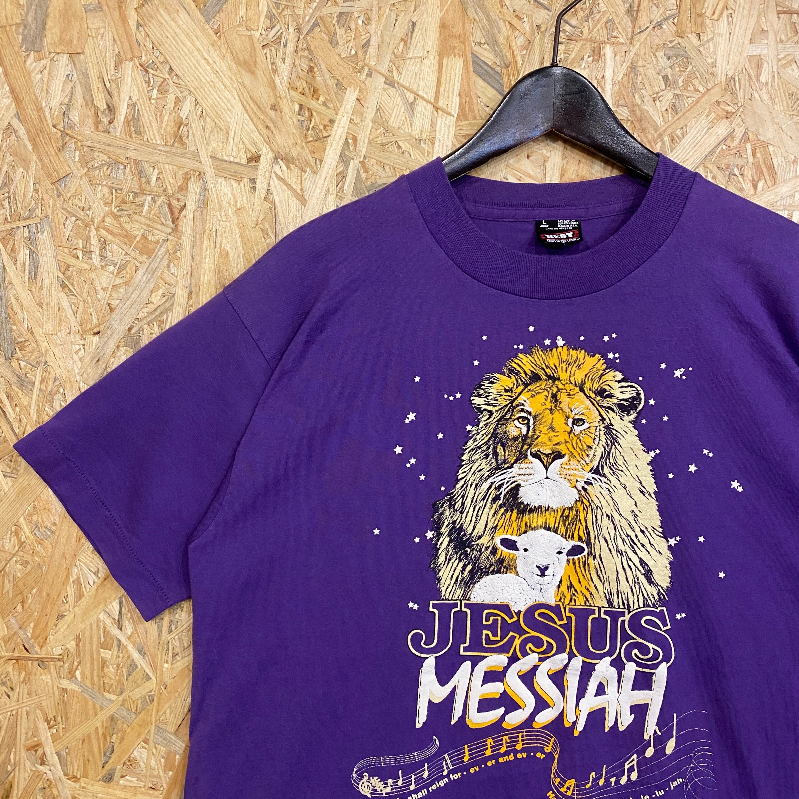 2651 1994s 90年代 USA製 ライオン 子羊 アニマル プリント Tシャツ "JESUS MESSIAH" キリスト教 旧約聖書 イザヤ書 両面 プリント シングルステッチ 紫 パープル 古着 メンズ vintage 90s