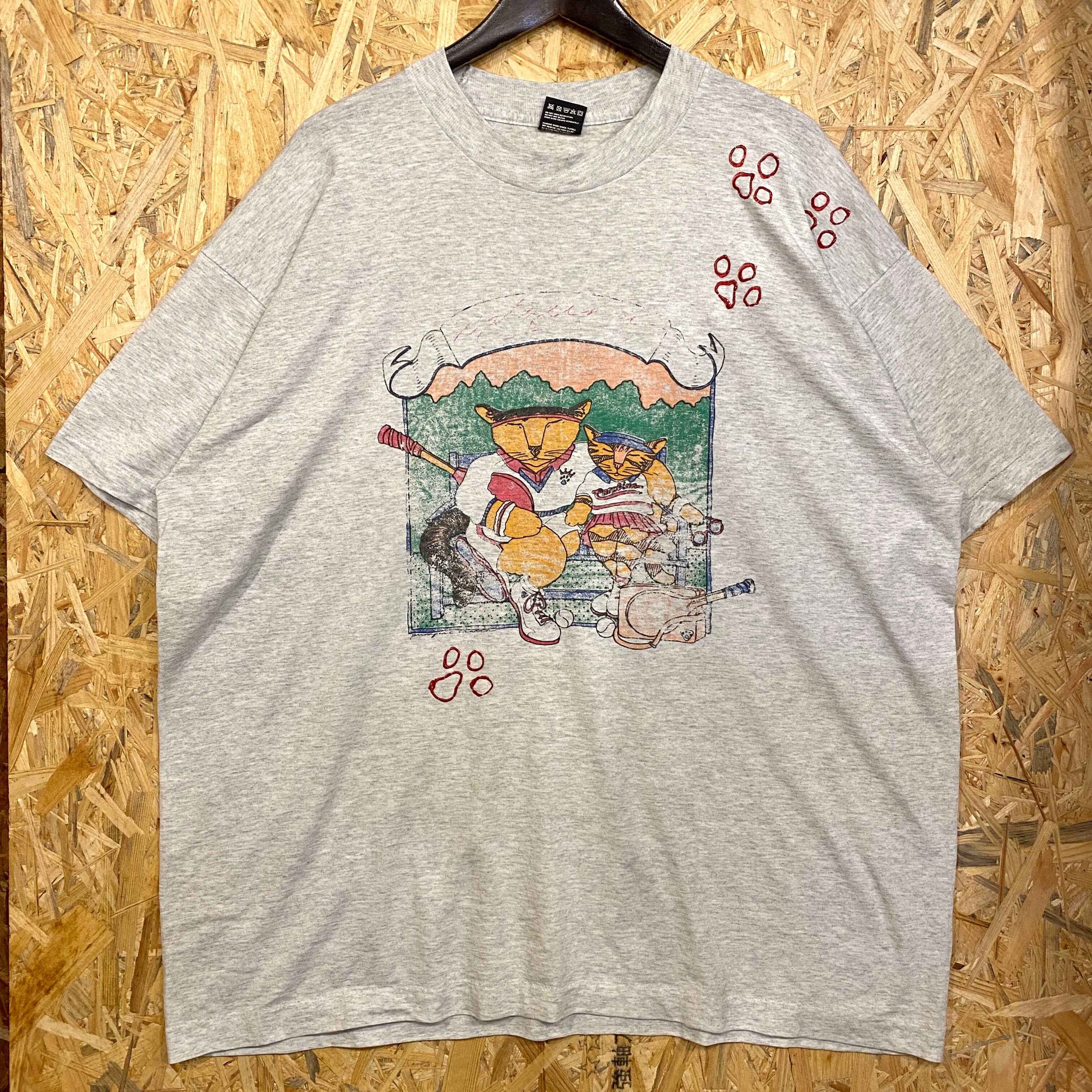 2677 90s 90年代 USA製 猫 アニマル Tシャツ レトロ スポーツ テニス 肉球 グレー シングルステッチ フルーツオブザルーム 古着 メンズ vintage