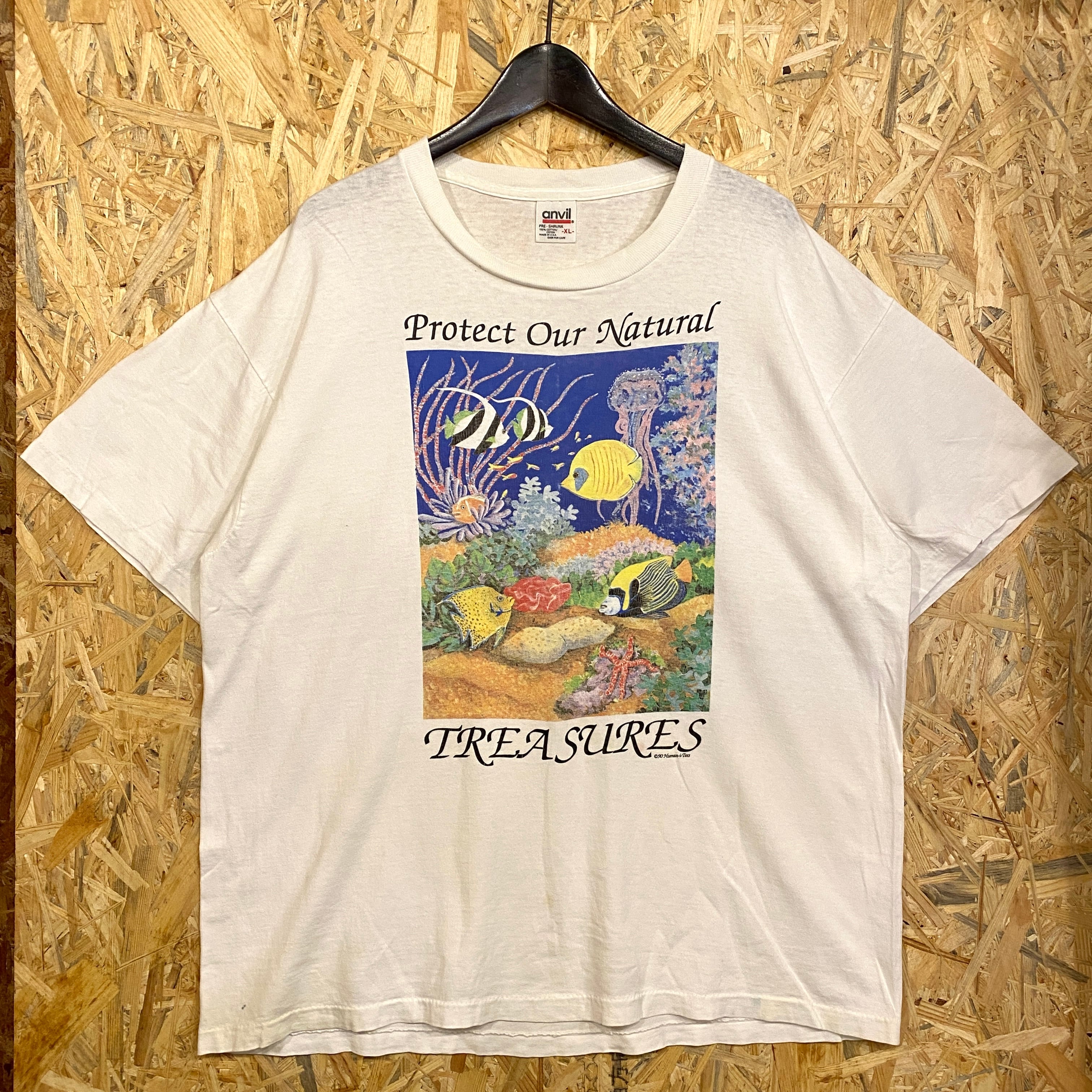 2685 90s 90年代 シングルステッチ USA製 anvilアンヴィル 海 魚 海月 珊瑚 海洋生物 グラフィック プリントTシャツ 白Tシャツ 古着 メンズ vintage