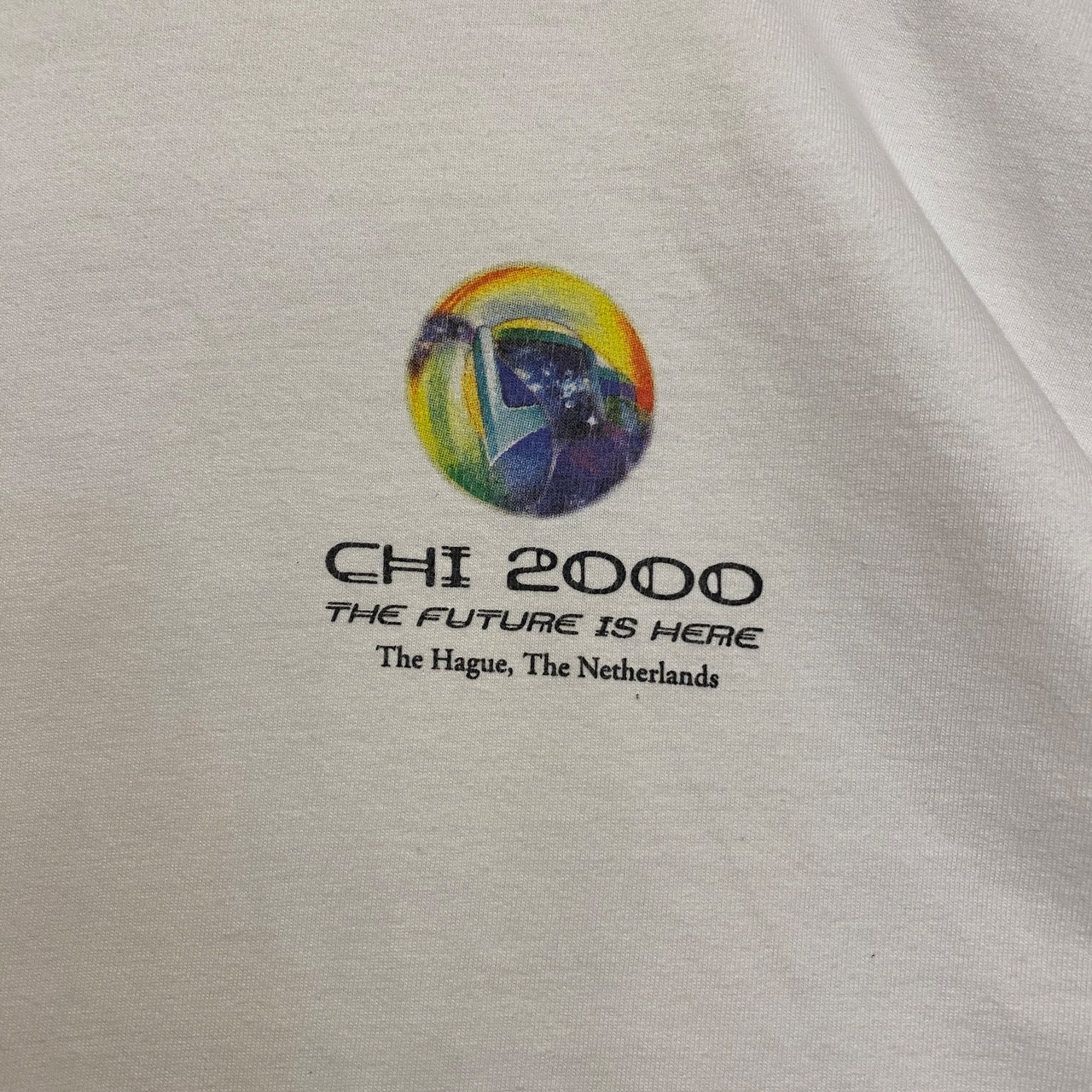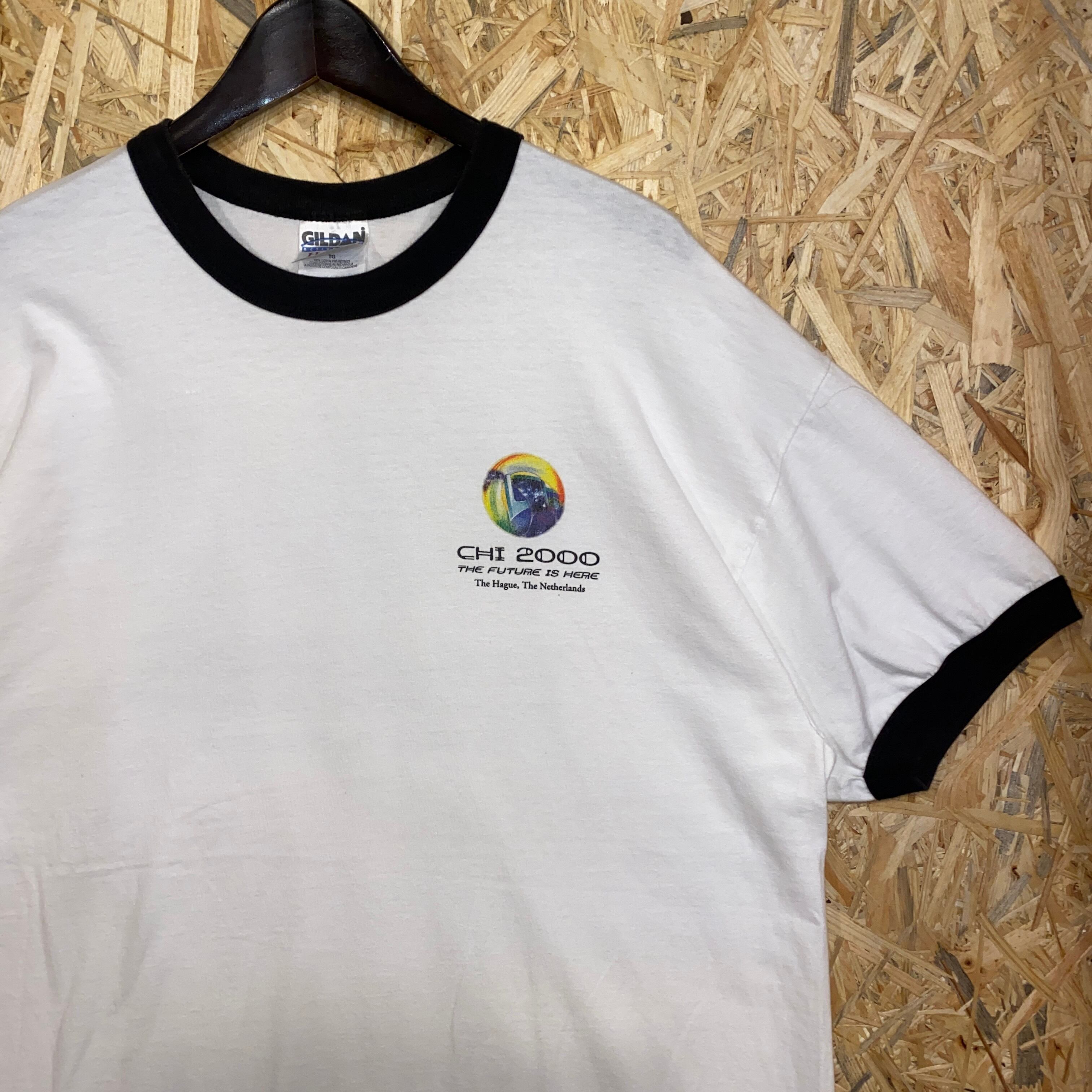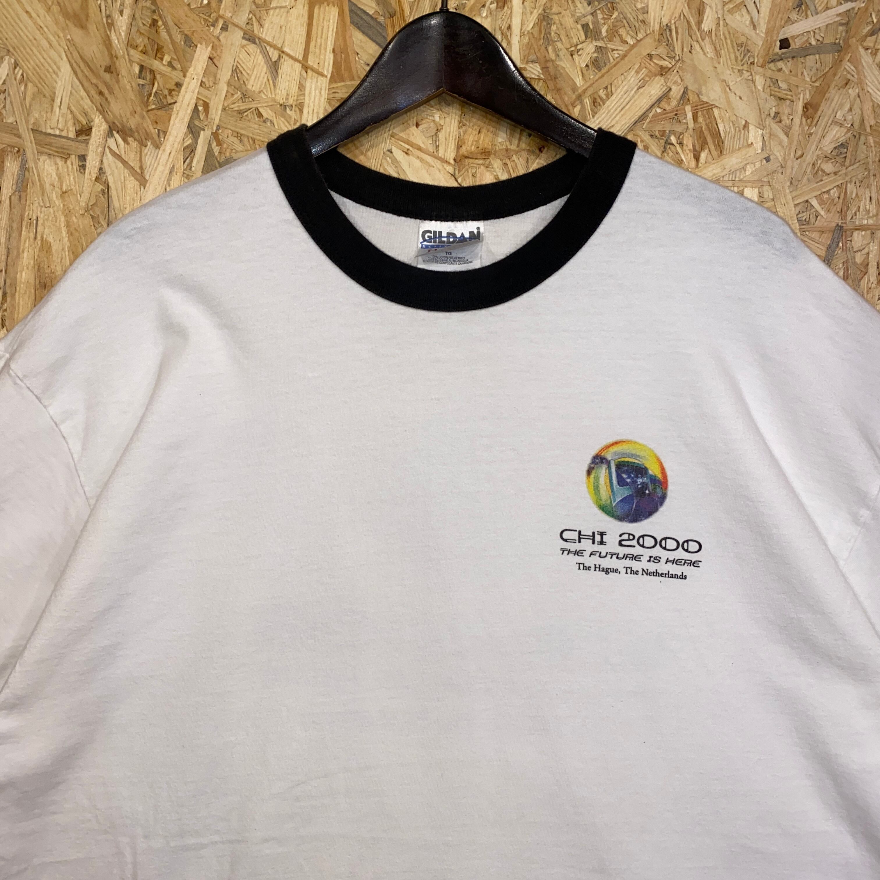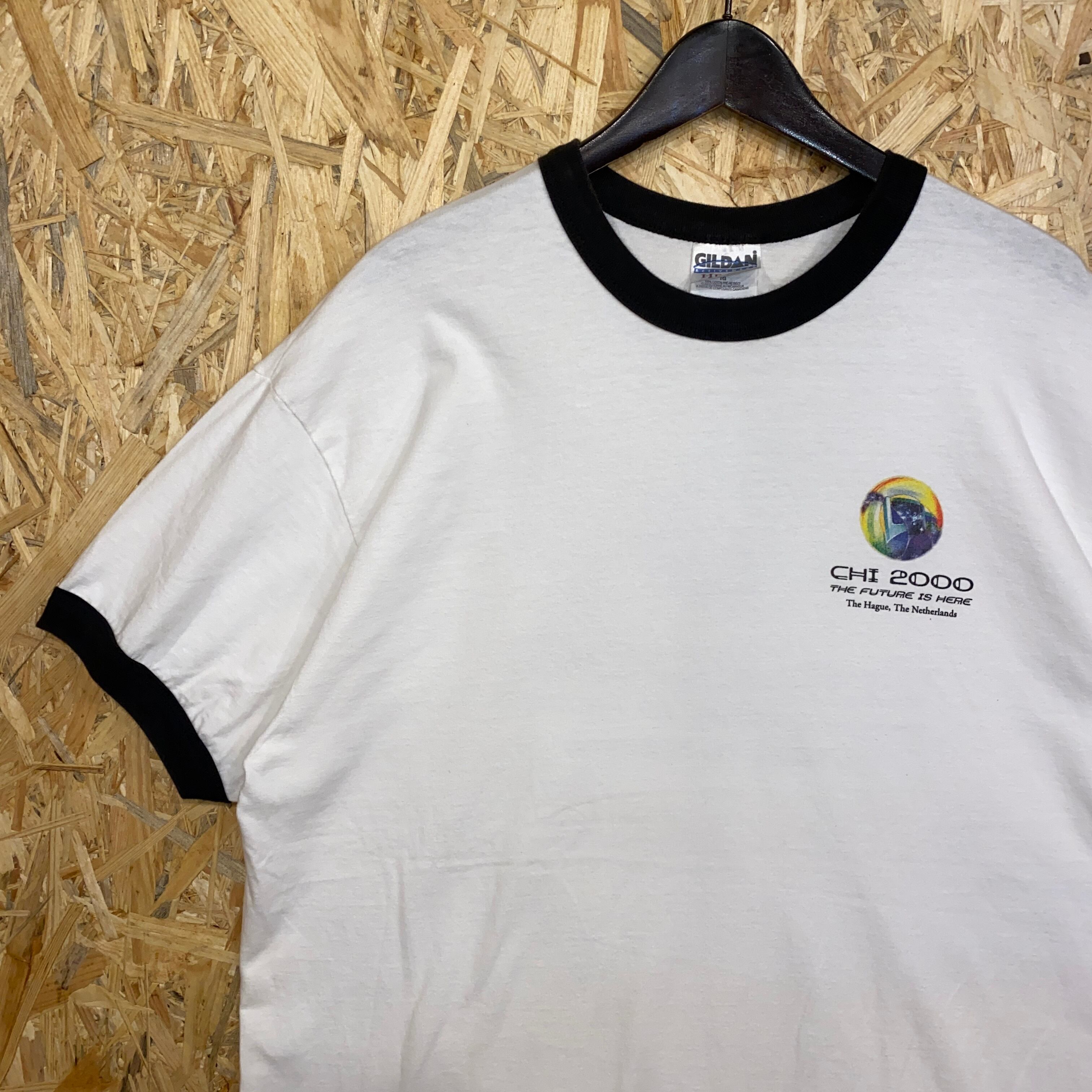 2750 00s 00年代 CHI カンファレンス 記念品 リンガー Tシャツ コンピュータ 人間 オランダ ホワイト 白 GILDAN 古着 メンズvintage